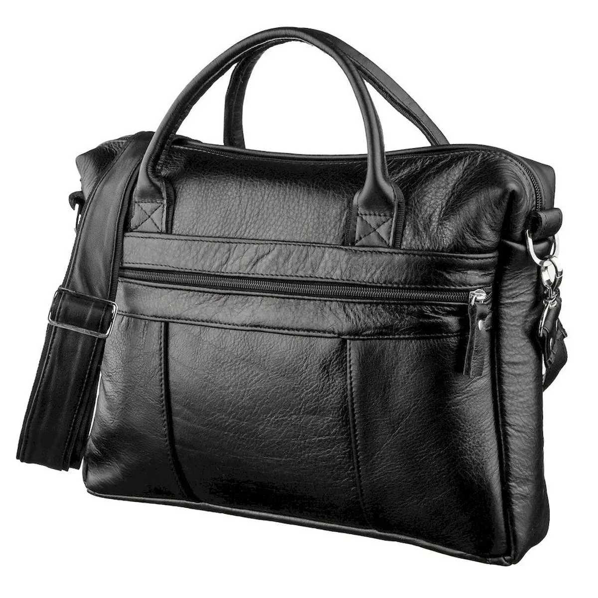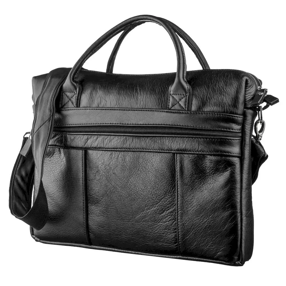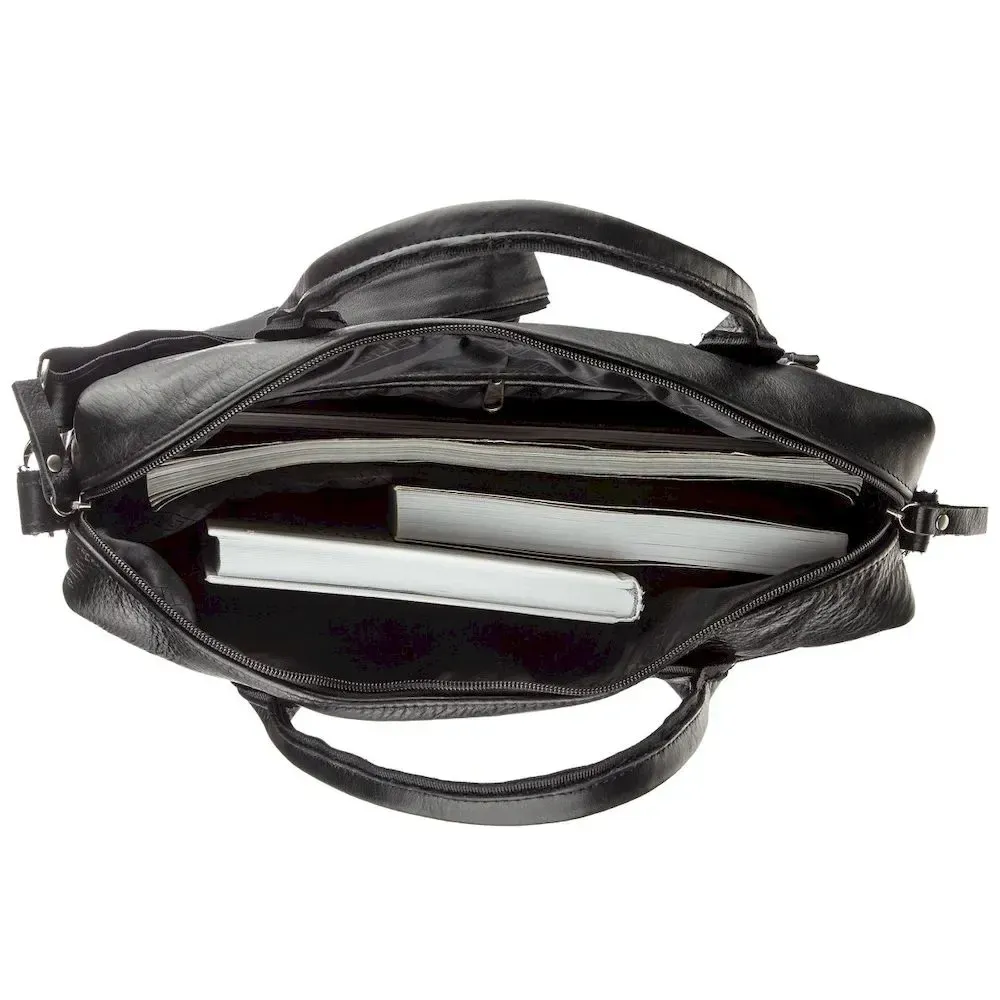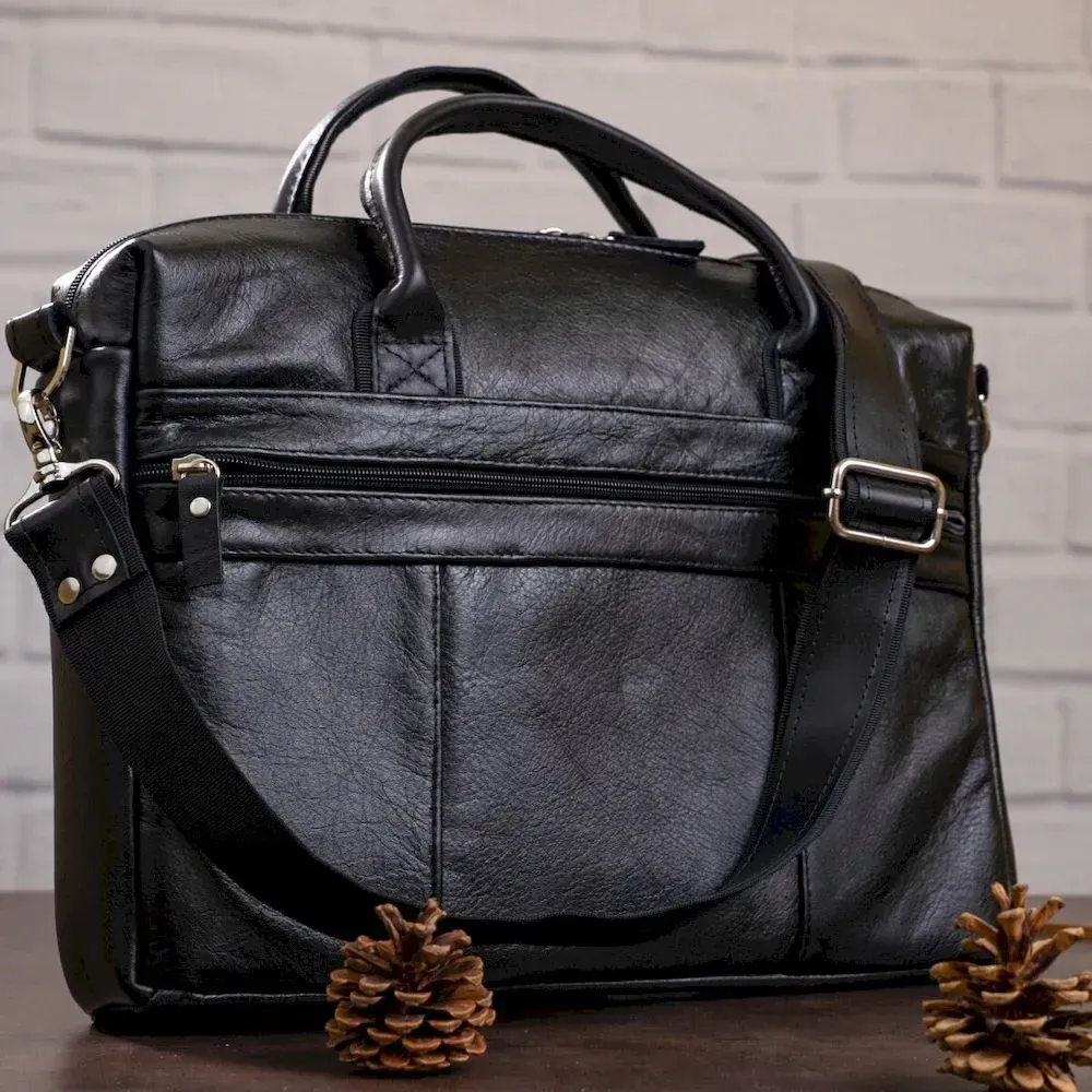 Практична чоловіча сумка з високоякісної натуральної гладкої шкіри м'якої на дотик, чорного кольору. За рахунок того що шкіра м'яка на ній можуть з'являтися складочки, що істотно 100% натуральної шкіри. У сумку поміститься ноутбук діагоналлю 14 дюймів або папка з документами. Сумку можна переносити в руці за допомогою зручних шкіряних ручок, а також через плече. (У комплекті знімний, регульований плечовий ремінь, який виконаний у комбінації текстильного матеріалу та натуральної шкіри). Доповнено сумку міцною фурнітурою кольору срібла.