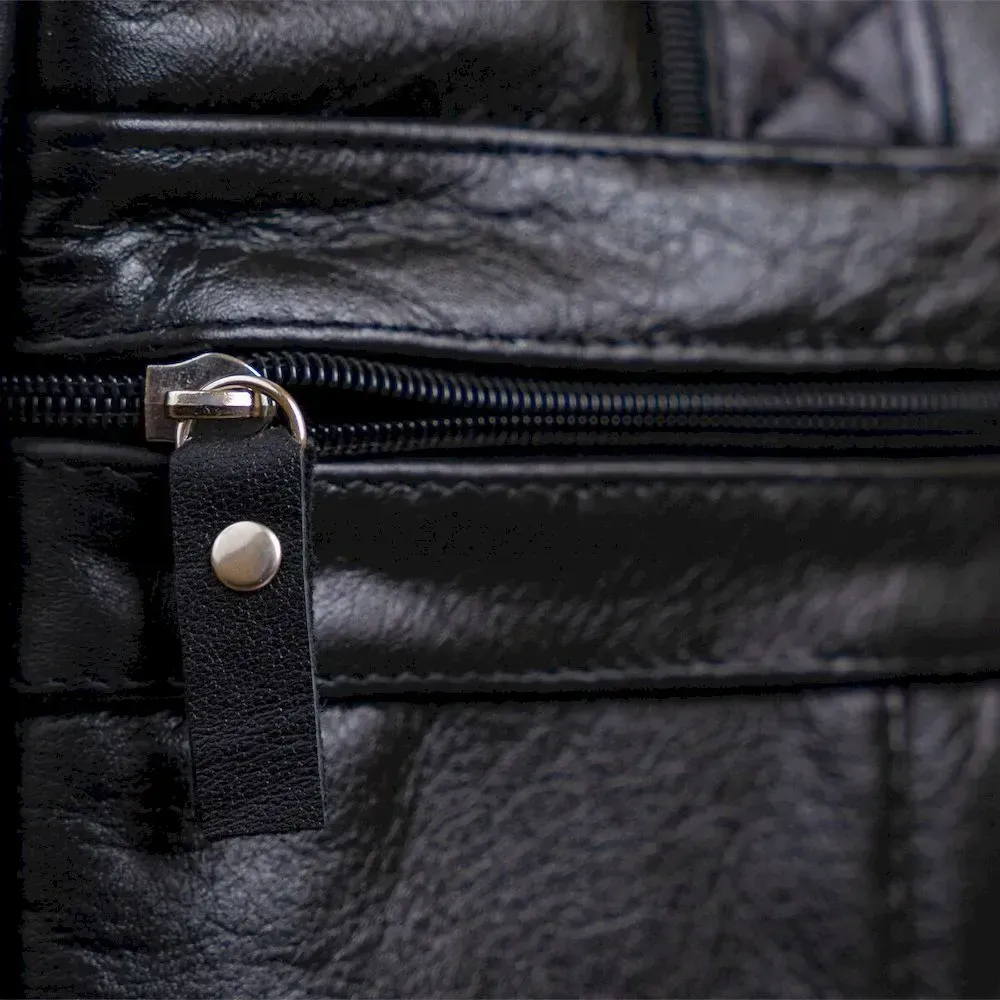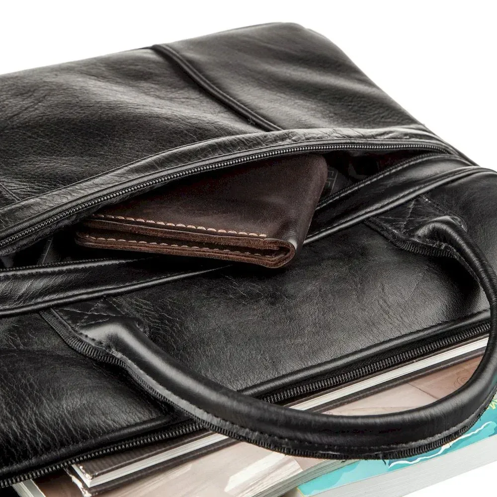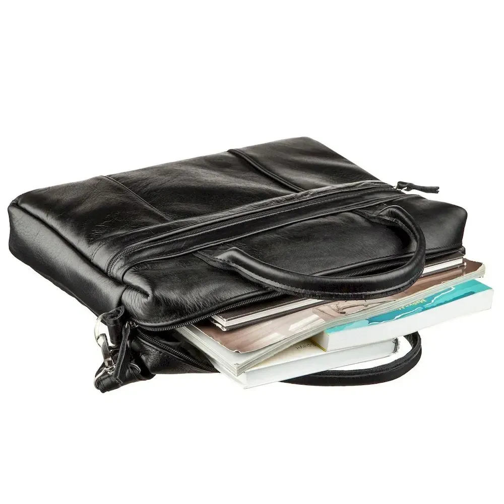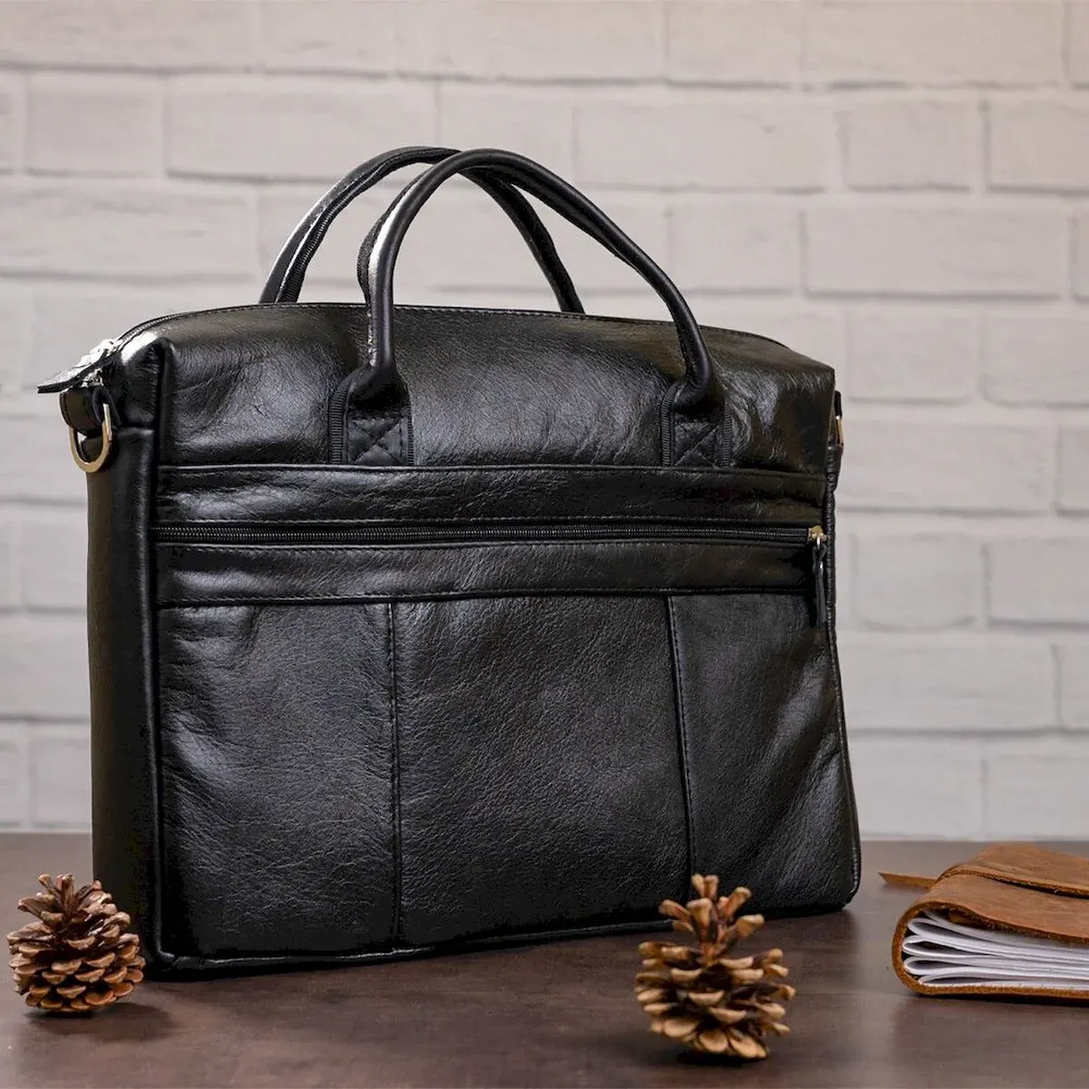 Практична чоловіча сумка з високоякісної натуральної гладкої шкіри м'якої на дотик, чорного кольору. За рахунок того що шкіра м'яка на ній можуть з'являтися складочки, що істотно 100% натуральної шкіри. У сумку поміститься ноутбук діагоналлю 14 дюймів або папка з документами. Сумку можна переносити в руці за допомогою зручних шкіряних ручок, а також через плече. (У комплекті знімний, регульований плечовий ремінь, який виконаний у комбінації текстильного матеріалу та натуральної шкіри). Доповнено сумку міцною фурнітурою кольору срібла.
