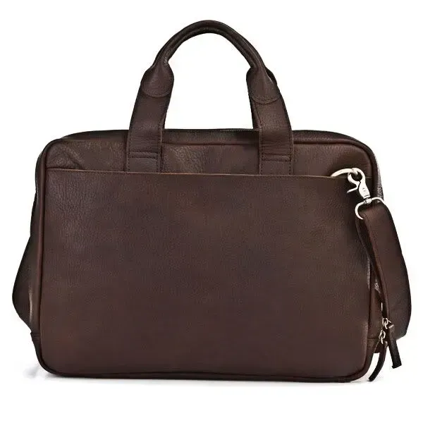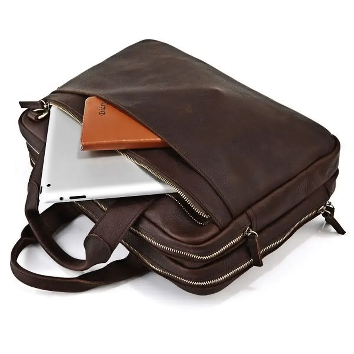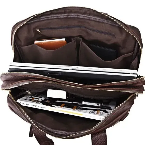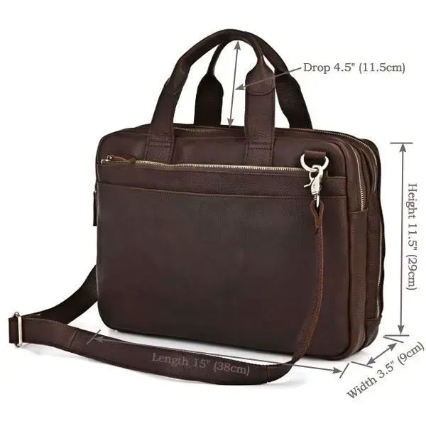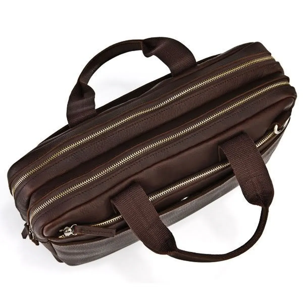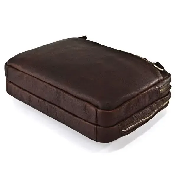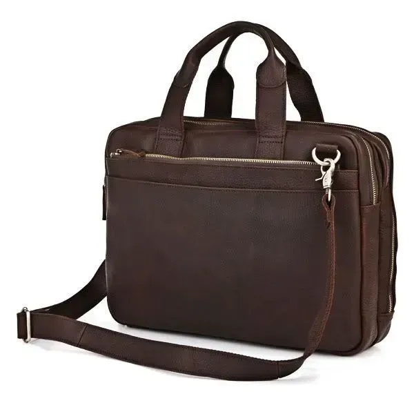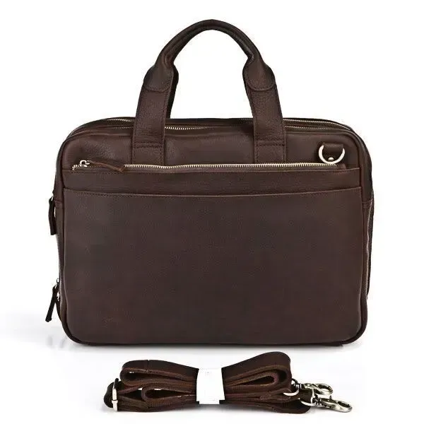 Відмінна шкіряна сумка коричневого кольору. Сумка ідеально поміщають ноутбук із діагоналлю 15 дюймів. Два незалежні відділення на блискавках дозволяють розмістити в одному ноутбук, а в другому все інше. Ця чоловіча шкіряна сумка під ноутбук розрахована на повсякденне використання і зможе стати вірним супутником ділового чоловіка.