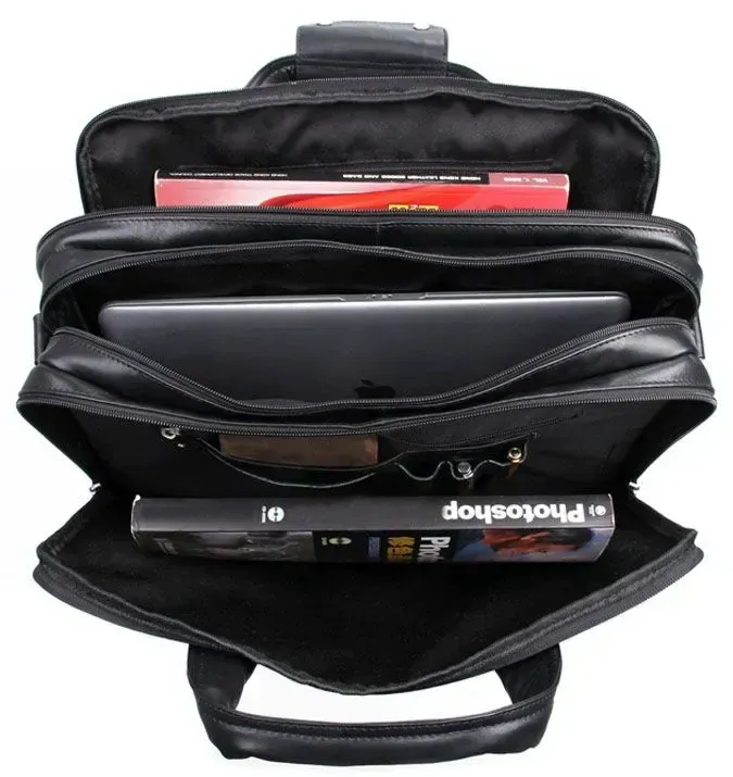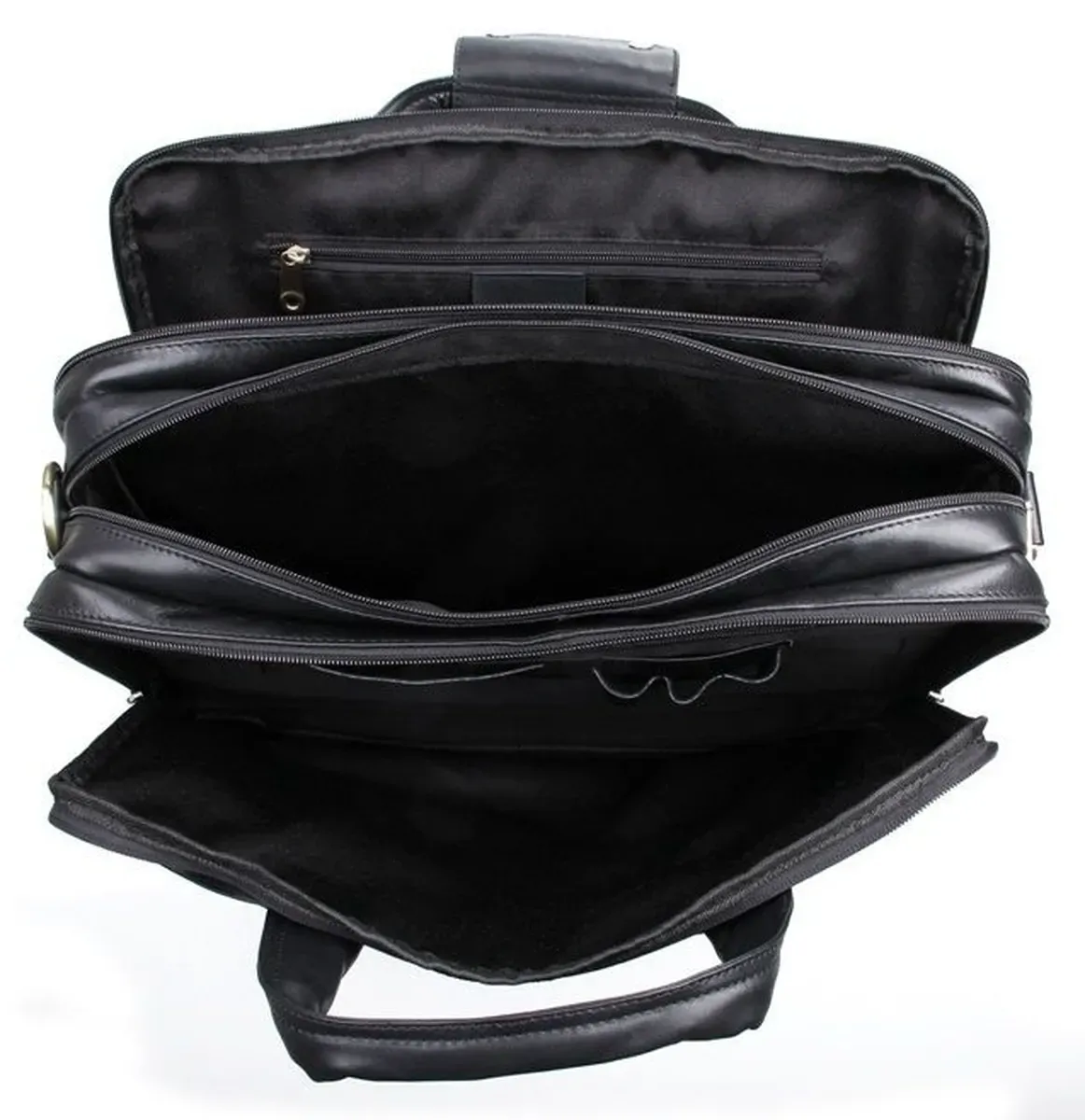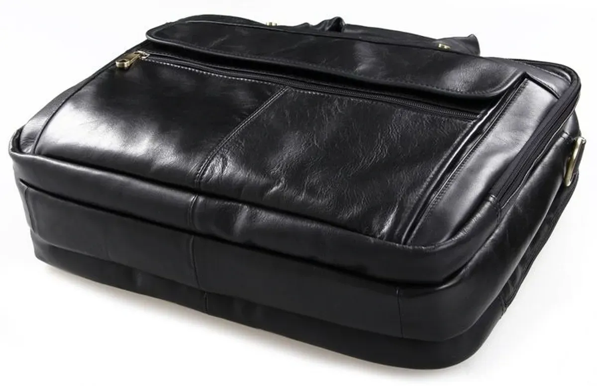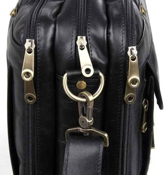 Містка чоловіча багатофункціональна сумка для ноутбука. Аксесуар виконаний з гладкої натуральної шкіри приємної на дотик. Колір фурнітури: латунь. На лицьовій стороні виробу розташована накладна кишеня під клапаном та невелике відділення на блискавці. На задній зовнішній стороні знаходиться кишеня на блискавці. Підкладка виконана із міцного текстильного чорного кольору. Сумку можна переносити в руці (ручки шкіряні) або через плече (в комплекті знімний, регульований плечовий ремінь). Аксесуар має три автономні відділення, які закриваються блискавками.