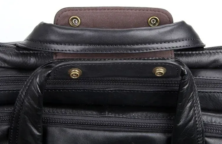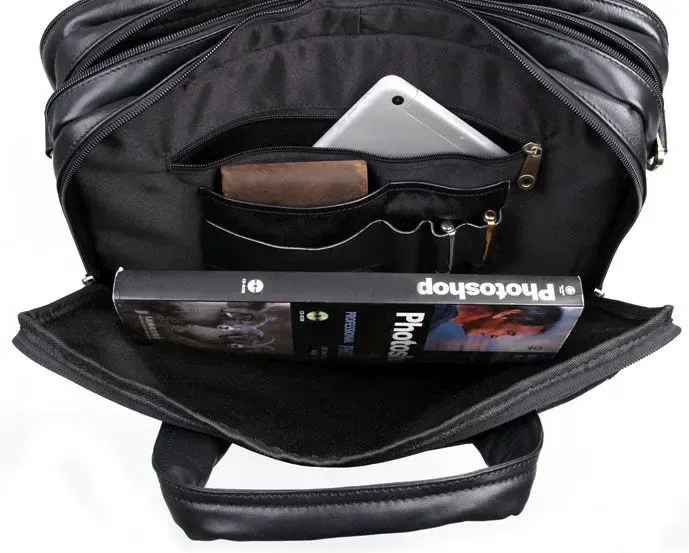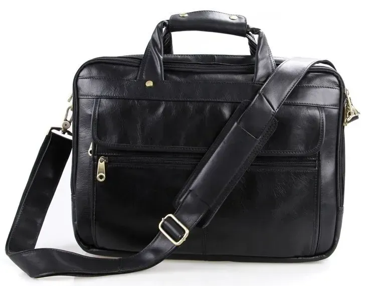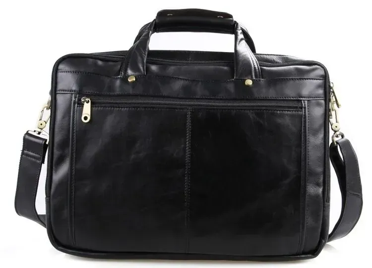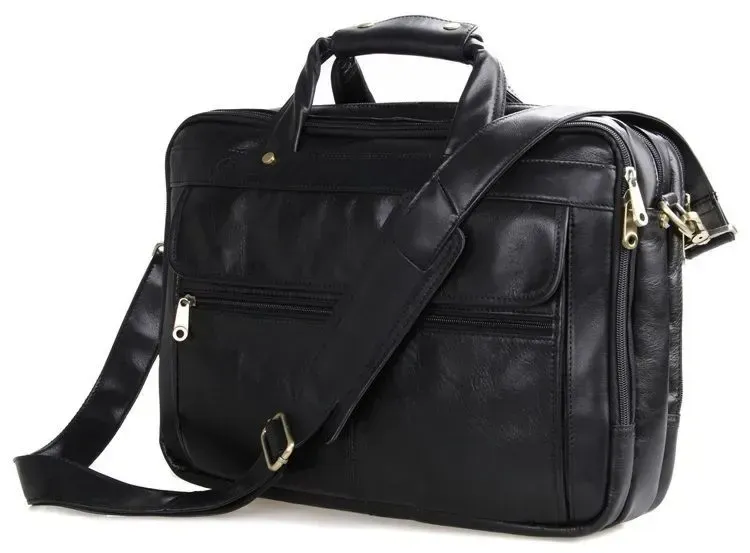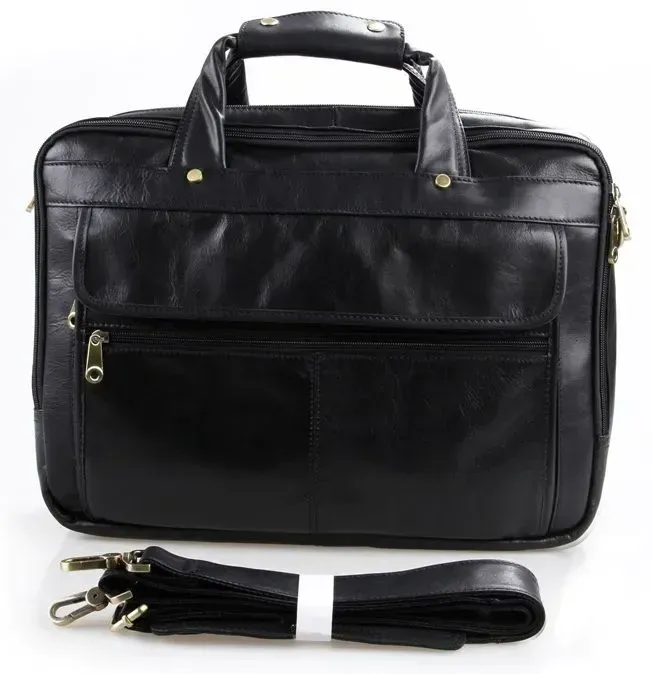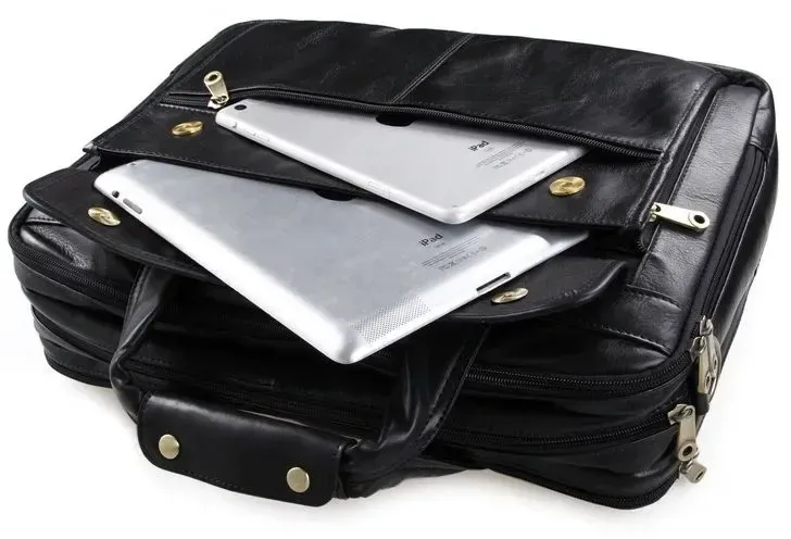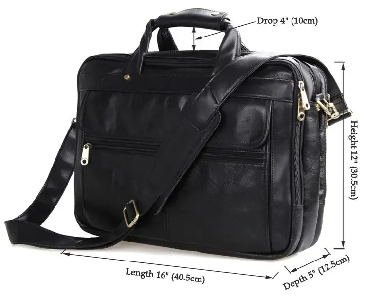 Містка чоловіча багатофункціональна сумка для ноутбука. Аксесуар виконаний з гладкої натуральної шкіри приємної на дотик. Колір фурнітури: латунь. На лицьовій стороні виробу розташована накладна кишеня під клапаном та невелике відділення на блискавці. На задній зовнішній стороні знаходиться кишеня на блискавці. Підкладка виконана із міцного текстильного чорного кольору. Сумку можна переносити в руці (ручки шкіряні) або через плече (в комплекті знімний, регульований плечовий ремінь). Аксесуар має три автономні відділення, які закриваються блискавками.