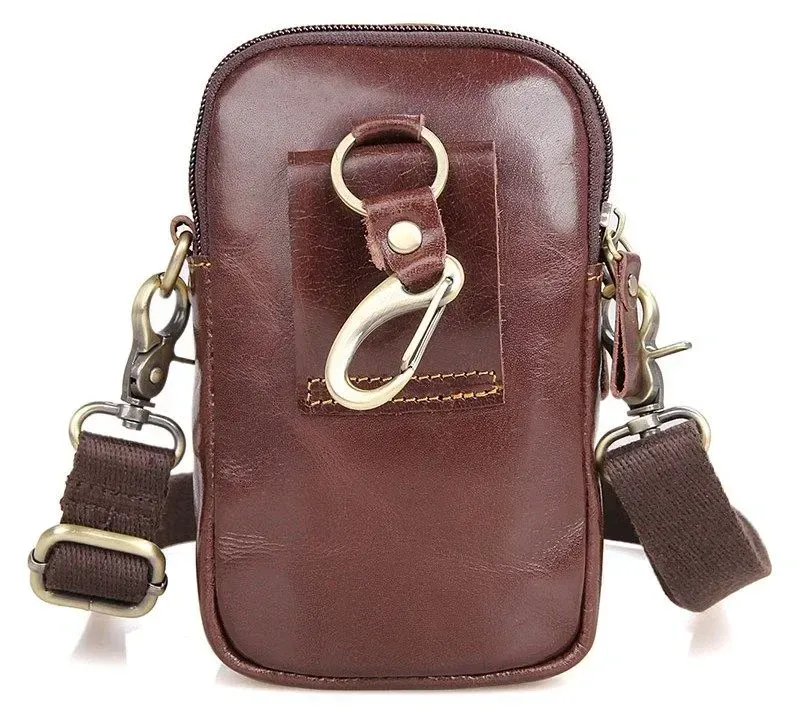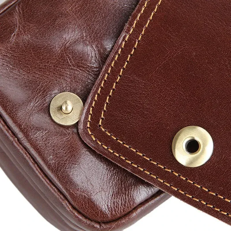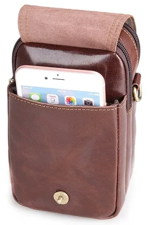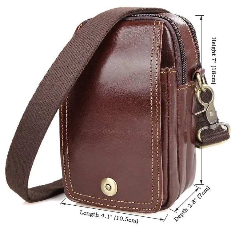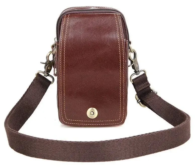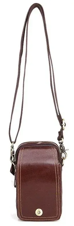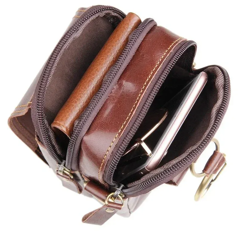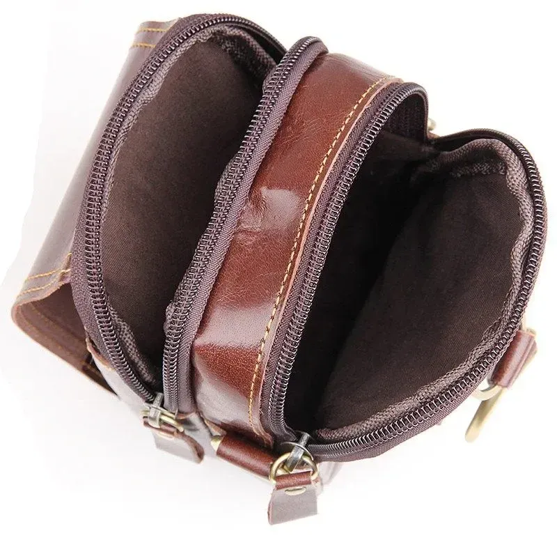Надійна сумка невеликих розмірів. Аксесуар виконаний із натуральної шкіри високої якості. Колір фурнітури: латунь. Сумка акуратно прошита світло-коричневою ниткою. Під шкіряним клапаном розташована накладна кишеня для швидкого доступу. Сумку можна переносити через плече, на поясному ремені, а також чіпляти за допомогою карабіна. Аксесуар має два основні відділення, які закриваються блискавками. Сумка упакована в текстильний чохол білого кольору.
