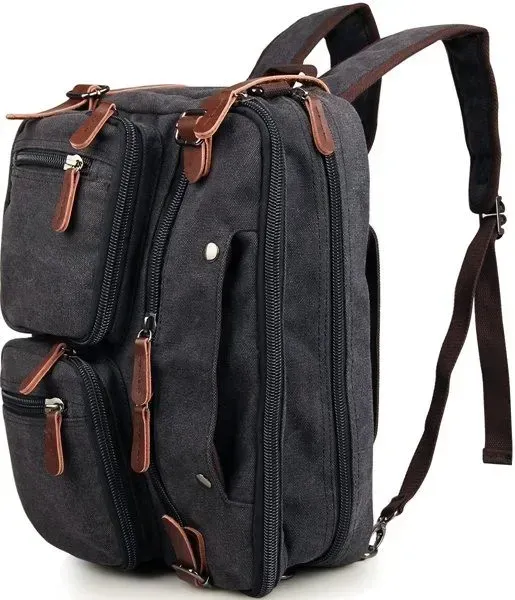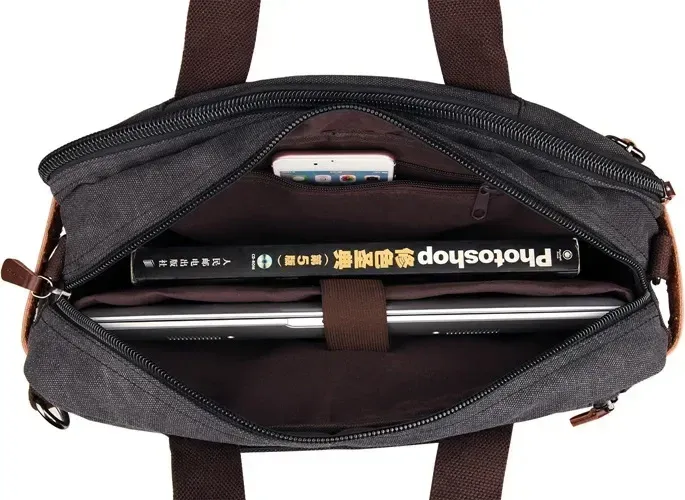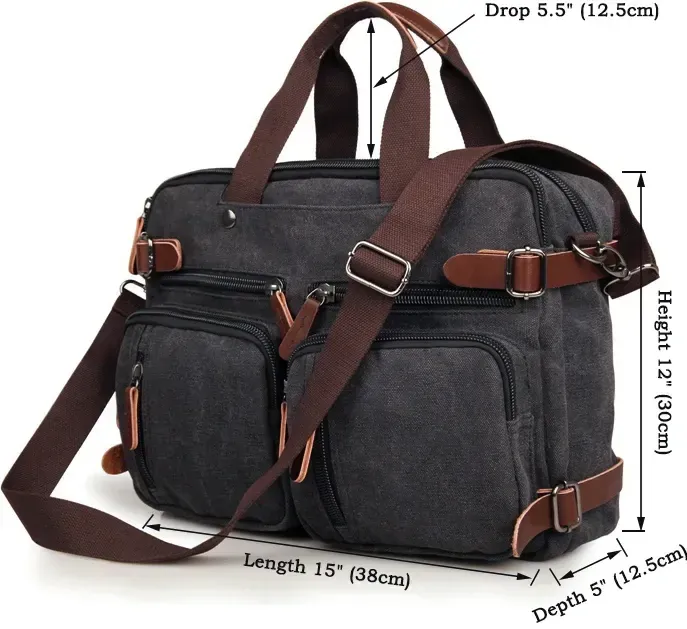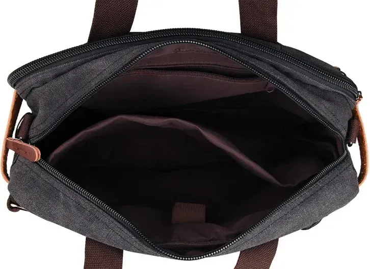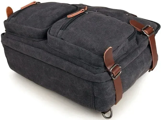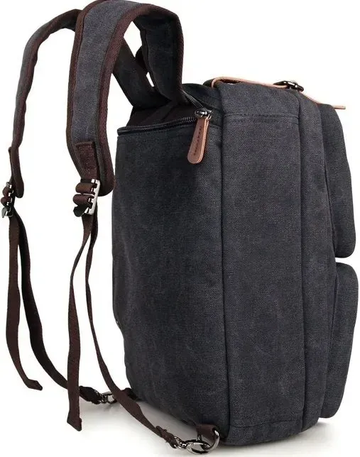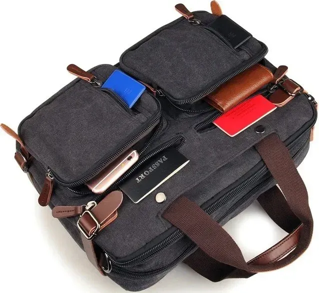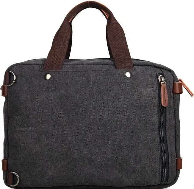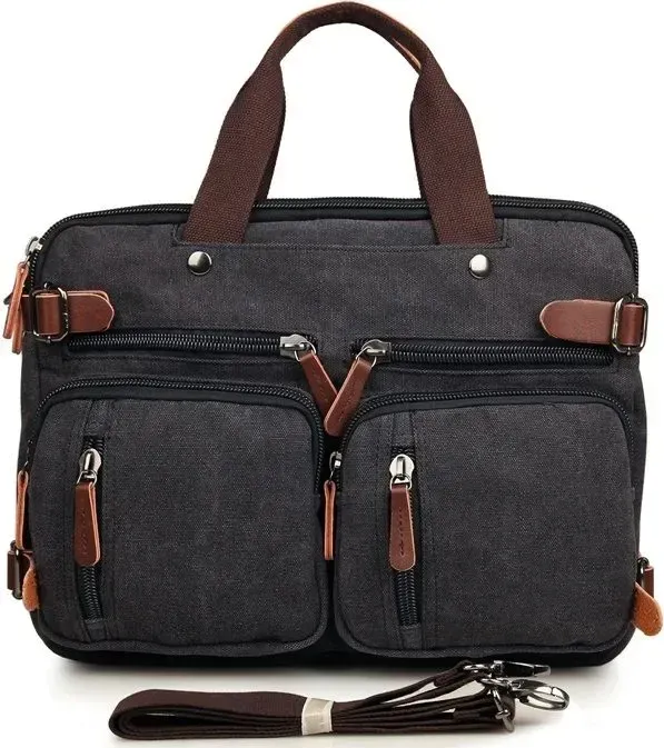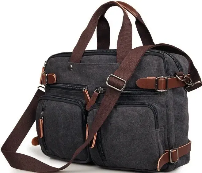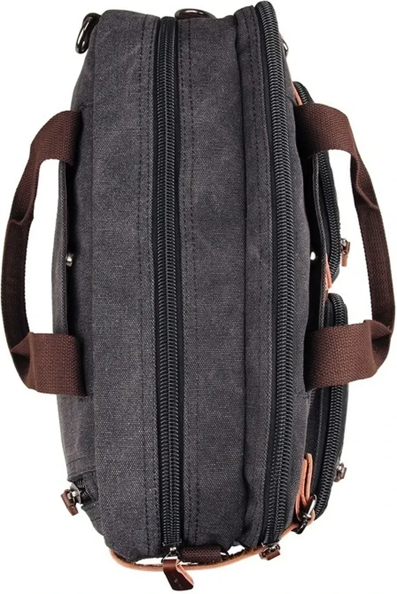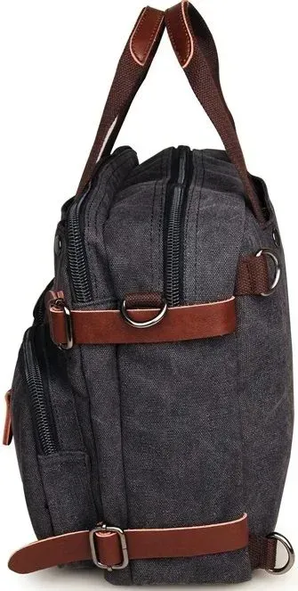 Містка чоловіча сумка-трансформер з міцної тканини. Виріб складається з двох великих відділень, які закриваються на надійні товсті блискавки. У першому відділенні знаходиться відділення з м'якою перегородкою для 15-дюймового ноутбука, а також потайна кишеня змійці. У другому відділенні дві невеликі кишені під гаманець і телефон. Зовні сумки розташовано 6 маленьких кишень на блискавках. На тильній стороні прорізна кишеня на блискавці (куди ховаються ремені з рюкзака). Маленькі ручки для носіння в руках також ховаються в прорізні кишені з обох боків і закриваються на магніти.