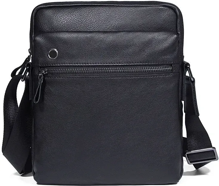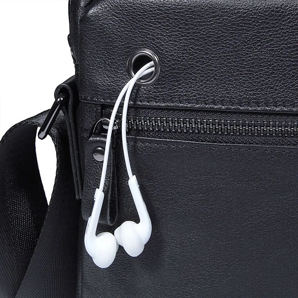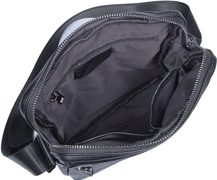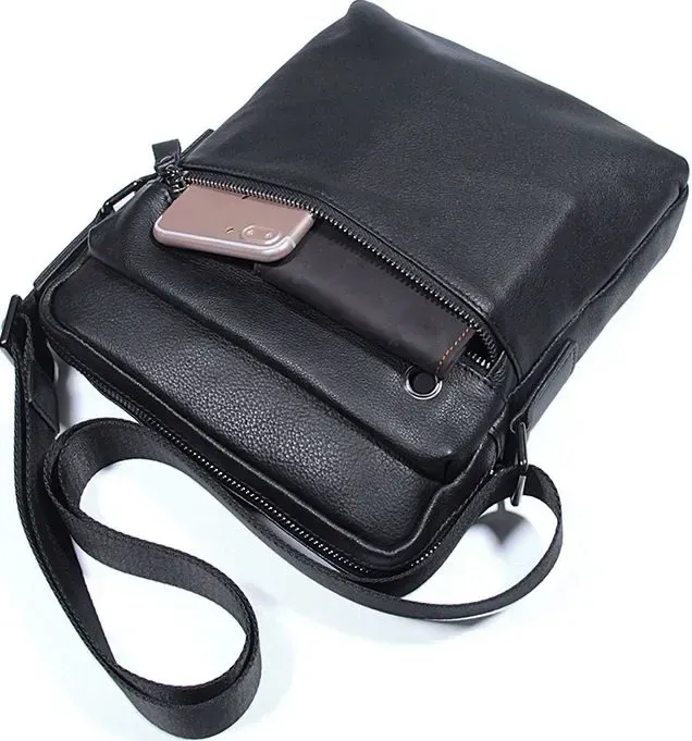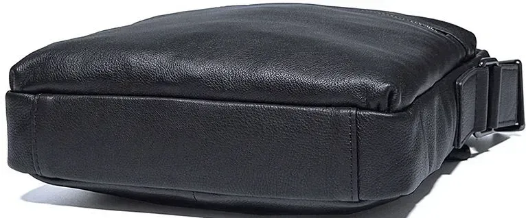 Оригінальна сумка із міцної якісної телячої шкіри. Сумка має середні розміри, і поміщає все необхідне для чоловіка на кожен день. У ній знайдеться місце телефону, планшету, гаманцю, зарядки та інші необхідні речі. Особливістю даної моделі є слот для навушників, що дає можливість слухати музику, не виймаючи плеєр або телефон із сумки. Чорний колір шкіри та текстилю в цьому виробі успішно відтінюється металевими елементами кольору темного срібла. pt; text-align:justify">