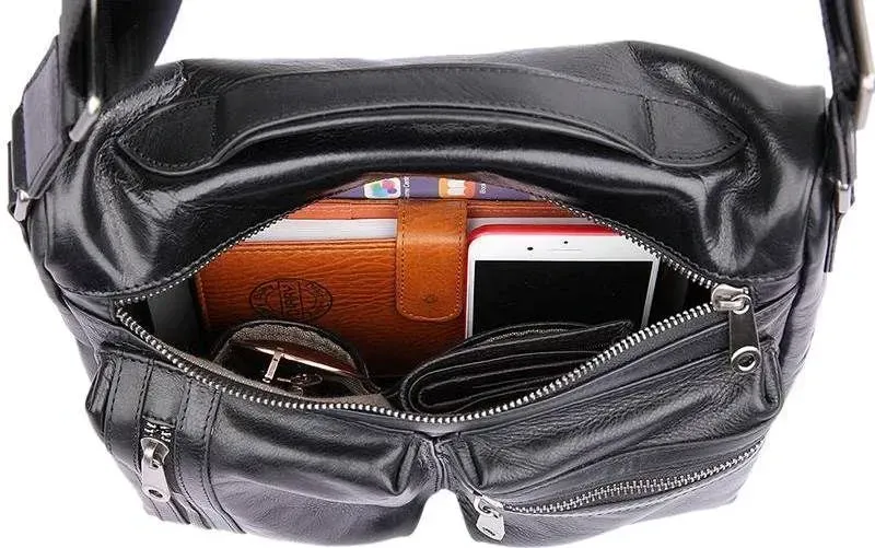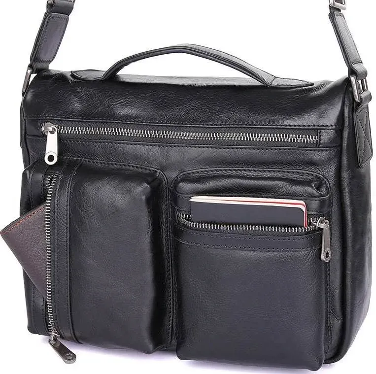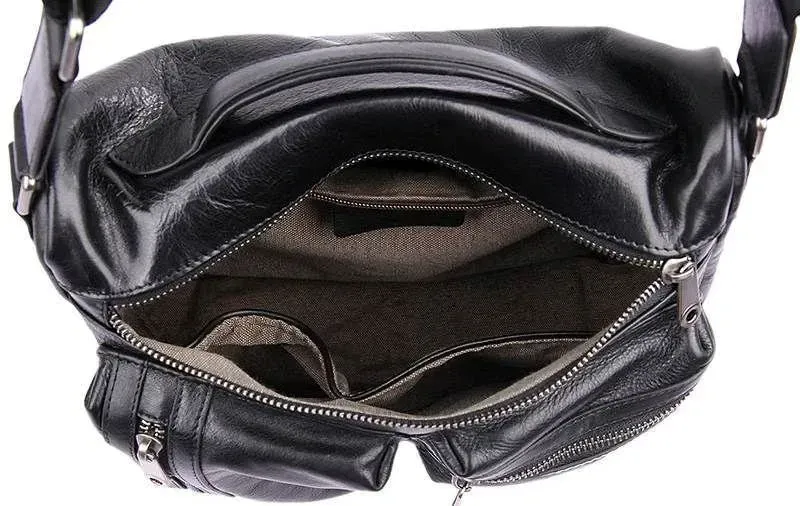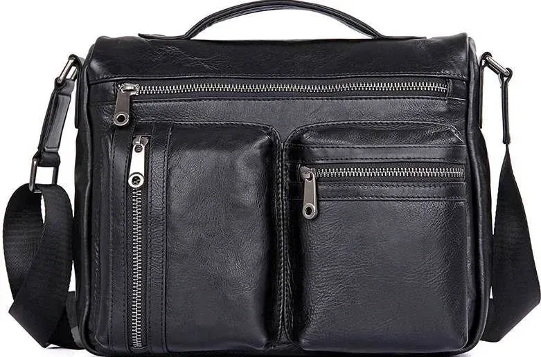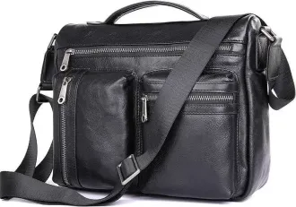Містка шкіряна сумка чорного кольору, із натуральної високоякісної шкіри. Колір фурнітури: срібло. На лицьовій стороні розташовані дві накладні кишені на блискавках. На задній зовнішній стороні даної моделі знаходиться одна горизонтальна кишеня на блискавці. Аксесуар має одне основне відділення на блискавці, в якому знаходиться одна прихована кишеня на змійці і дві невеликі накладні кишені. Носиться цей аксесуар у руці за допомогою надійної шкіряної ручки та через плече за допомогою регульованого текстильного ременя. Підкладка виконана з міцного текстильного матеріалу чорного кольору. Аксесуар поставляється в текстильному чохлі білого кольору.