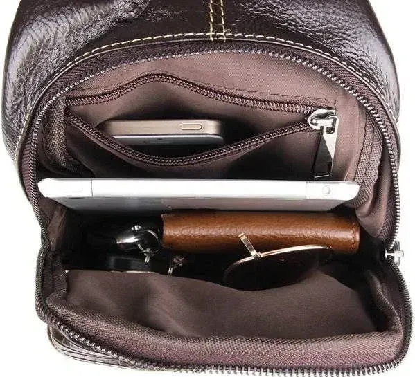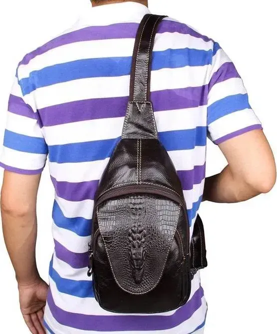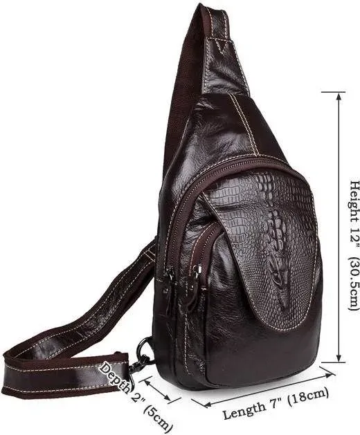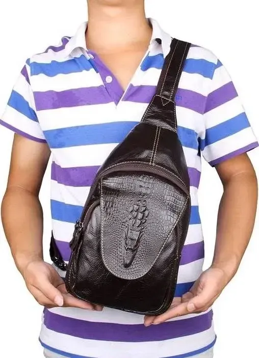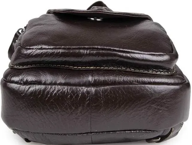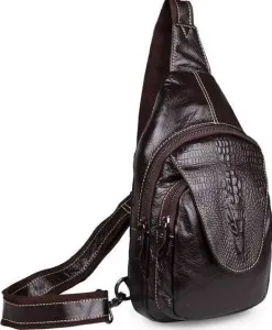 Оригінальна шкіряна сумка-рюкзак коричневого кольору, з натуральної шкіри, яку можна рівною мірою, як чоловікам, так і жінкам. Колір фурнітури: латунь. На лицьовій стороні розташована накладна кишеня, що закривається на блискавку та клапан на магніті. Оригінальність цієї моделі надає клапан, який виготовлений з натуральної шкіри з фактурою під крокодила. На задній зовнішній стороні даної моделі знаходиться одна вертикальна кишеня на блискавці. Аксесуар має одне основне відділення на блискавці, в якому знаходиться одна прихована кишеня на змійці. Підкладка виконана із міцного текстильного матеріалу коричневого кольору. Аксесуар постачається в текстильному пилозахисному чохлі білого кольору.