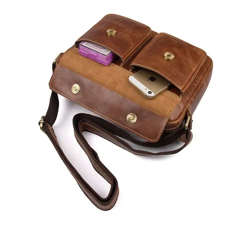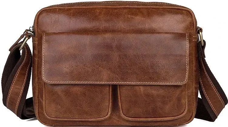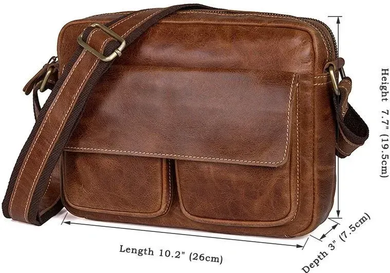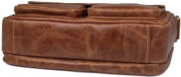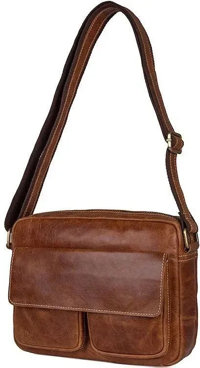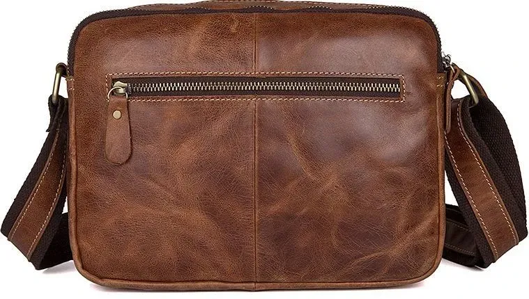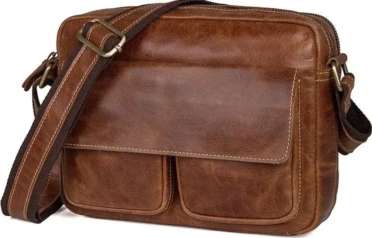 Шкіряна компактна чоловіча сумка з натуральної шкіри. Колір фурнітури: латунь. Носитися ця модель через плече за допомогою регульованого плечового ременя. На задній зовнішній стороні розташована кишеня на блискавці. Аксесуар постачається в текстильному пилозахисному чохлі білого кольору.
