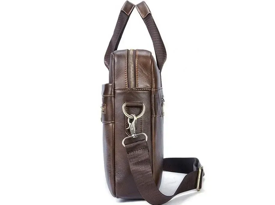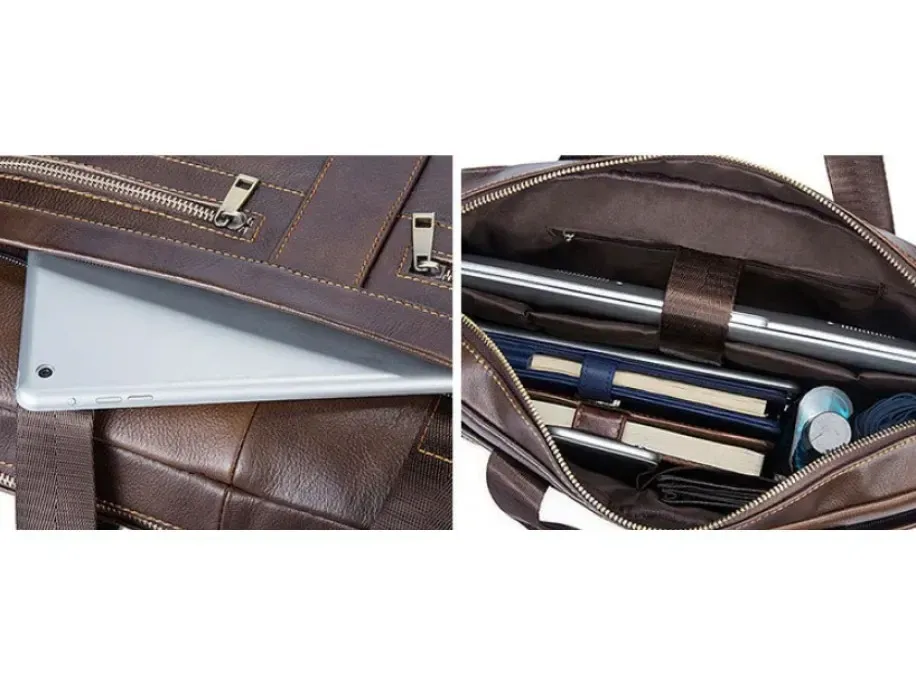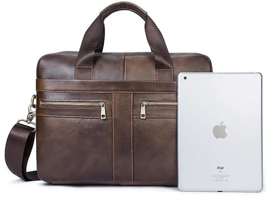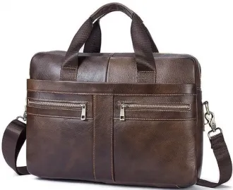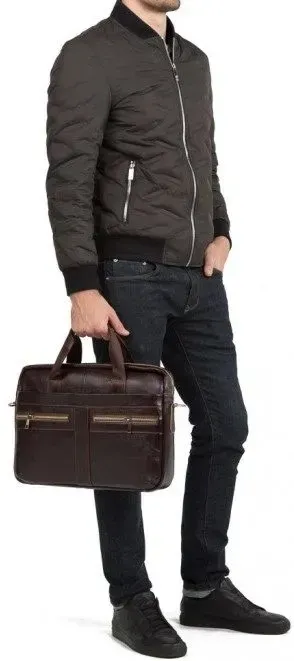 Коричнева багатофункціональна чоловіча сумка з відділенням для невеликого ноутбука 15”, а також документів формату А4. Аксесуар виконаний із натуральної зернистої шкіри коричневого кольору. На лицьовій стороні даного виробу розташовано одне відділення та дві кишені на металевих блискавках. На задній зовнішній стороні знаходиться ще одне відділення на блискавці. Сумку можна переносити в руці за допомогою зручних шкіряних ручок, а також через плече (у комплекті знімний плечовий ремінь, що регулюється, який виконаний з текстильного матеріалу). Колір фурнітури: латунь.
