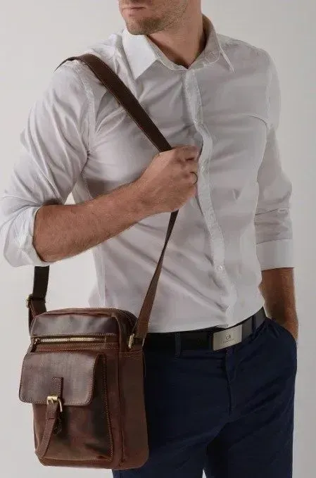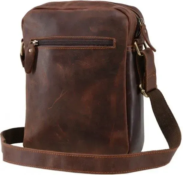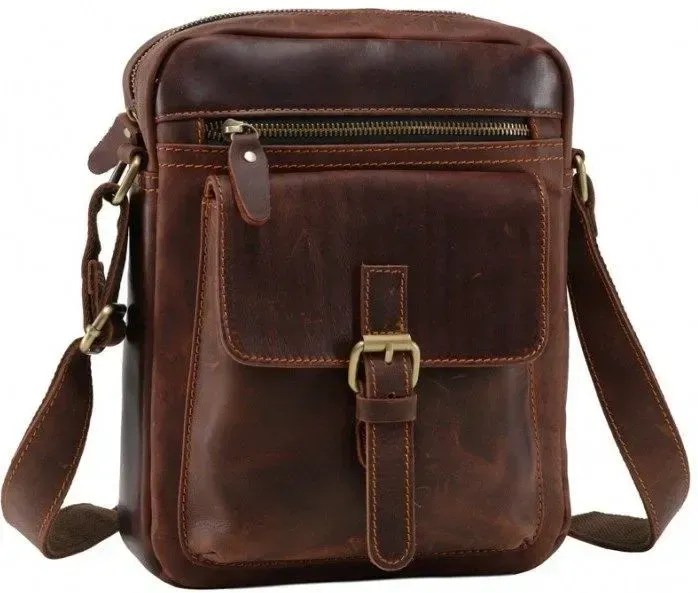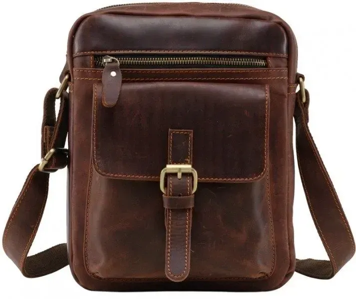 Сучасна чоловіча сумка через плече. Аксесуар виконаний із натуральної високоякісної гладкої шкіри. Колір фурнітури: латунь. Сумка надійно прошита міцною коричневою ниткою. Шви – рівні, акуратні. Чудовий варіант для подарунка рідним та близьким людям.