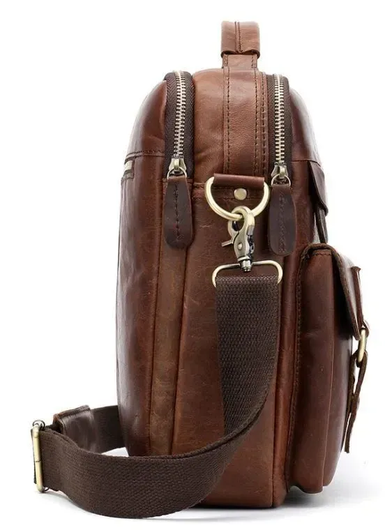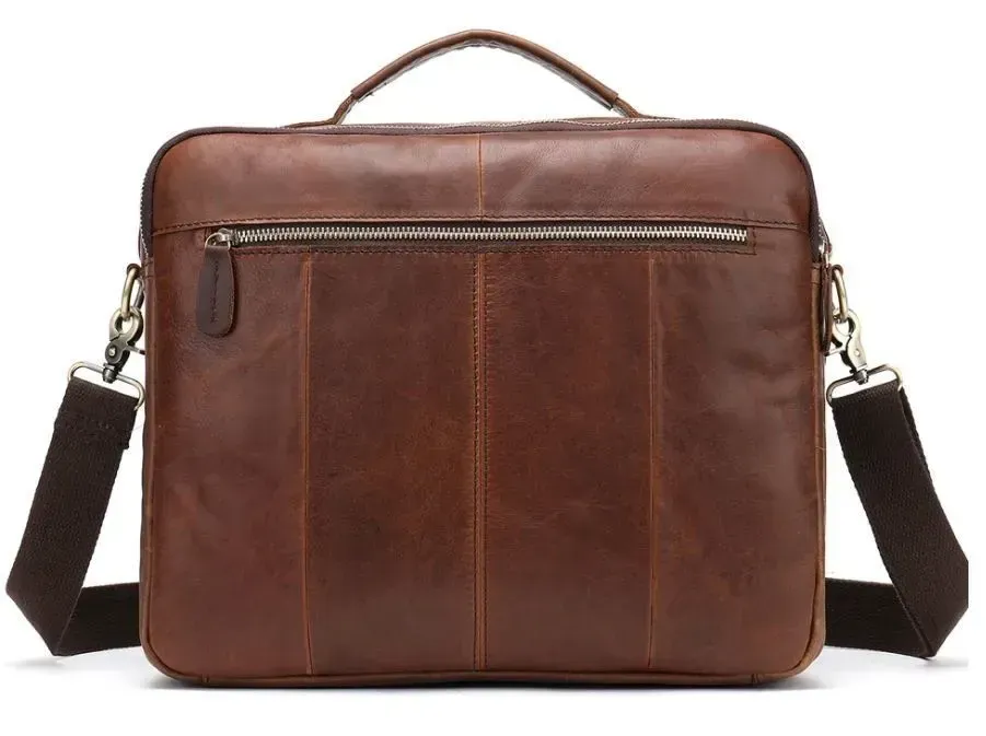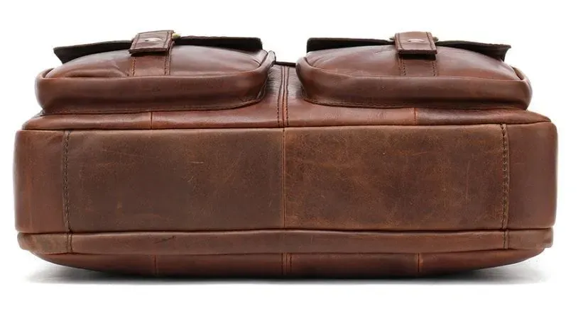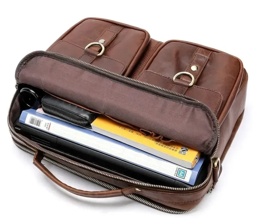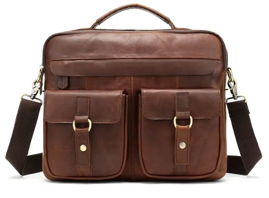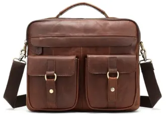 Солідна сумка-портфель для зайнятих та стильних чоловіків, щоб документи були завжди під рукою. Аксесуар доповнений золотистою фурнітурою та прошитий коричневою ниткою. Модель можна носити як за шкіряну ручку, так і за допомогою ремінця на плече. Усередині міцна текстильна підкладка коричневого кольору. У догляді модель не вибаглива і довго гасає. Буде ідеальним варіантом для подарунка близькій людині. Аксесуар упакований у тканинний мішок.