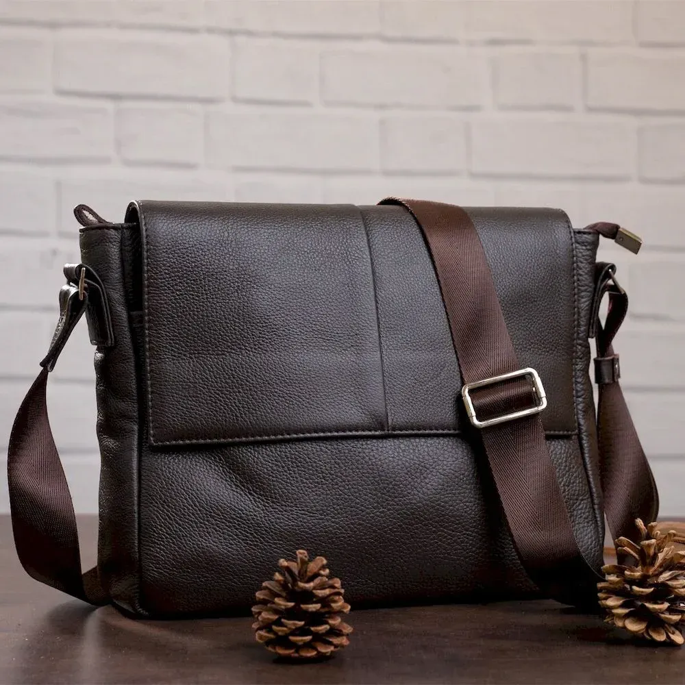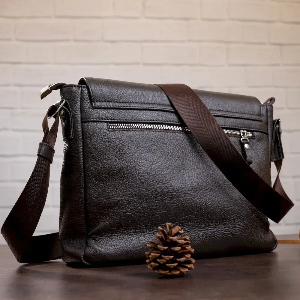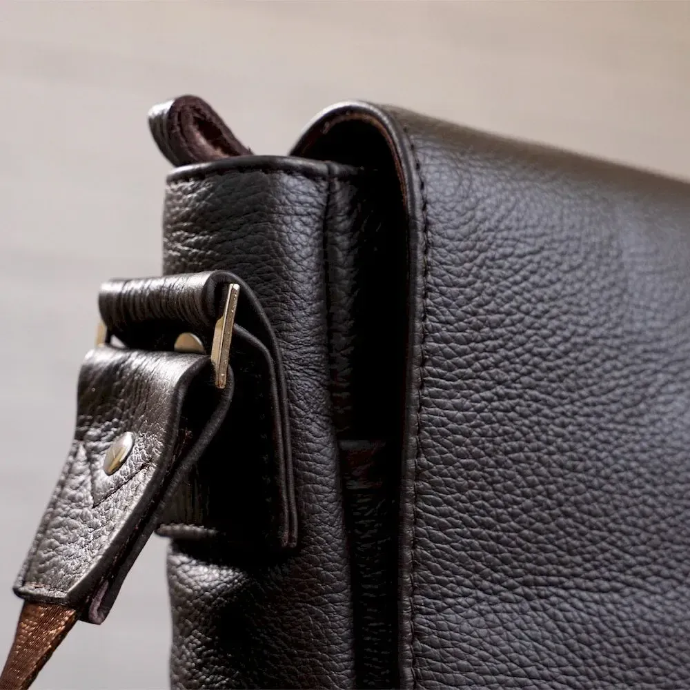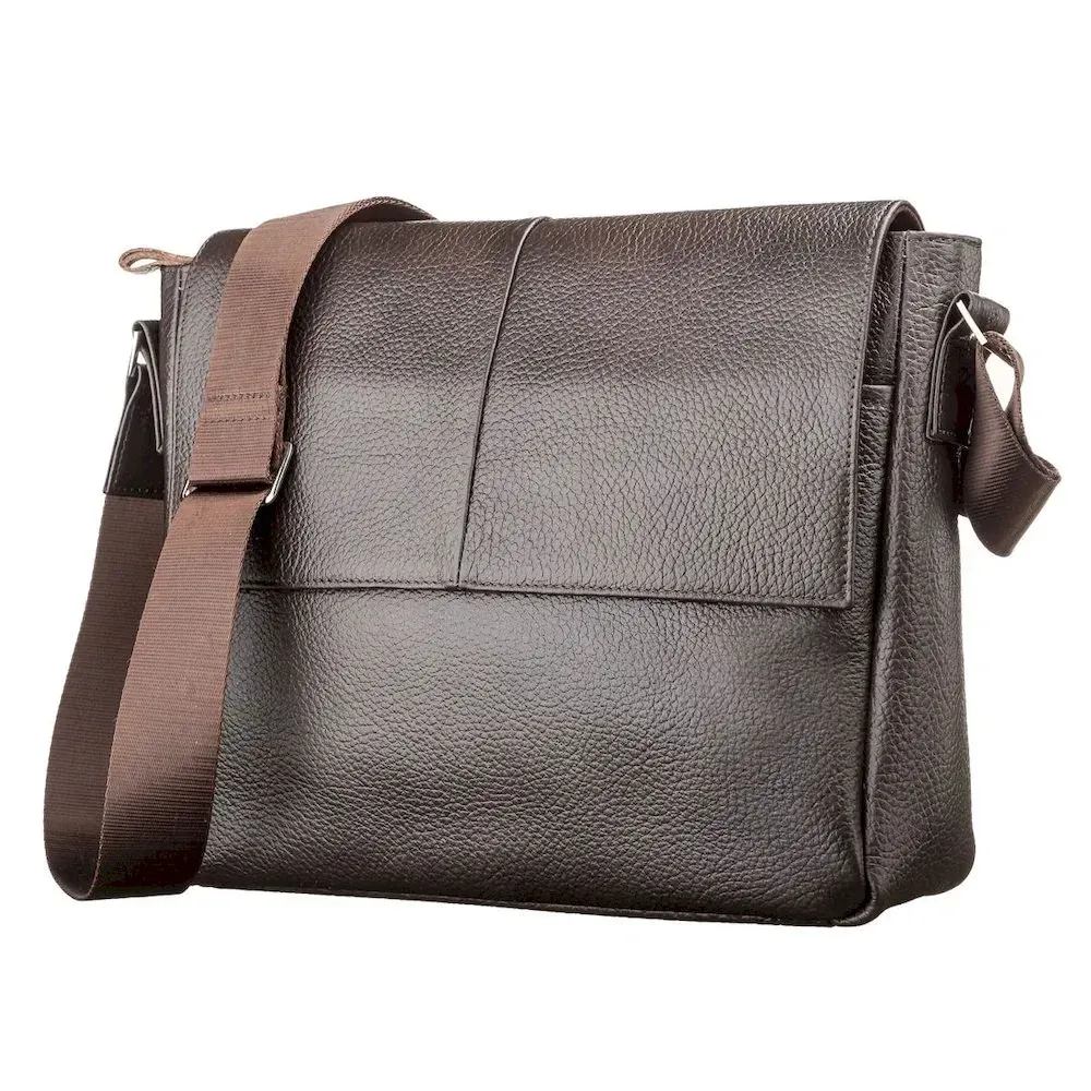 Оригинальная коричневая сумка из натуральной кожи, которая приглянется Вам своим стильным видом. Сумка изготовлена в черно-коричневом цвете и дополнена прочным текстильным черным ремнем, который регулируется и позволяет носить изделие на плече или через плечо.