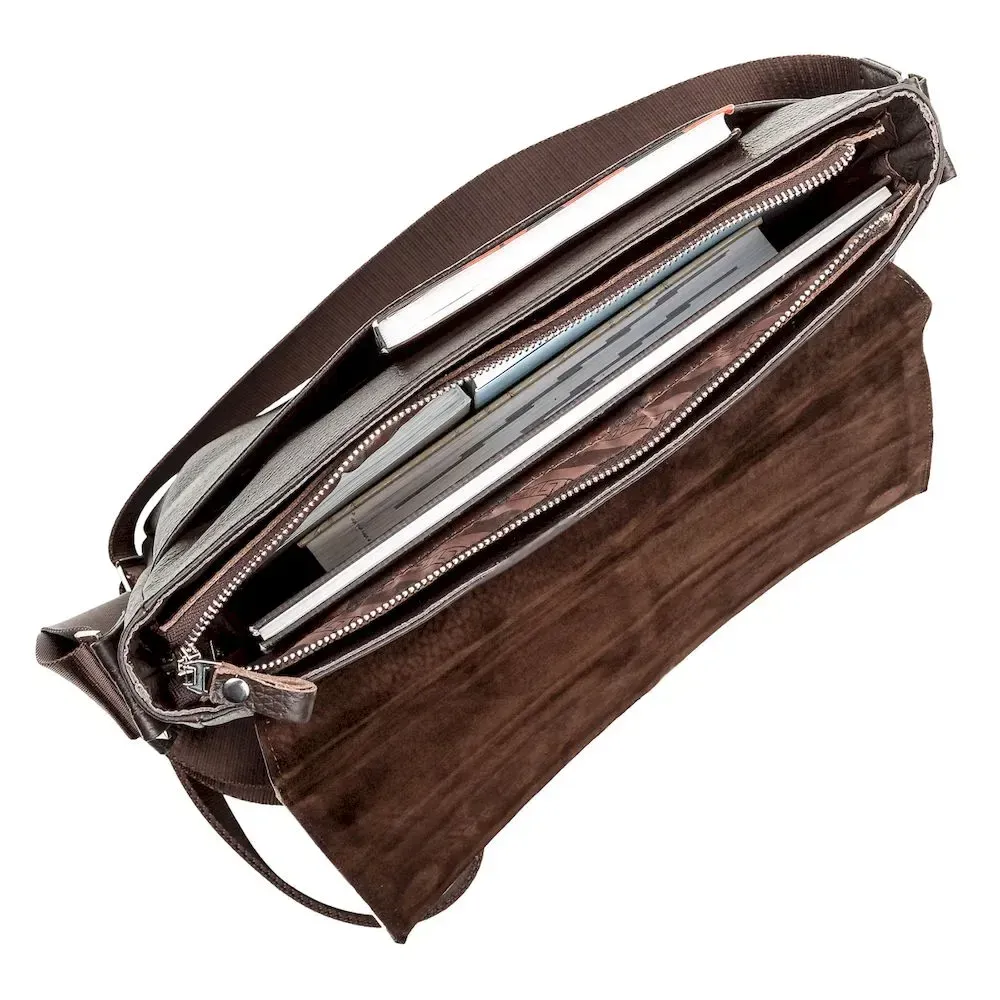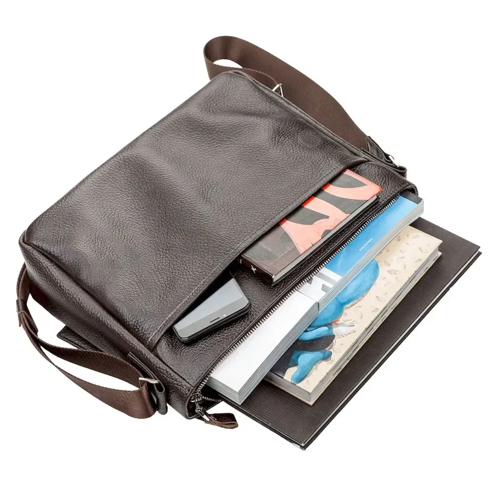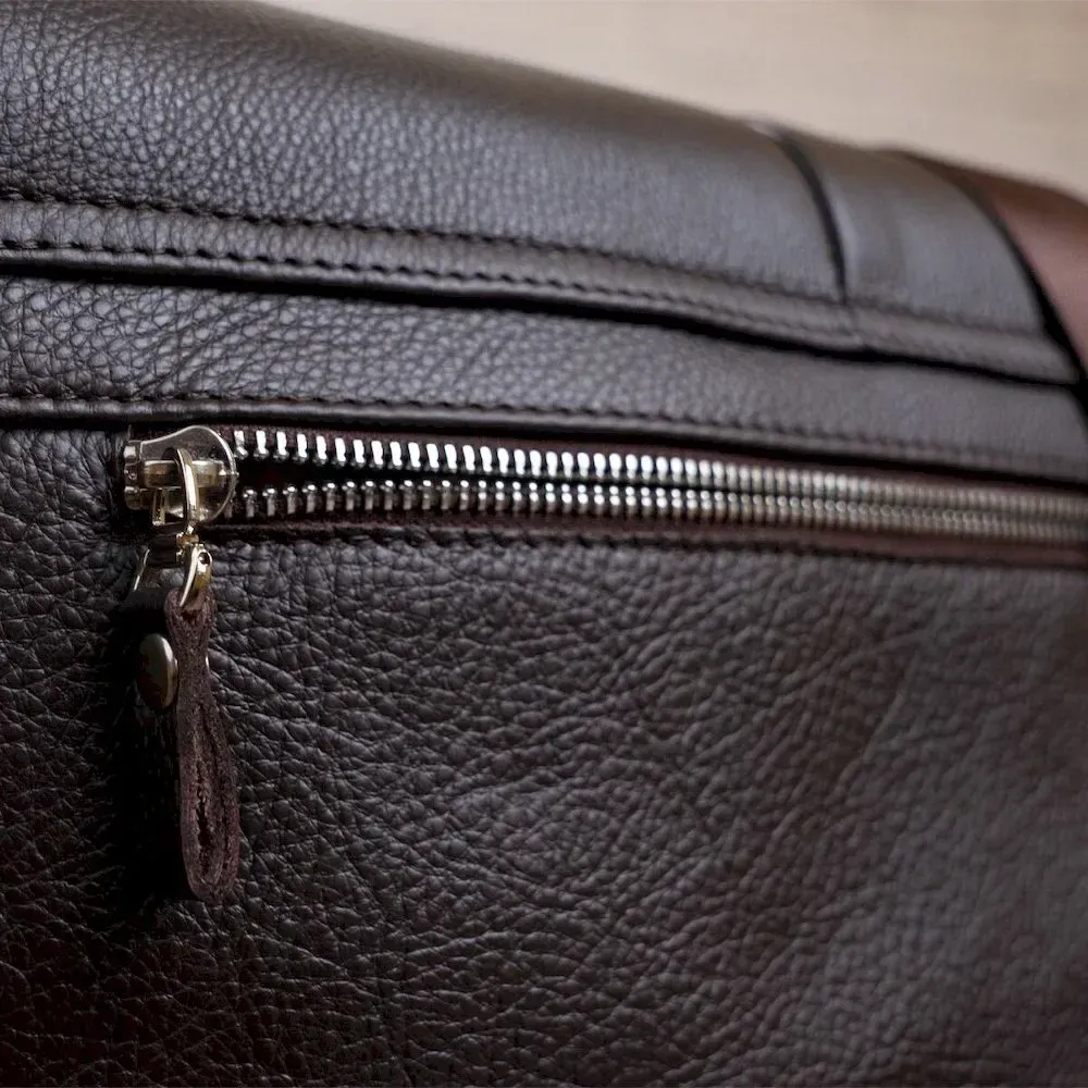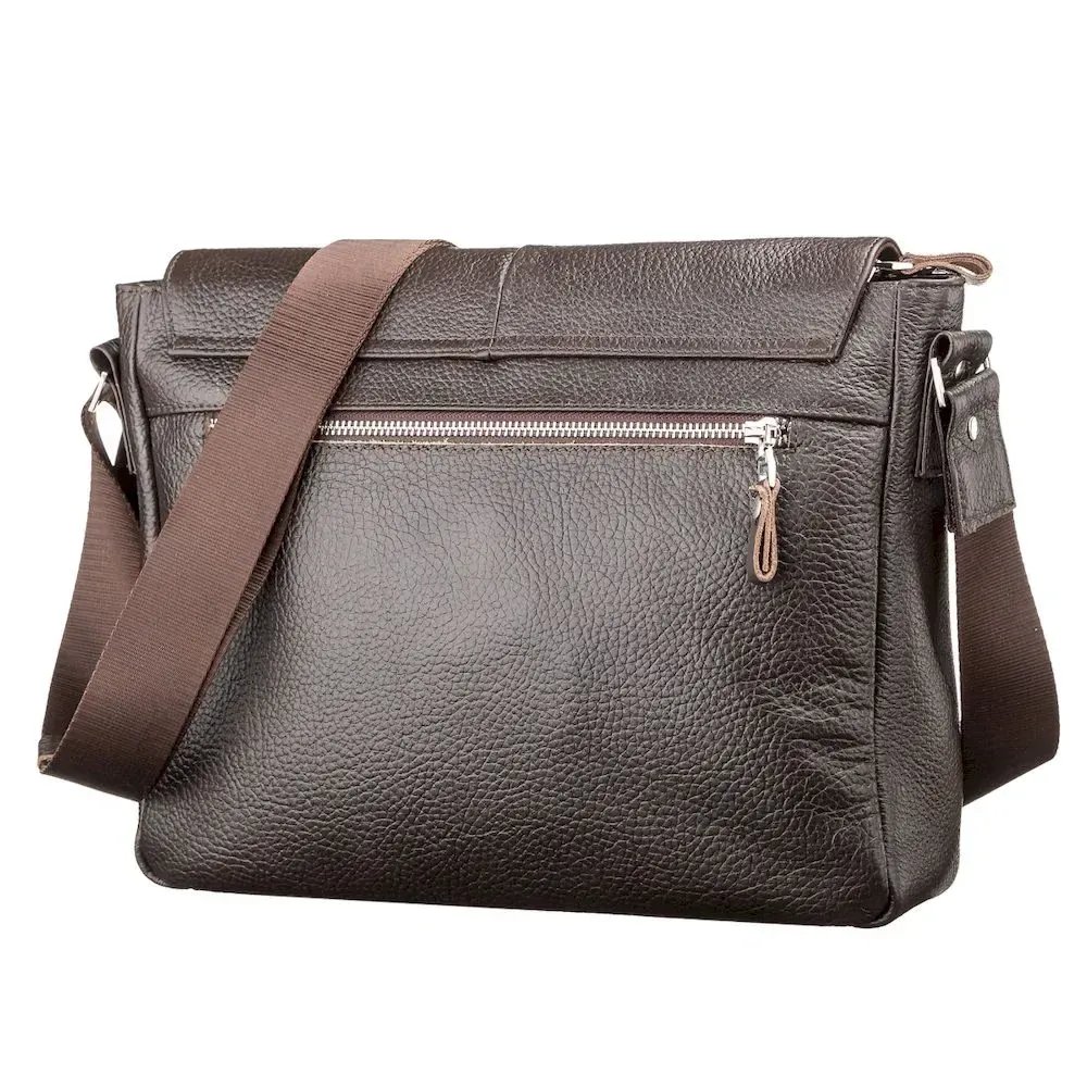 Оригинальная коричневая сумка из натуральной кожи, которая приглянется Вам своим стильным видом. Сумка изготовлена в черно-коричневом цвете и дополнена прочным текстильным черным ремнем, который регулируется и позволяет носить изделие на плече или через плечо.
