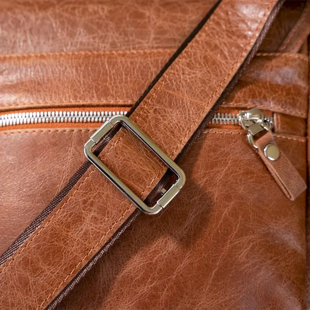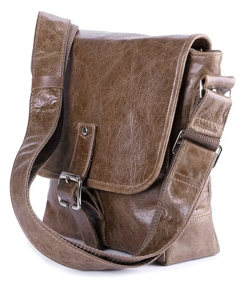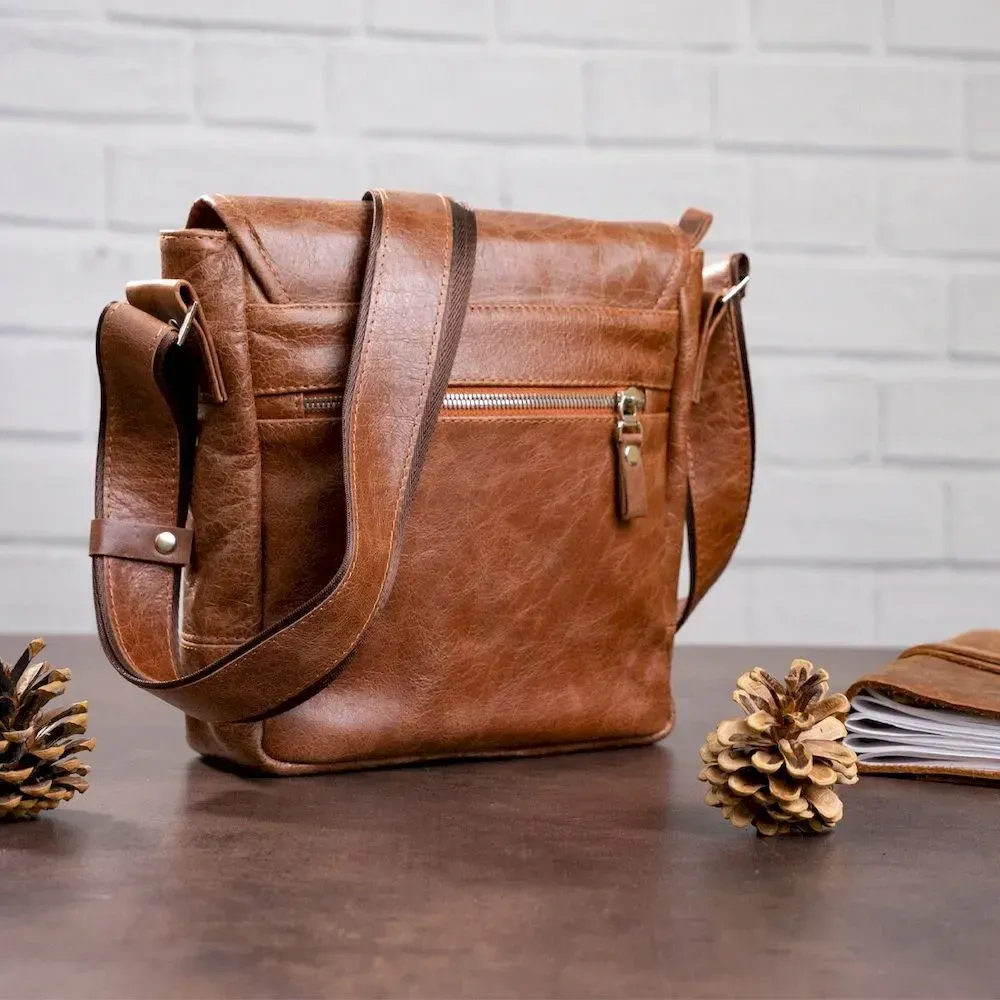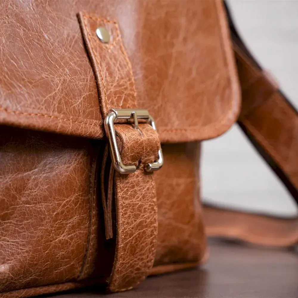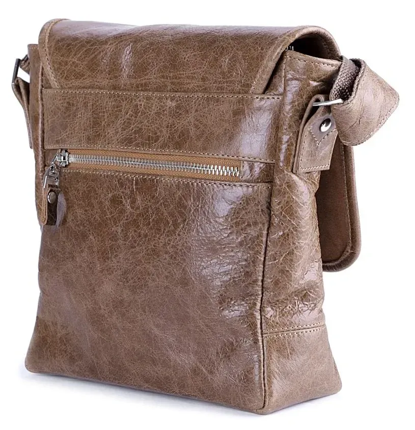 Высококачественная мужская сумка из натуральной винтажной кожи. Цвет фурнитуры: серебро. Сумка закрывается при помощи клапана на магнитной кнопке и металлической молнии. Под клапаном расположен накладной карман. На задней внешней стороне аксессуара находится небольшое отделение на молнии. Сумка носиться через плечо при помощи регулируемого плечевого ремня. Подкладка выполнена из прочного текстильного материала.