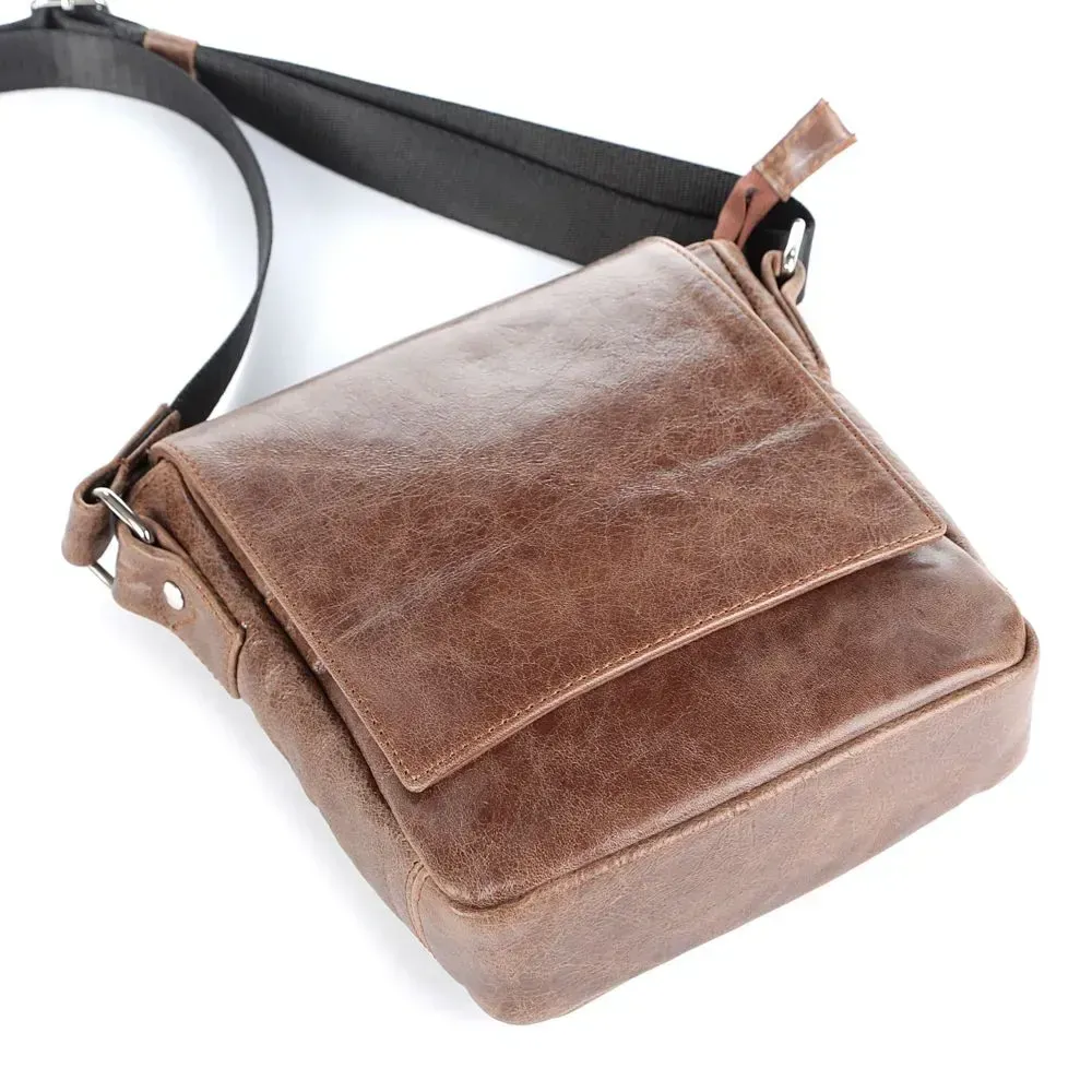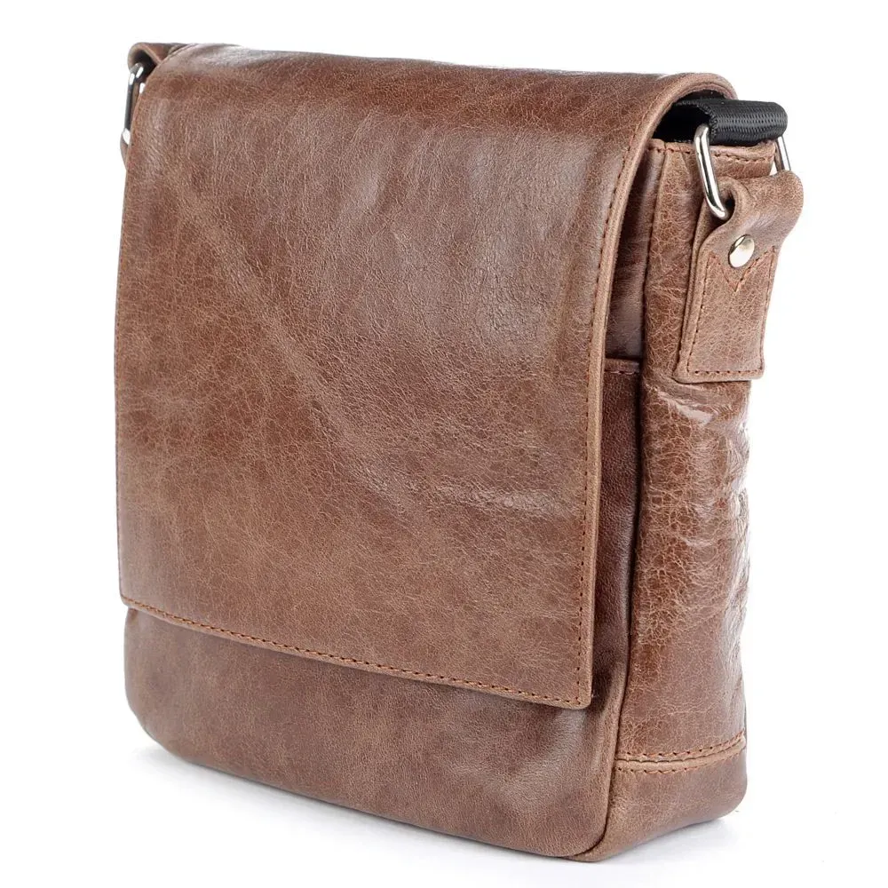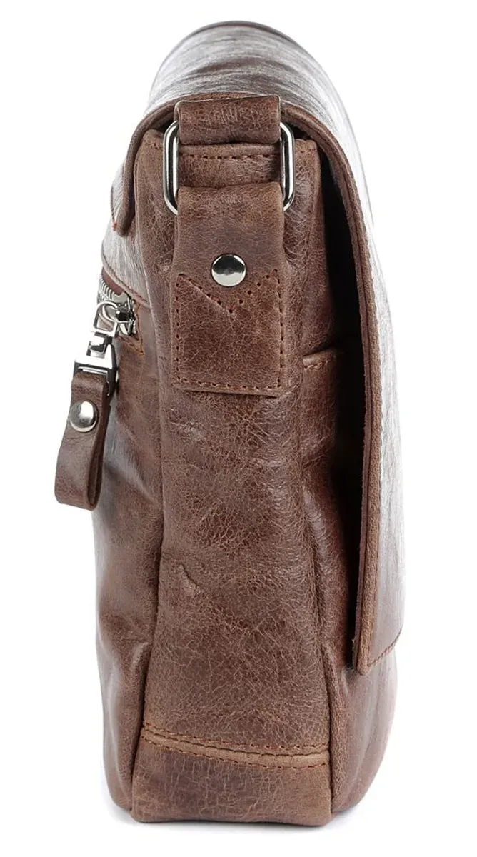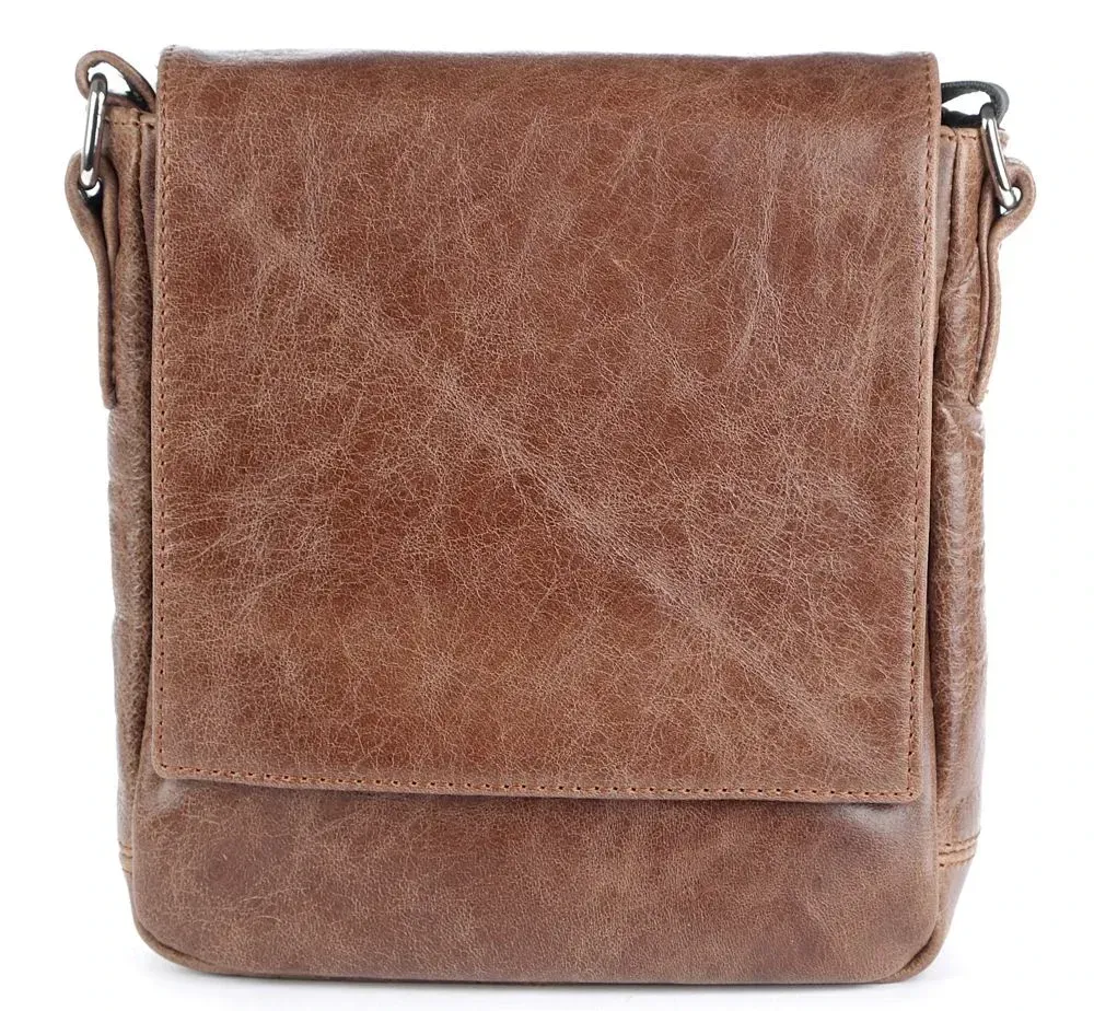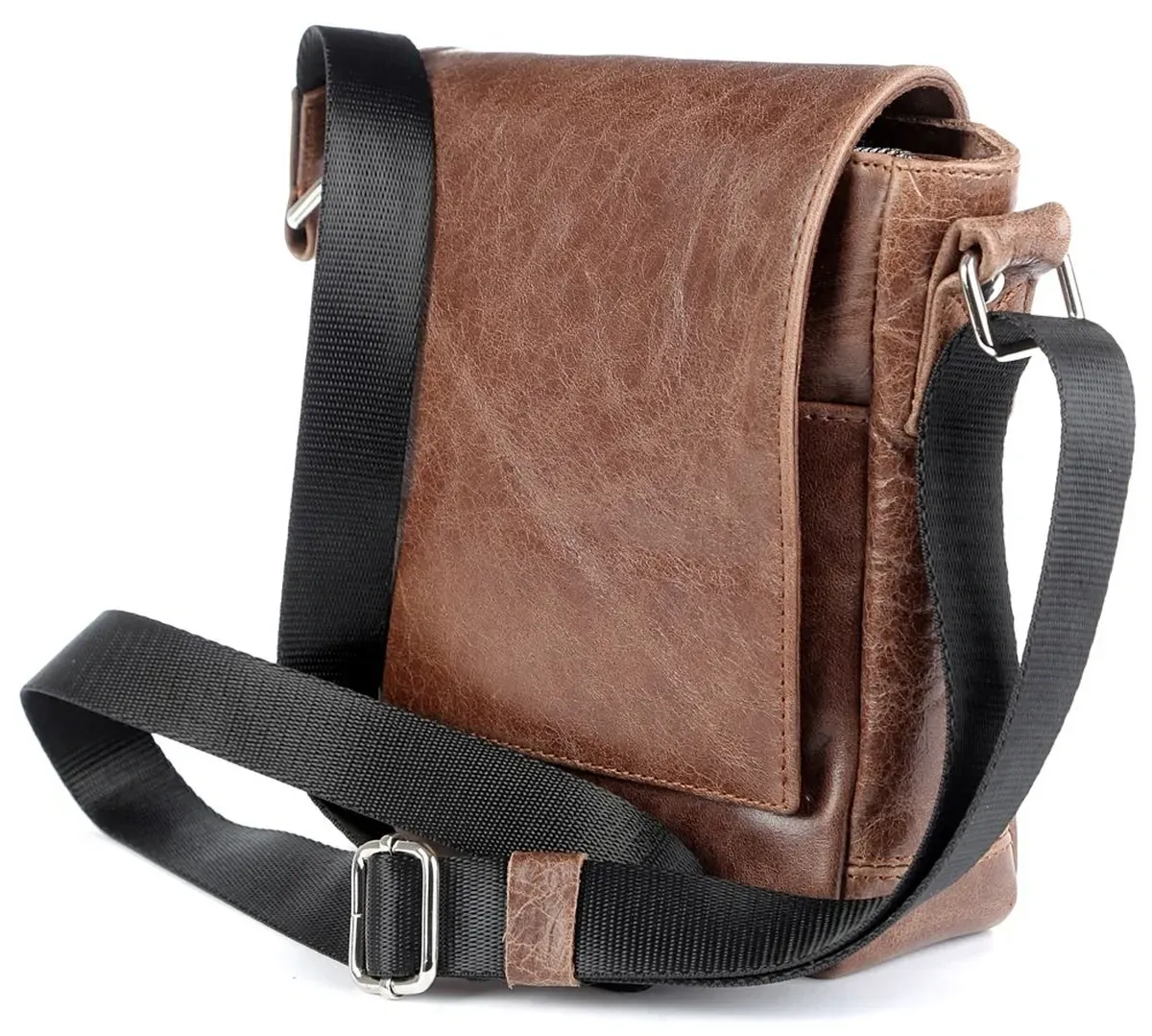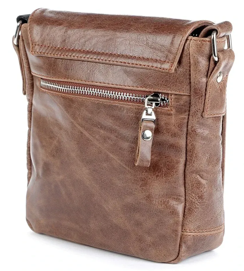 Добротная мужская сумка из натуральной высококачественной кожи. Цвет фурнитуры: серебро. На задней внешней стороне находится отделение на молнии. Сумка закрывается при помощи клапана на двух скрытых магнитах и молнией. Под клапаном расположен накладной карман. Сумка носиться через плечо про помощи регулируемого текстильного плечевого ремня.