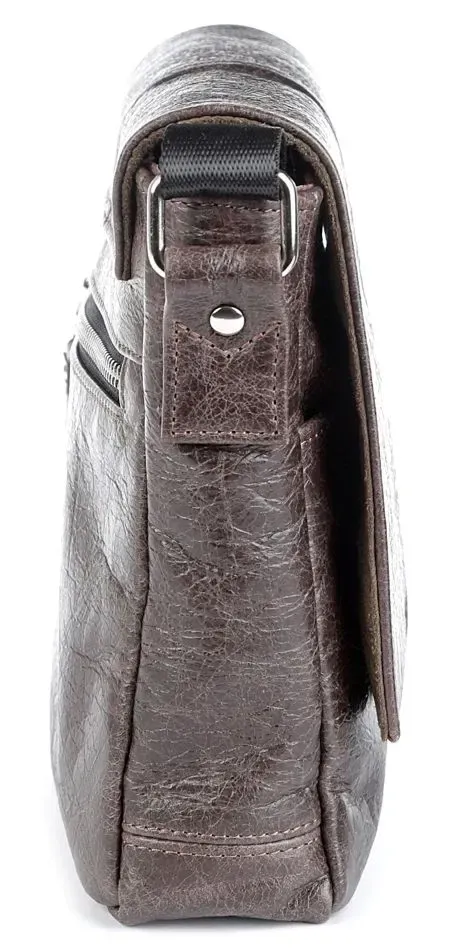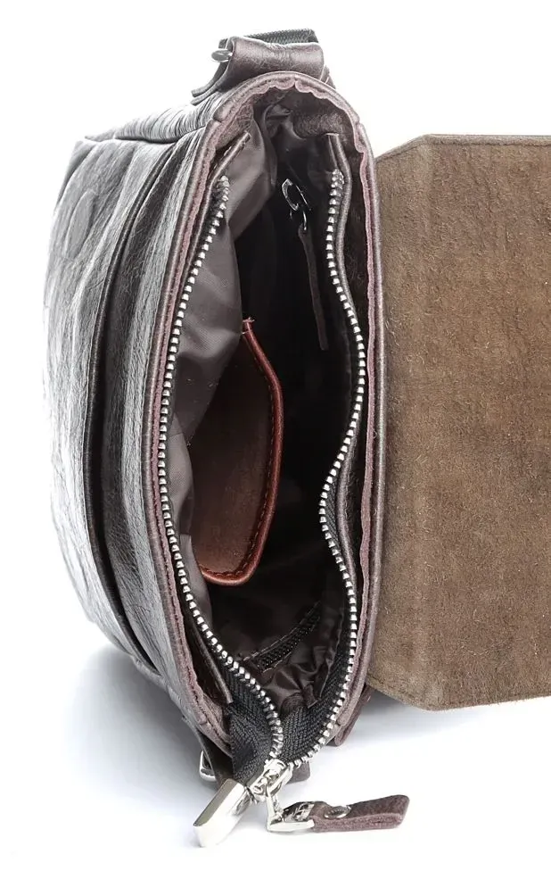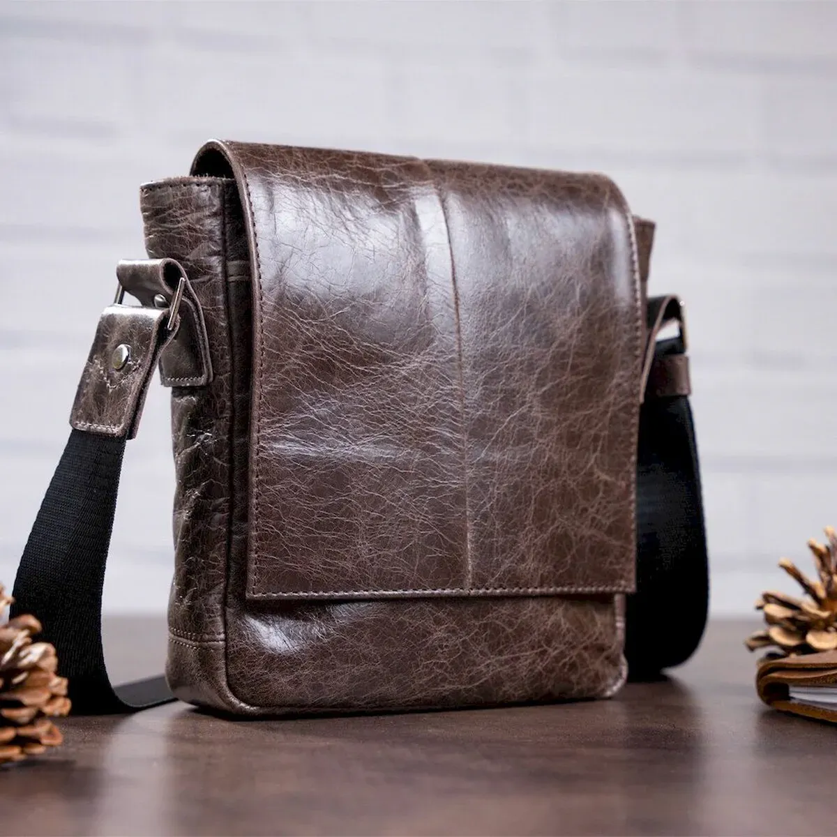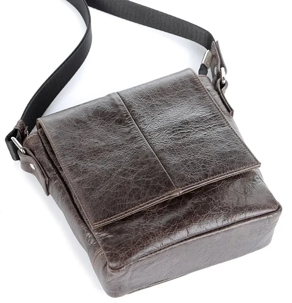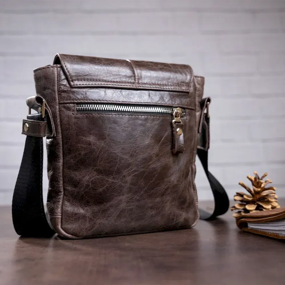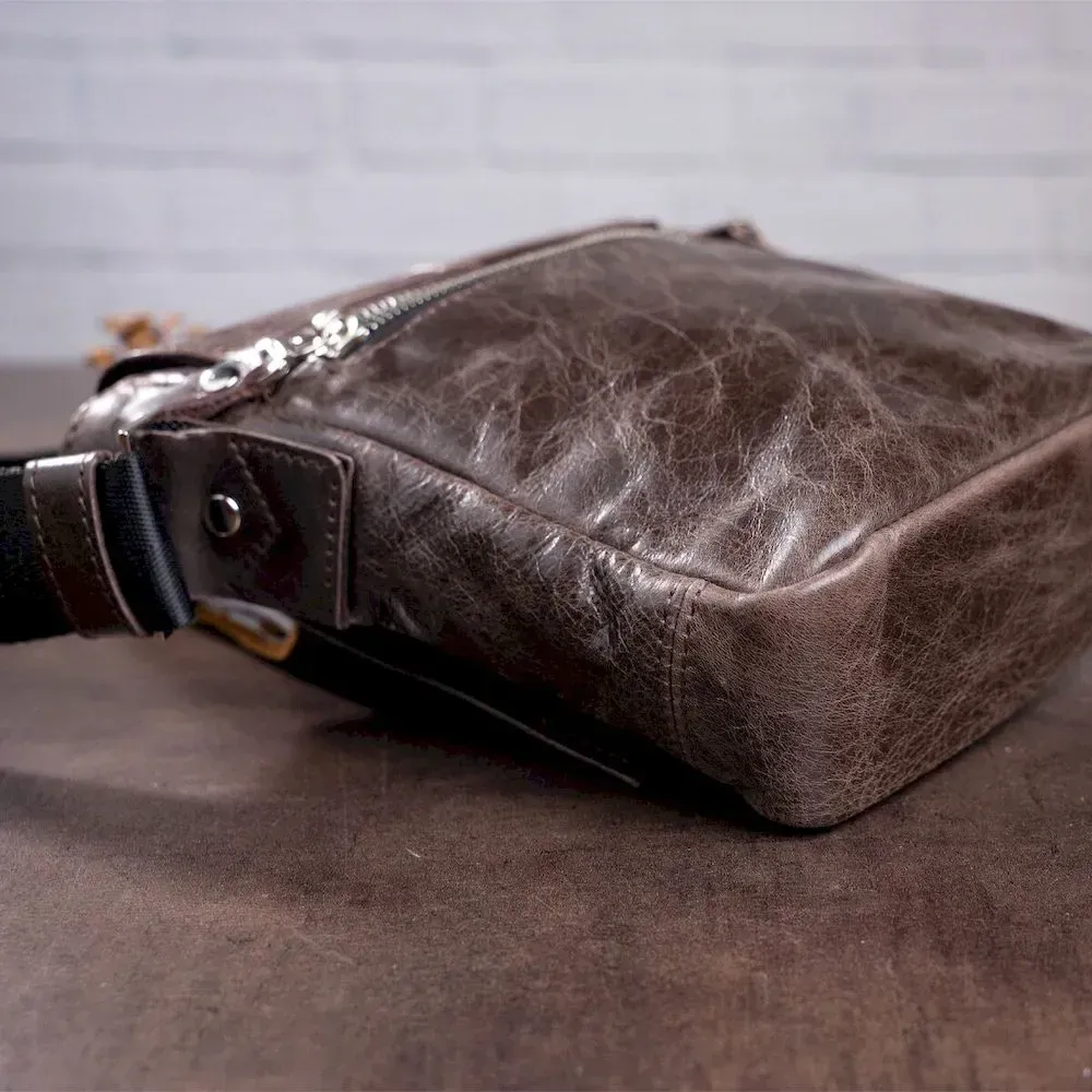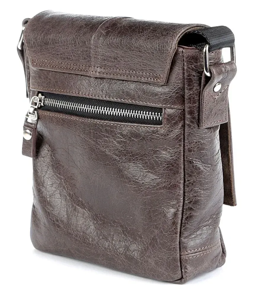 Оригинальная мужская сумка из натуральной высококачественной винтажной кожи. Цвет фурнитуры: серебро. На задней внешней стороне находится отделение на молнии, в которое можно поместить вещи первой необходимости. Сумка закрывается при помощи клапана на двух скрытых магнитах и молнией. Под клапаном расположен накладной карман. Сумка носиться через плечо про помощи регулируемого текстильного плечевого ремня. Такой аксессуар является превосходным решением для подарка мужчине к любому празднику.