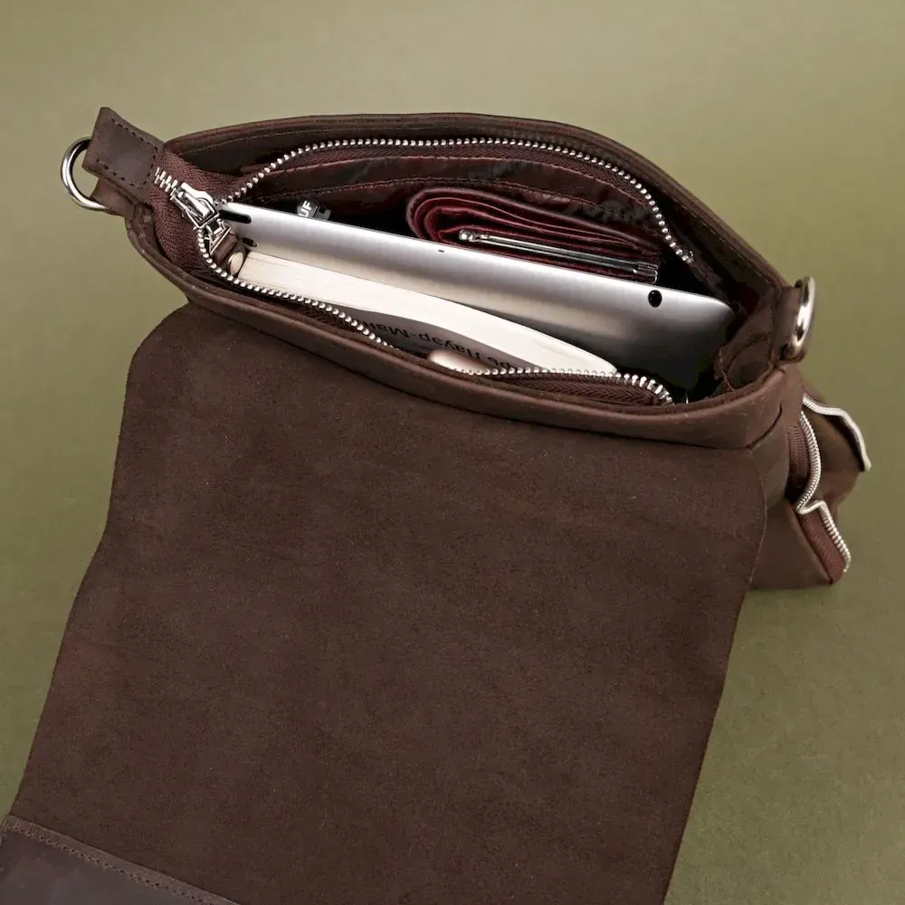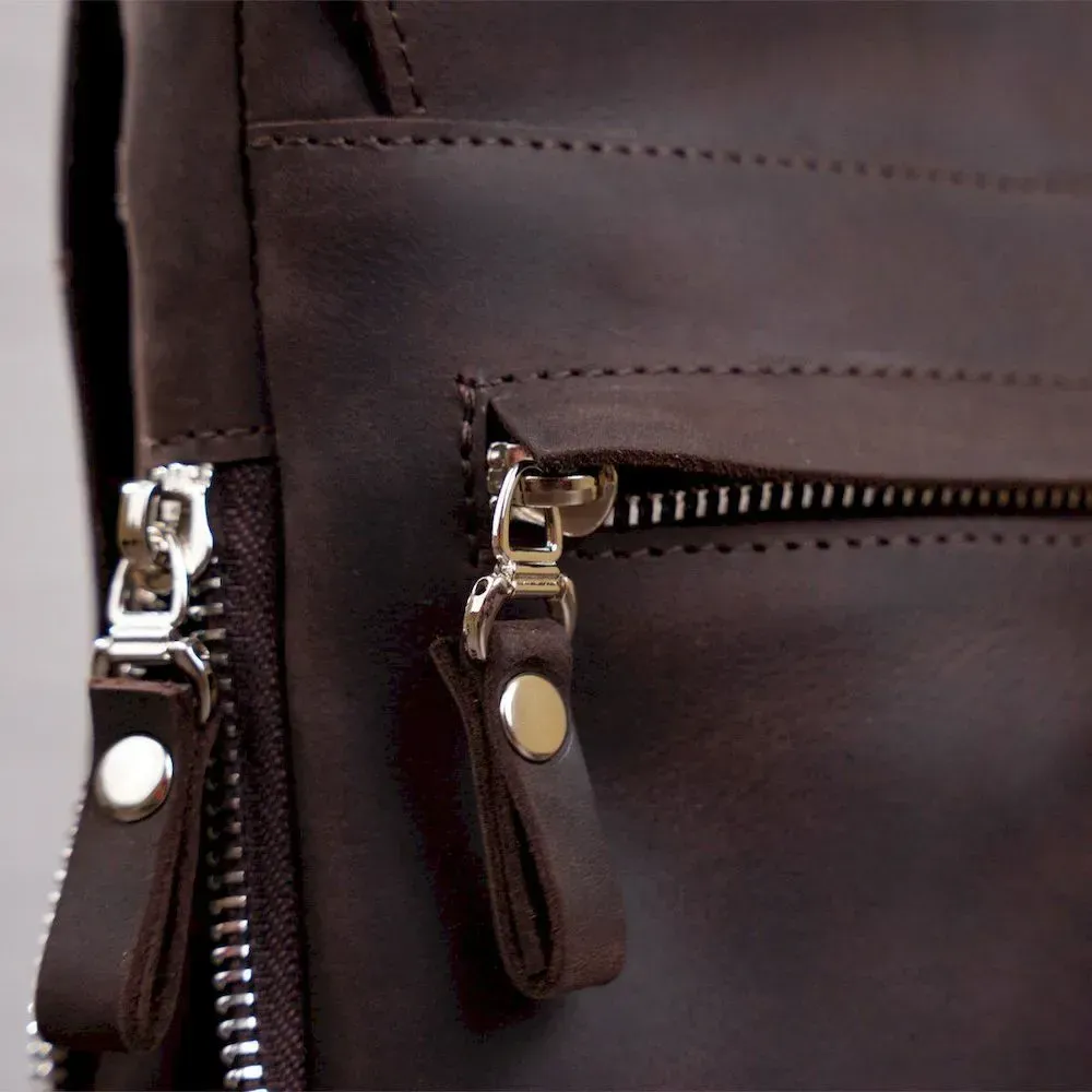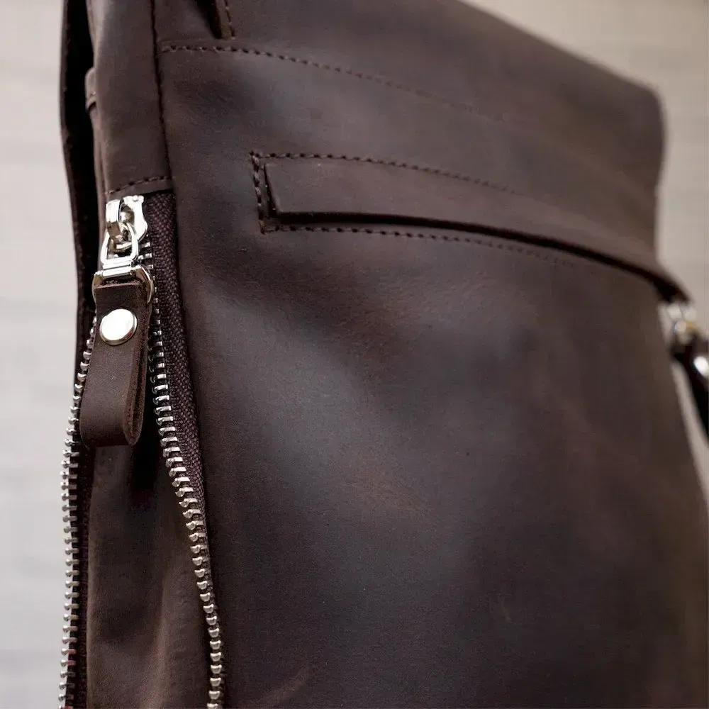 Основное отделение закрывается молнией, внутри на передней стенке, есть кожаный накладной карман для габаритного мобильного телефона. На задней стенке - скрытый, вместительный карман на молнии.