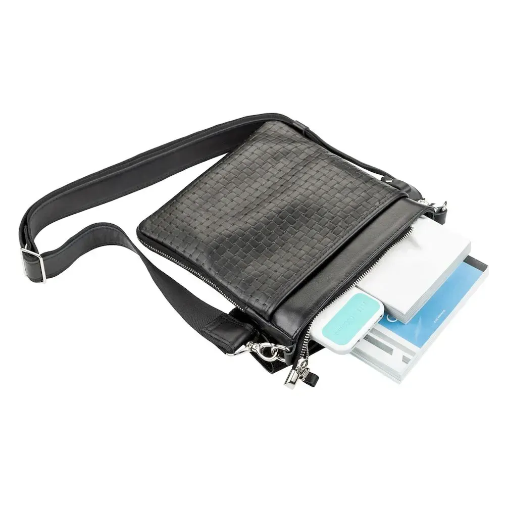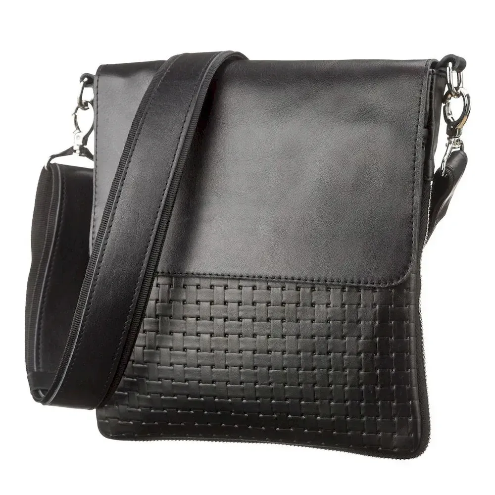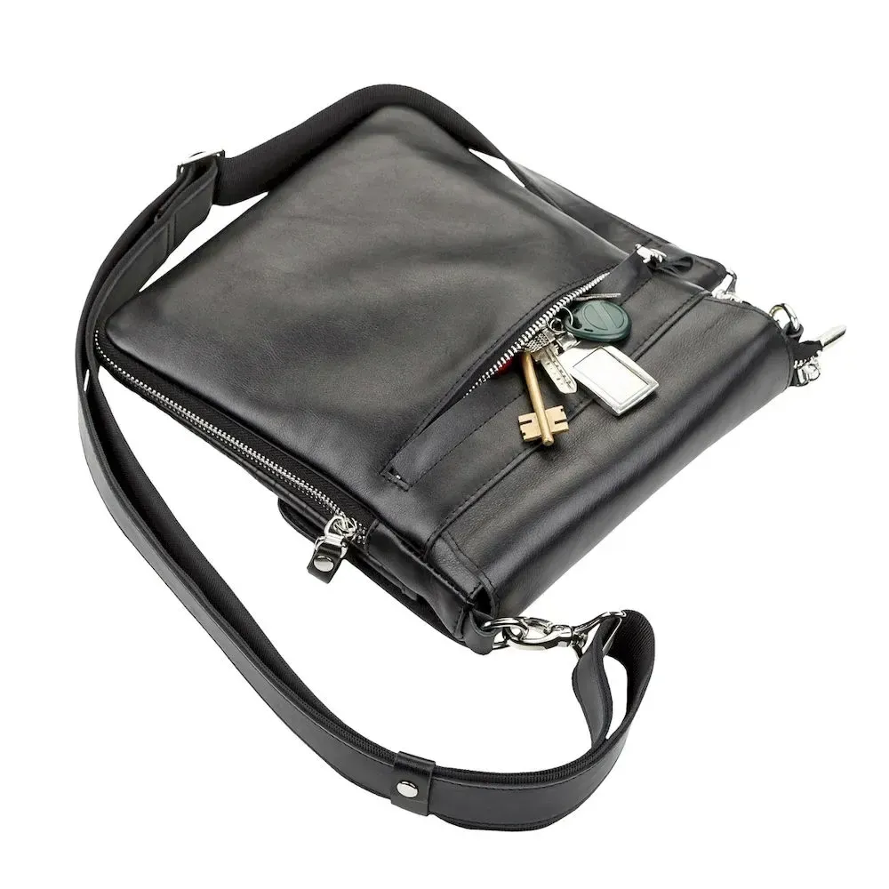 На задній, зовнішній, стінці аксесуара розташована прорізна кишеня на застібці, яка прикрита шкірою. Об'єм сумки збільшується за допомогою блискавки на її гранях. Закривається аксесуар клапаном на двох магнітах. При відкритті є добротна накладна кишеня. Головне відділення закривається блискавкою для додаткового захисту особистих речей. Всередині на задній стеці розташована прихована кишеня на змійці, на передній стінці нашита для габаритного смартфона або портмоне.