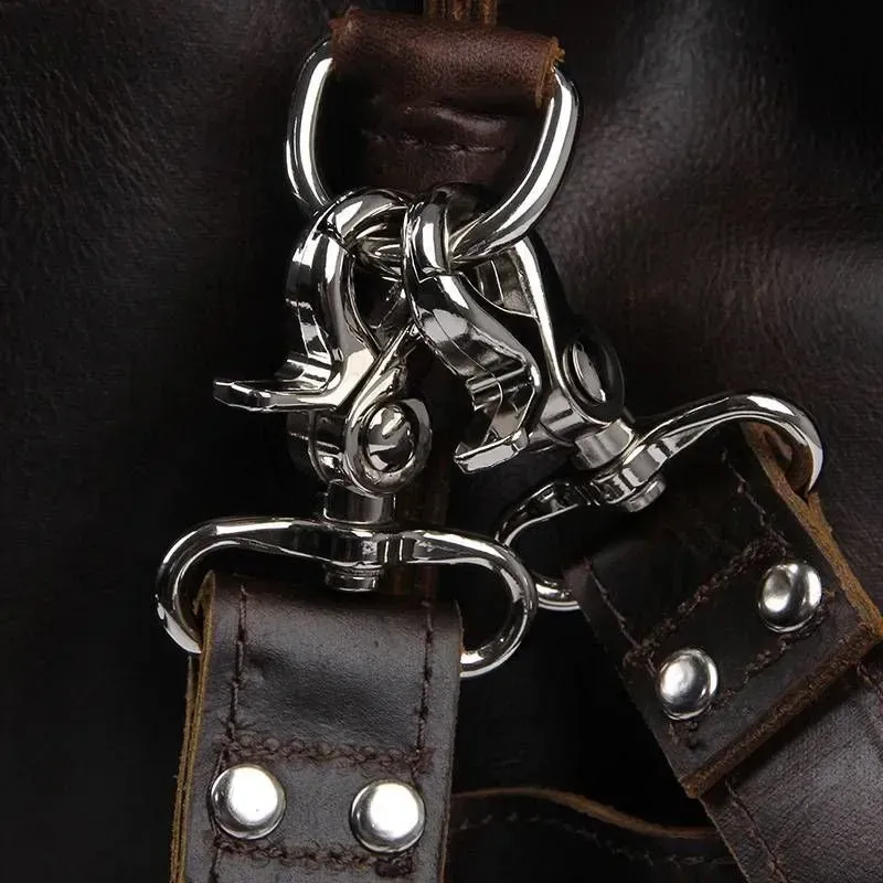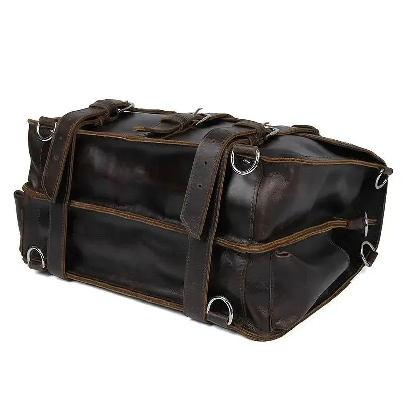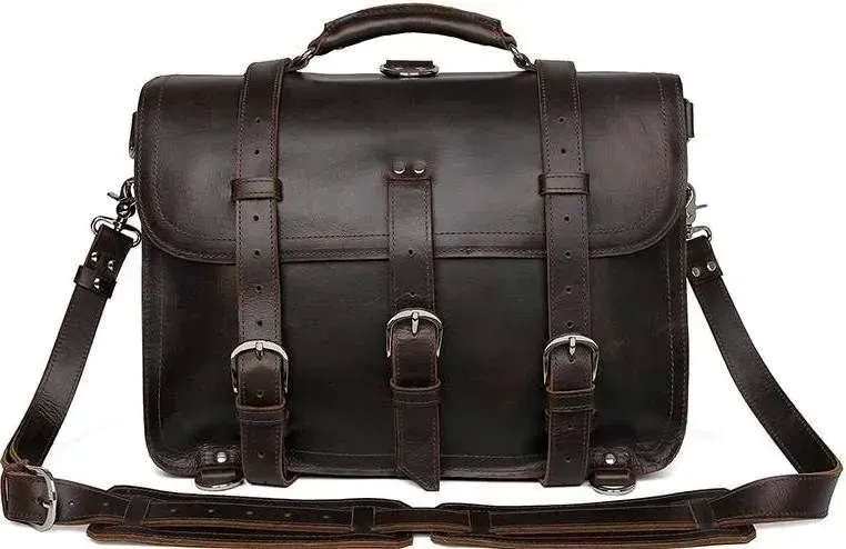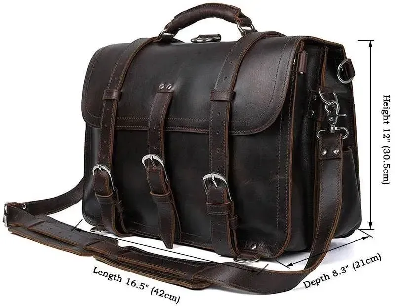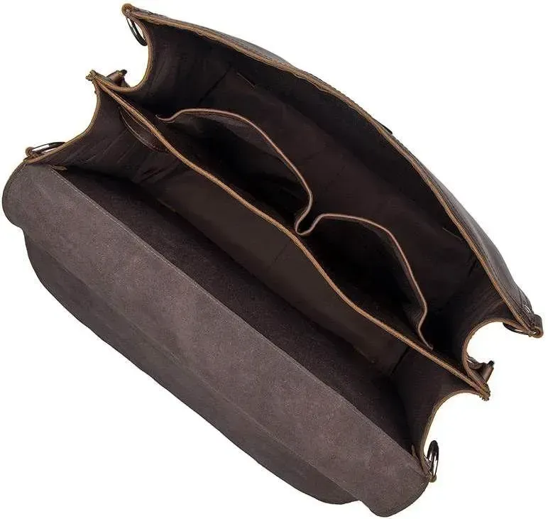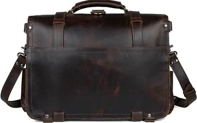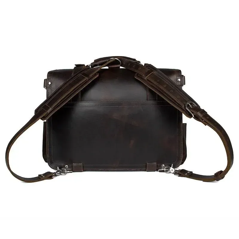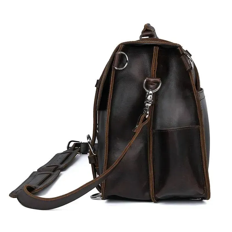 Міцний чоловічий шкіряний портфель у вінтажному стилі, з натуральної шкіри. Колір фурнітури: срібло. Носитися дана модель через плече за допомогою шкіряного регульованого плечового ременя, в руках за допомогою надійної шкіряної ручки, а також за плечима на спині. На задній зовнішній стороні розташована кишеня. Портфель закривається клапаном на nbsp; три ремінні лямки. Аксесуар поставляється в текстильному чохлі пилу білого кольору. Підкладка виконана з міцного текстильного матеріалу коричневого кольору.