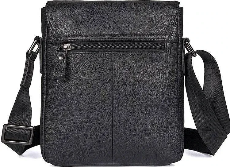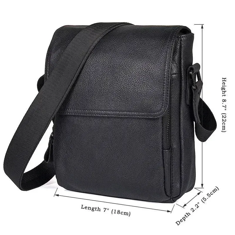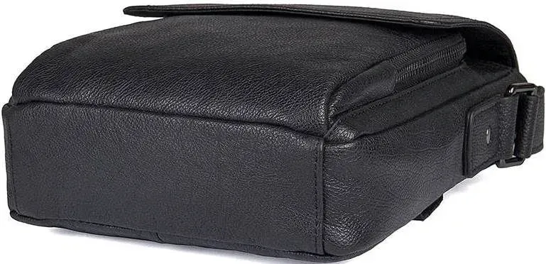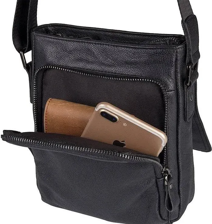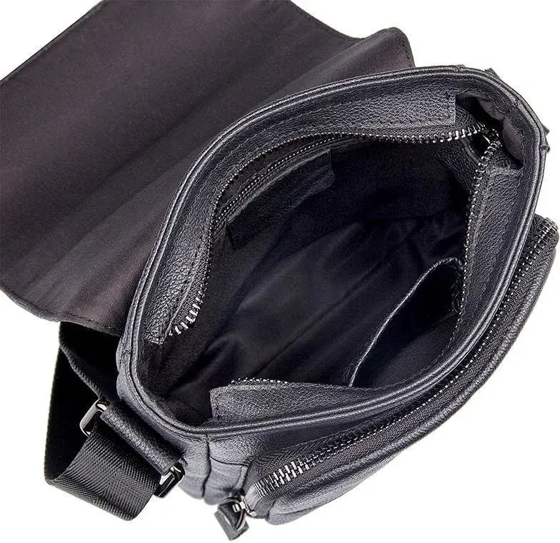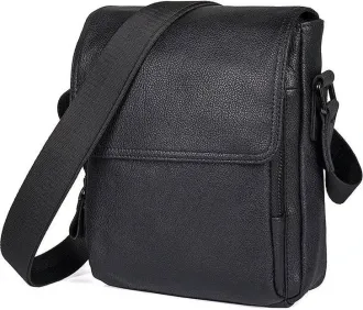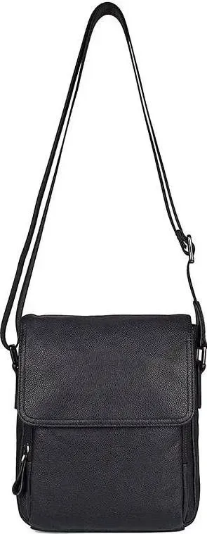 Компактна чоловіча сумка чорного кольору з натуральної зернистої шкіри. Колір фурнітури: срібло. Аксесуар невеликий, але при цьому досить місткий та функціональний.