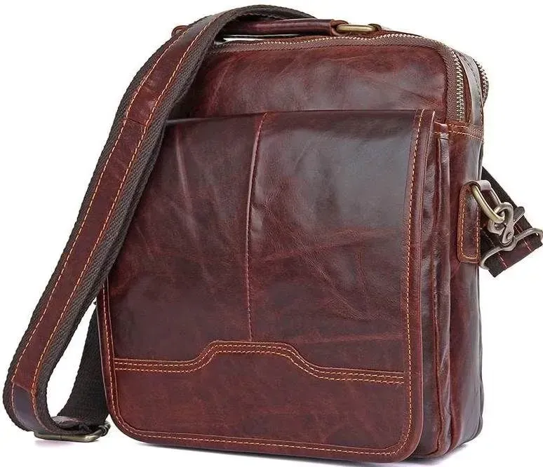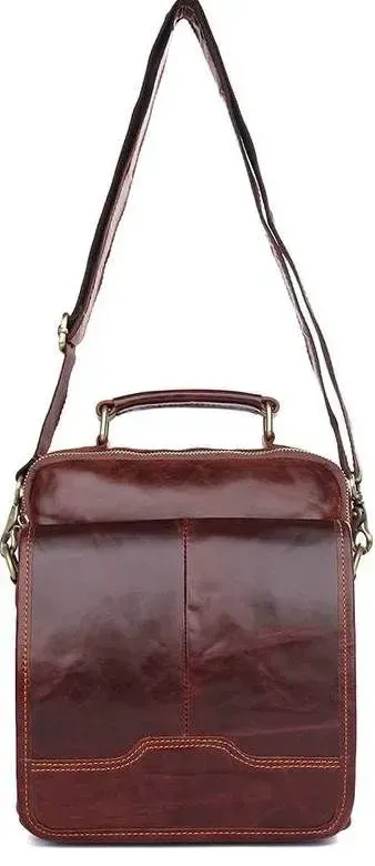 Відмінна чоловіча сумка коричневого кольору. Аксесуар виконаний з натуральної високоякісної шкіри, що відрізняється легким, ледь помітним блиском. Колір фурнітури: латунь. На лицьовій стороні розташована невелика кишеня під клапаном на магніті. На задній зовнішній стороні знаходиться містке відділення на блискавці. Сумка має два автономні відділення, які закриваються на блискавці. У першому відділенні знаходяться дві невеликі накладні кишені, а в другому відділенні розташована потайна кишеня на блискавці.