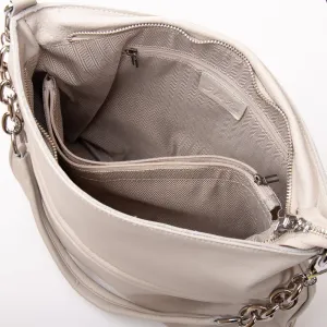 Жіноча сумочка. Під клапаном є одне відділення. Усередині є бічна відкрита кишеня та кишеня на блискавці. У комплекті регульований плечовий ремінь та широкий ремінь.