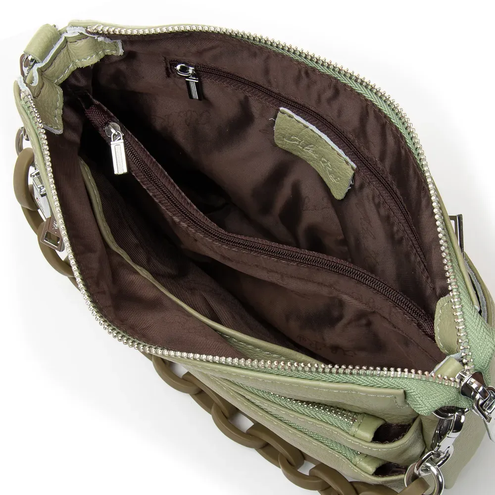 Жіноча сумочка Fashion. Три відділення: бічні закриваються на магнітні кнопки, а центральне – на блискавку. Усередині є бічна кишеня на блискавці та відкрита кишеня. У комплекті регульований плечовий ремінь та широкий ремінь.