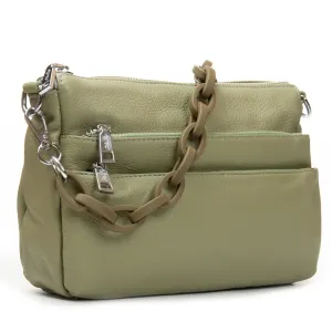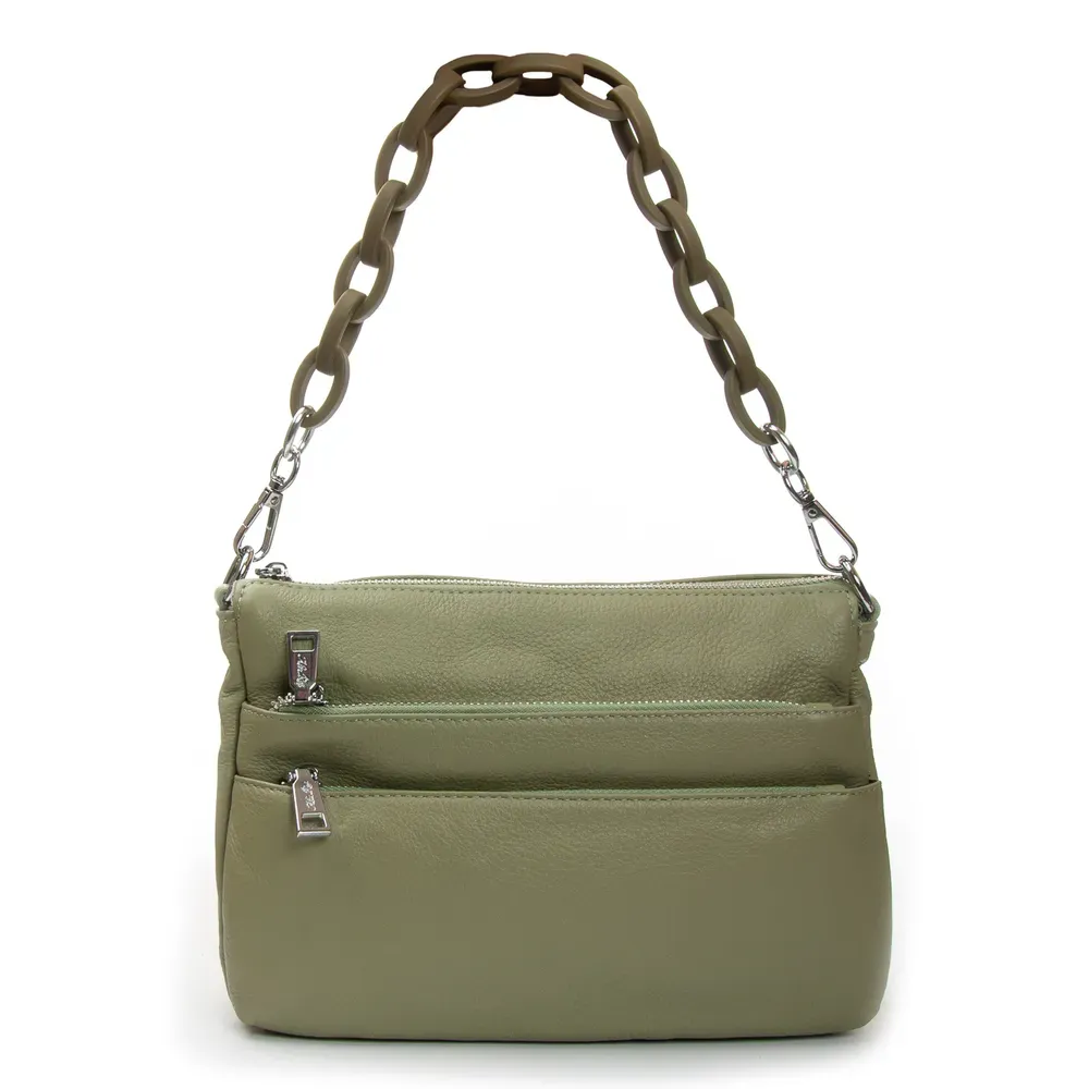 Жіноча сумочка Fashion. Три відділення: бічні закриваються на магнітні кнопки, а центральне – на блискавку. Усередині є бічна кишеня на блискавці та відкрита кишеня. У комплекті регульований плечовий ремінь та широкий ремінь.