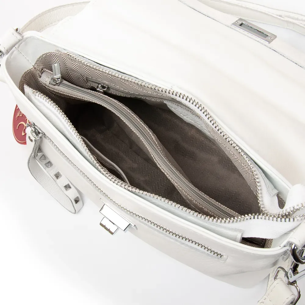 Жіноча сумочка Fashion. Три відділення: бічні закриваються на магнітні кнопки, а центральне – на блискавку. Усередині є бічна кишеня на блискавці та відкрита кишеня. У комплекті регульований плечовий ремінь та широкий ремінь.