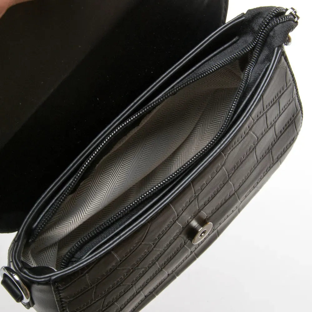 Женская сумочка Fashion. Клапан закрывается на магнитную кнопку. Внутри под молнией находится одно отделение с боковым открытым карманом.