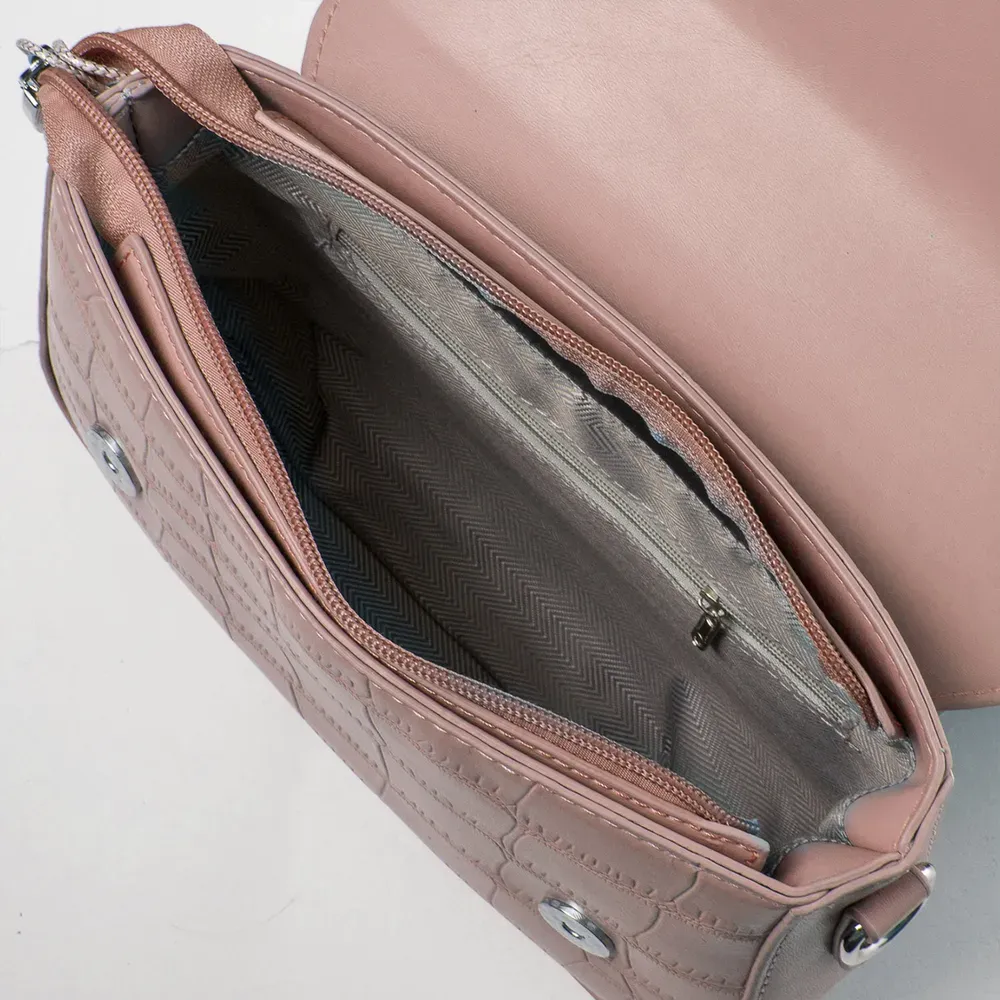 Женская сумочка Fashion. Клапан закрывается на магнитную кнопку. Внутри под молнией находится одно отделение с боковым открытым карманом и карманом на молнии.