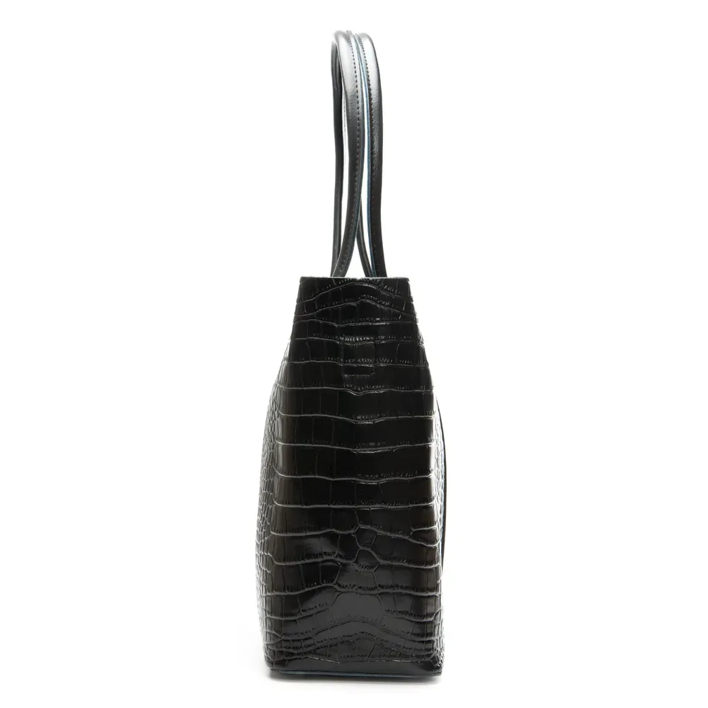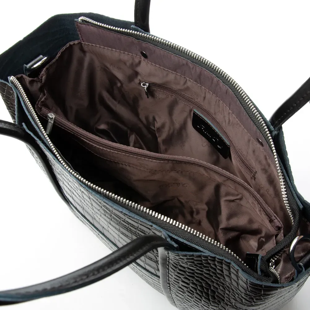 Закрывается на молнию. Внутри находится двойное отделение, разделенное карманом-перегородкой на молнии, открытый карман и боковой карман на молнии. Снаружи сумки на фасаде есть открытый карман, а на обратной стороне карман на молнии. Жесткое дно на металлических ножках.