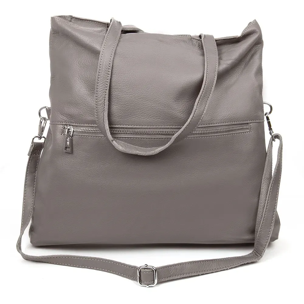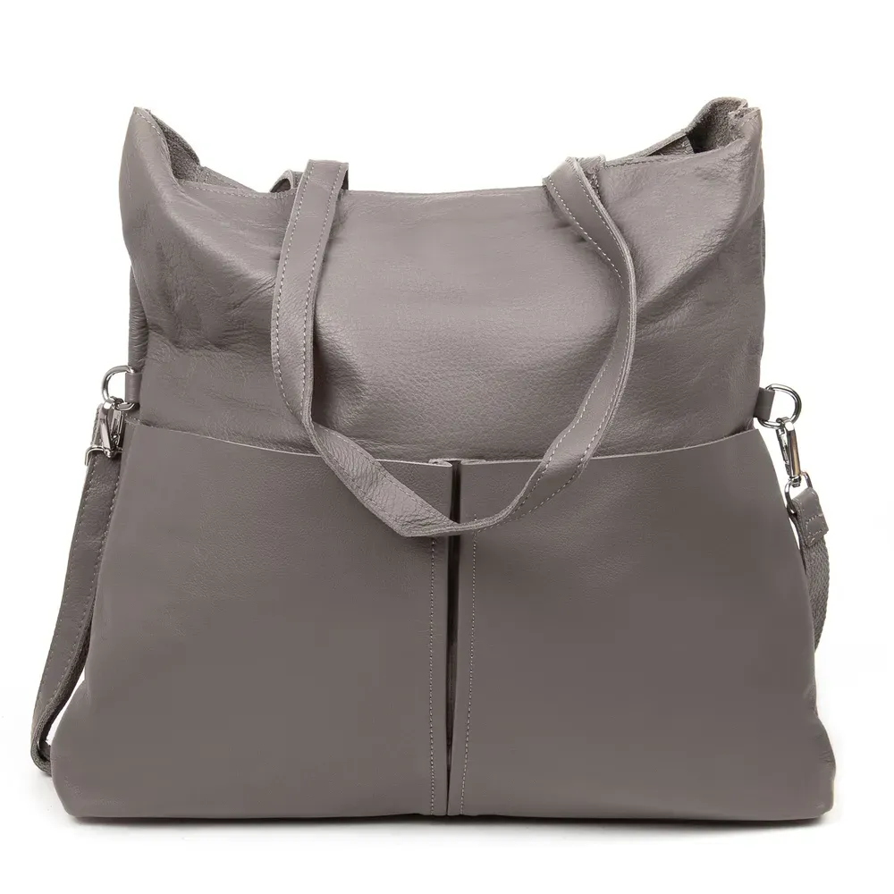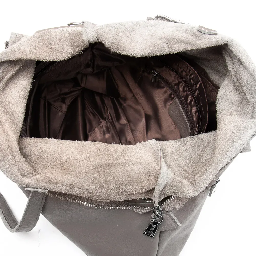 Женская большая кожаная сумка Alex Rai. Изготовлена из натуральной мягкой кожи. Сумку можно сложить вдвое и носить на плечевом ремне. Закрывается на молнию. Внутри находится одно большое отделение с открытым боковым карманом и карманом на молнии. Снаружи сумки на фасаде расположены два больших открытых кармана, а на обратной стороне находится карман на молнии. Жесткое дно.