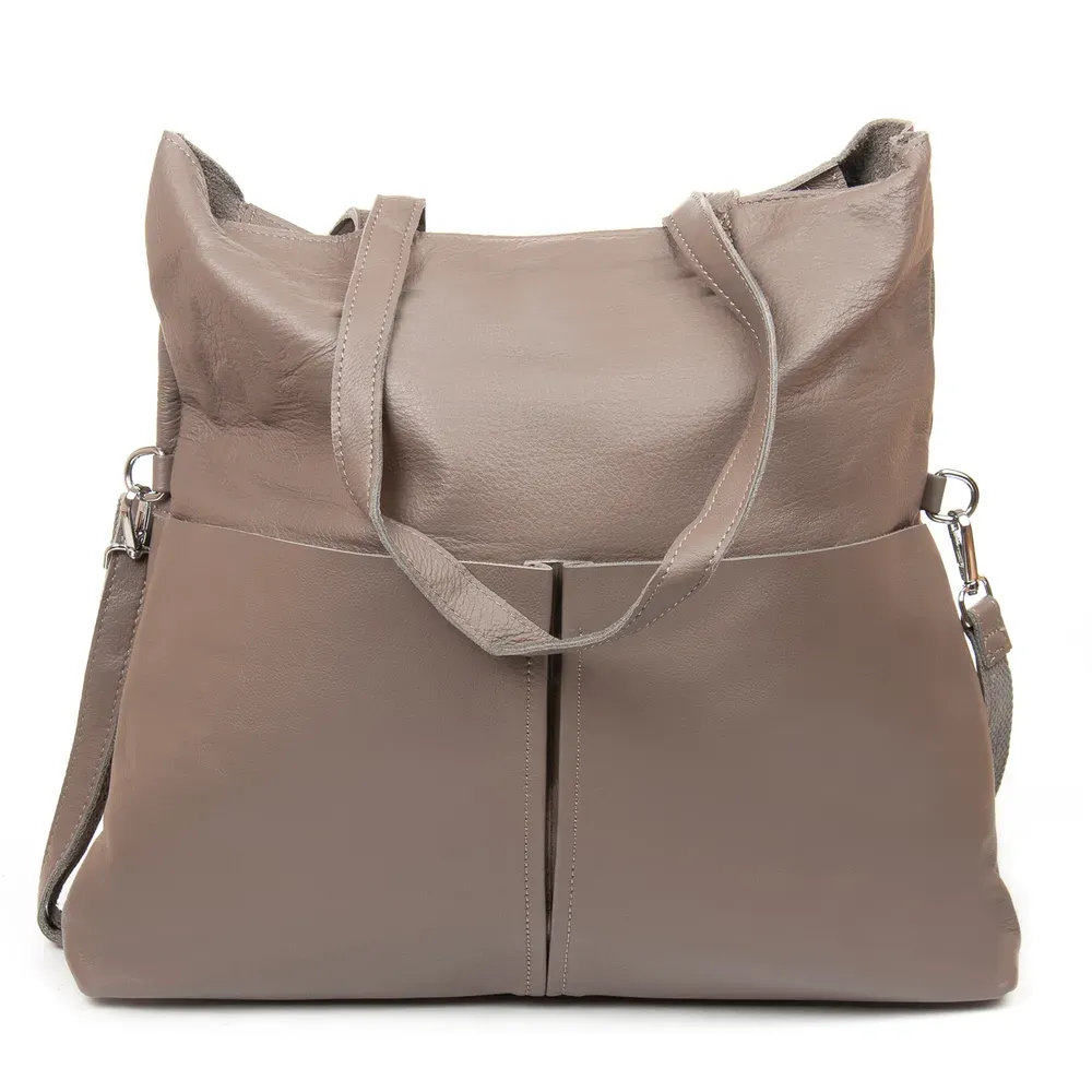 Женская большая кожаная сумка Alex Rai. Изготовлена из натуральной мягкой кожи. Сумку можно сложить вдвое и носить на плечевом ремне. Закрывается на молнию. Внутри находится одно большое отделение с открытым боковым карманом и карманом на молнии. Снаружи сумки на фасаде расположены два больших открытых кармана, а на обратной стороне находится карман на молнии. Жесткое дно.