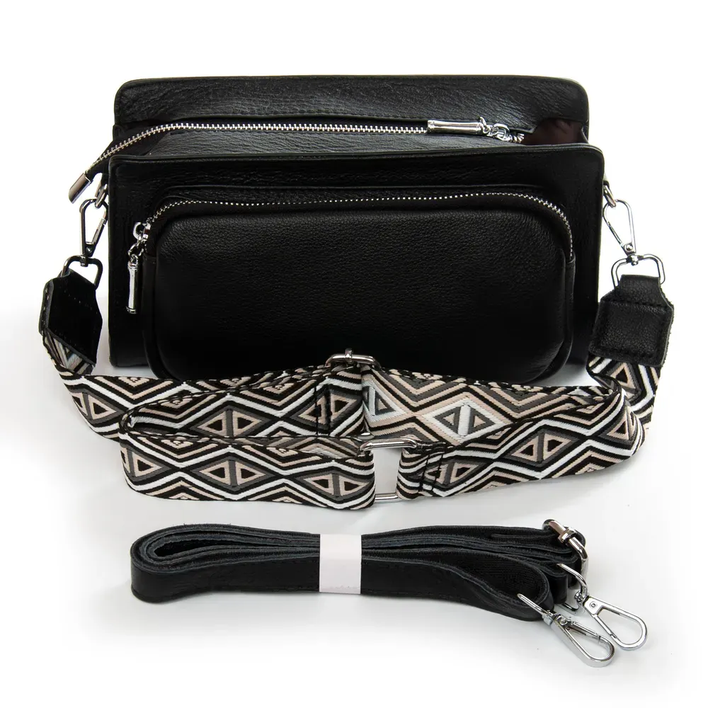 В комплекте регулируемый плечевой кожаный ремень и регулируемый текстильный широкий ремень.
