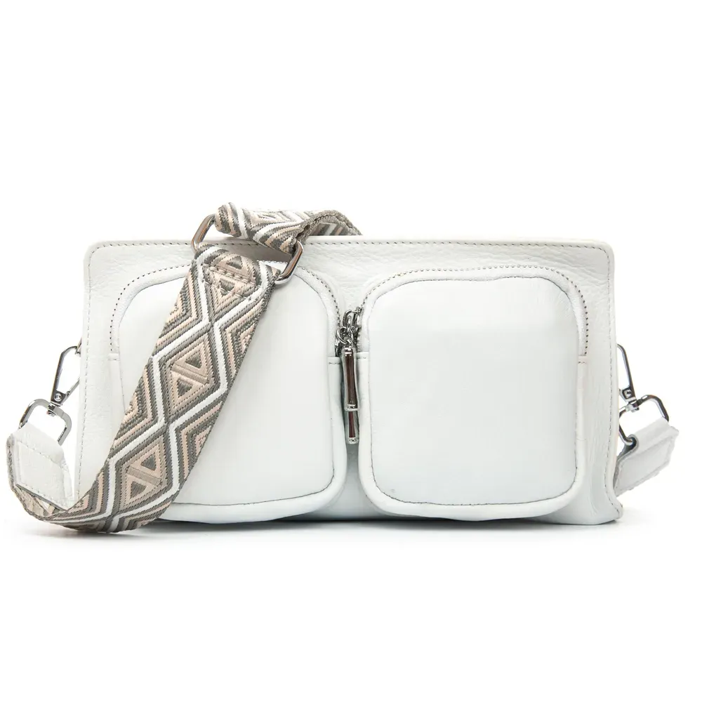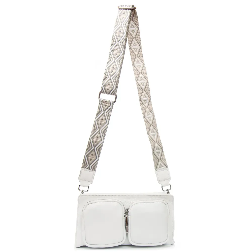 В комплекте регулируемый плечевой кожаный ремень и регулируемый текстильный широкий ремень.