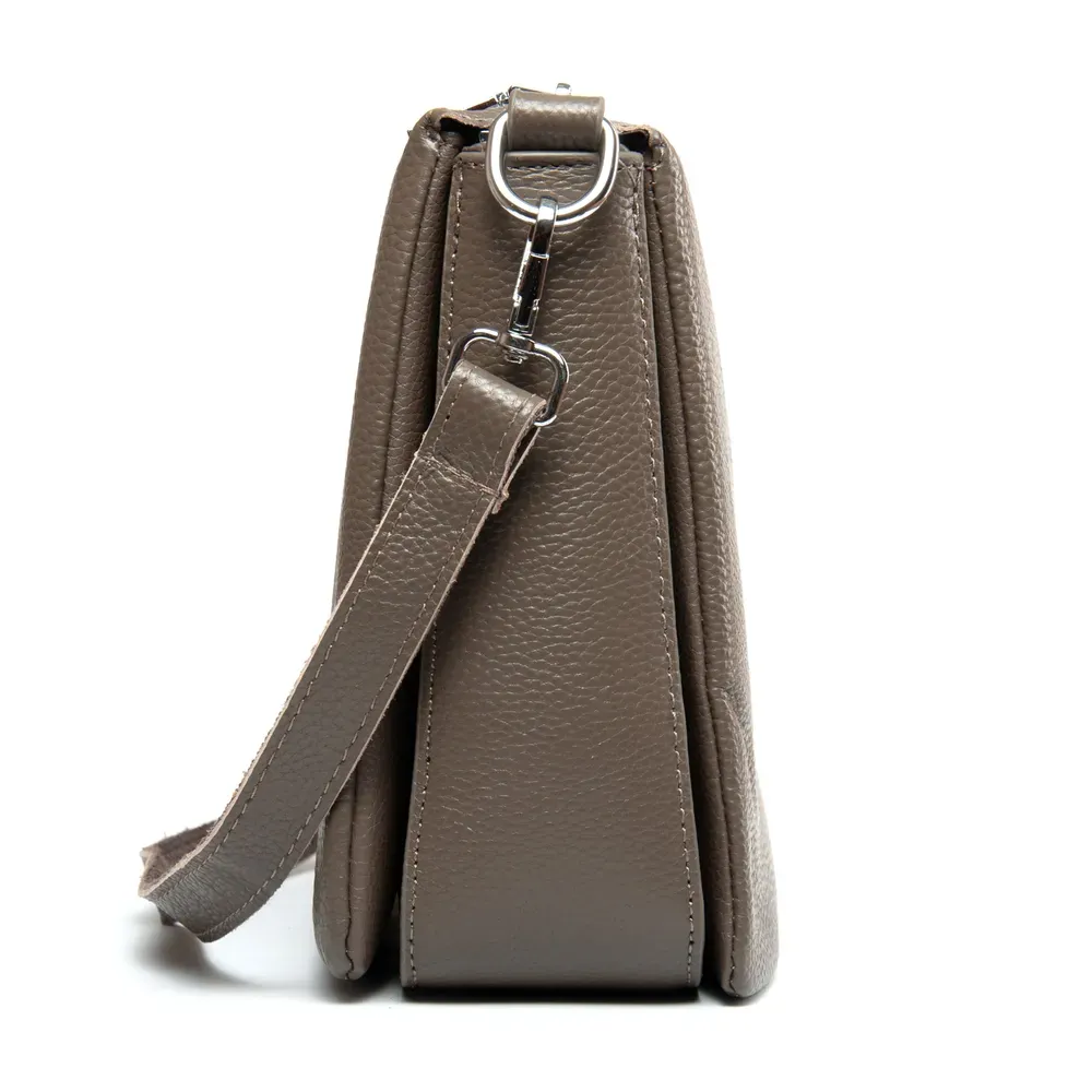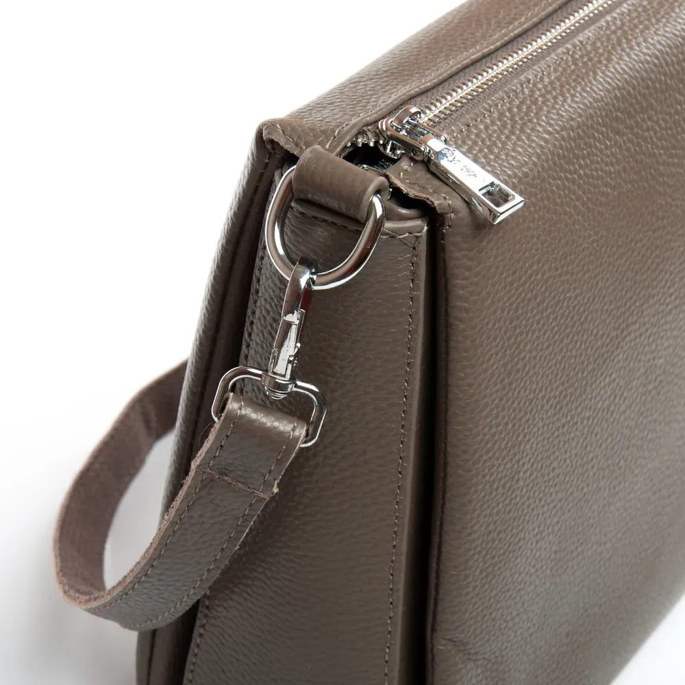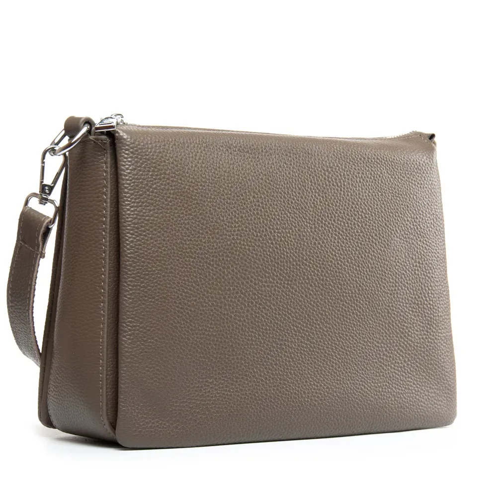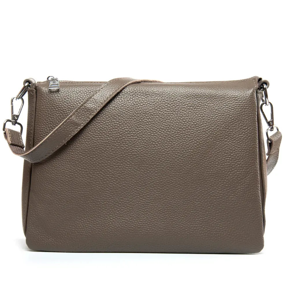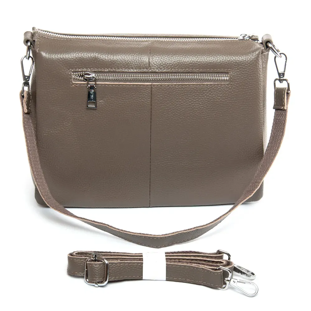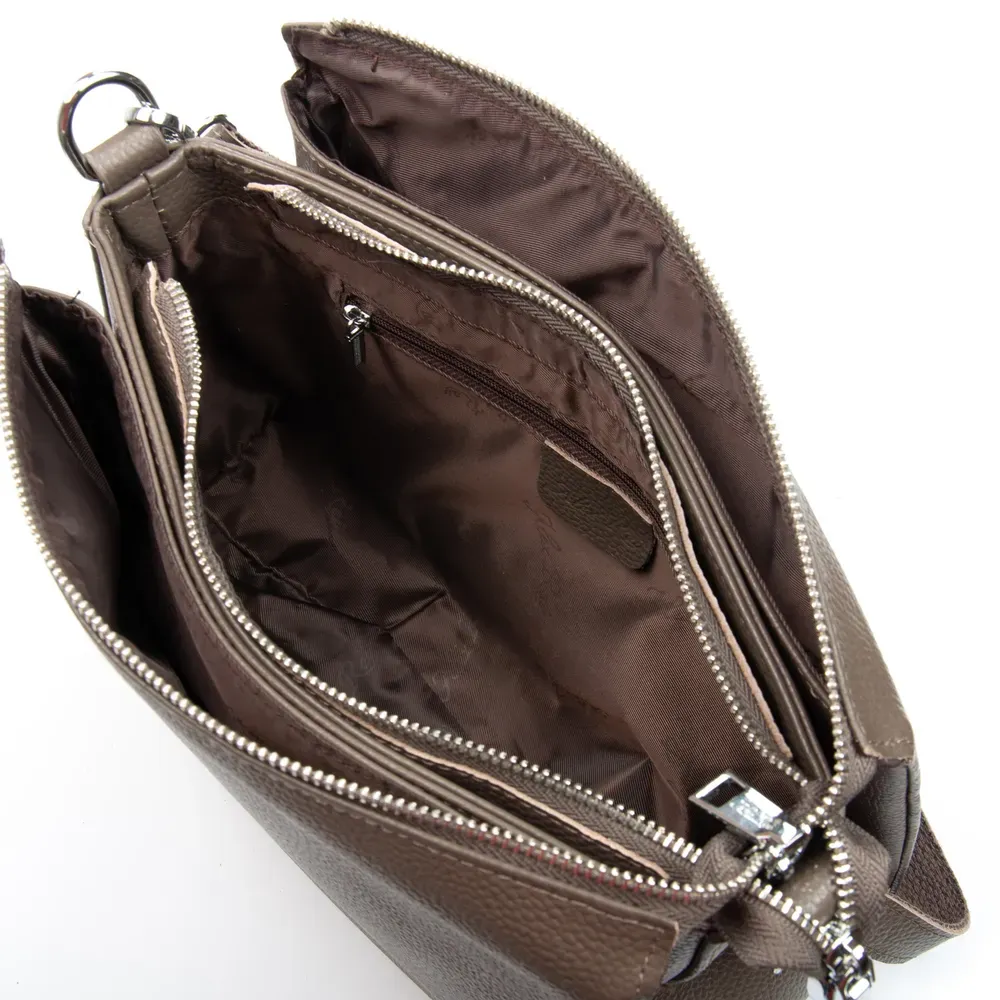 Изготовлена из натуральной мягкой кожи. Закрывается на молнию. Внутри находятся три отделения разделенные карманом-перегородкой. Среднее отделение дополнительно закрывается на молнию и внутри находится боковой открытый карман и карман на молнии. Снаружи сумки на обратной стороне расположен карман на молнии.