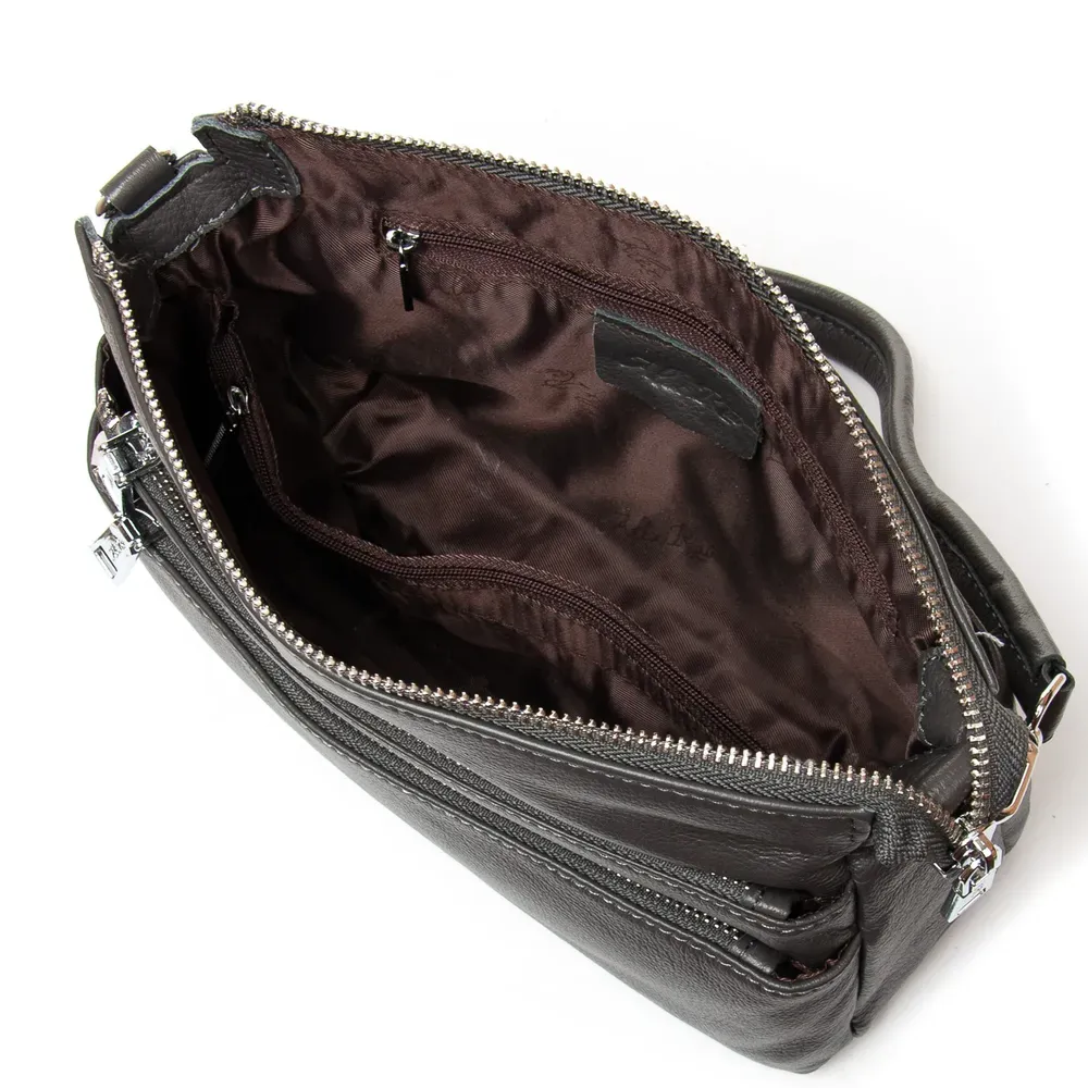 Женская кожаная сумка Alex Rai. Изготовлена из натуральной мягкой кожи. Закрывается на молнию. Внутри находится двойное отделение, разделенное карманом-перегородкой на молнии, открытый карман и боковой карман на молнии. Снаружи сумки на фасаде есть два кармана на молнии, а на обратной стороне один карман.