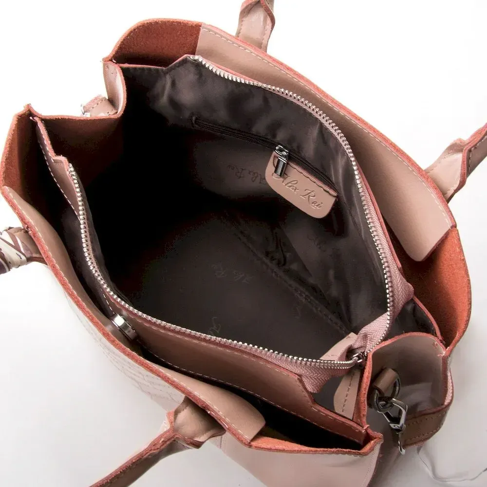 Жіноча сумка Alex Rai. Виготовлена із натуральної щільної шкіри. Три відділення: центральне закривається на блискавку, а бічні магнітні кнопки. Усередині центрального відділення є подвійна відкрита кишеня та кишеня на блискавці. Дно сумки жорстке, із металевими ніжками. У комплекті регульований плечовий ремінь.