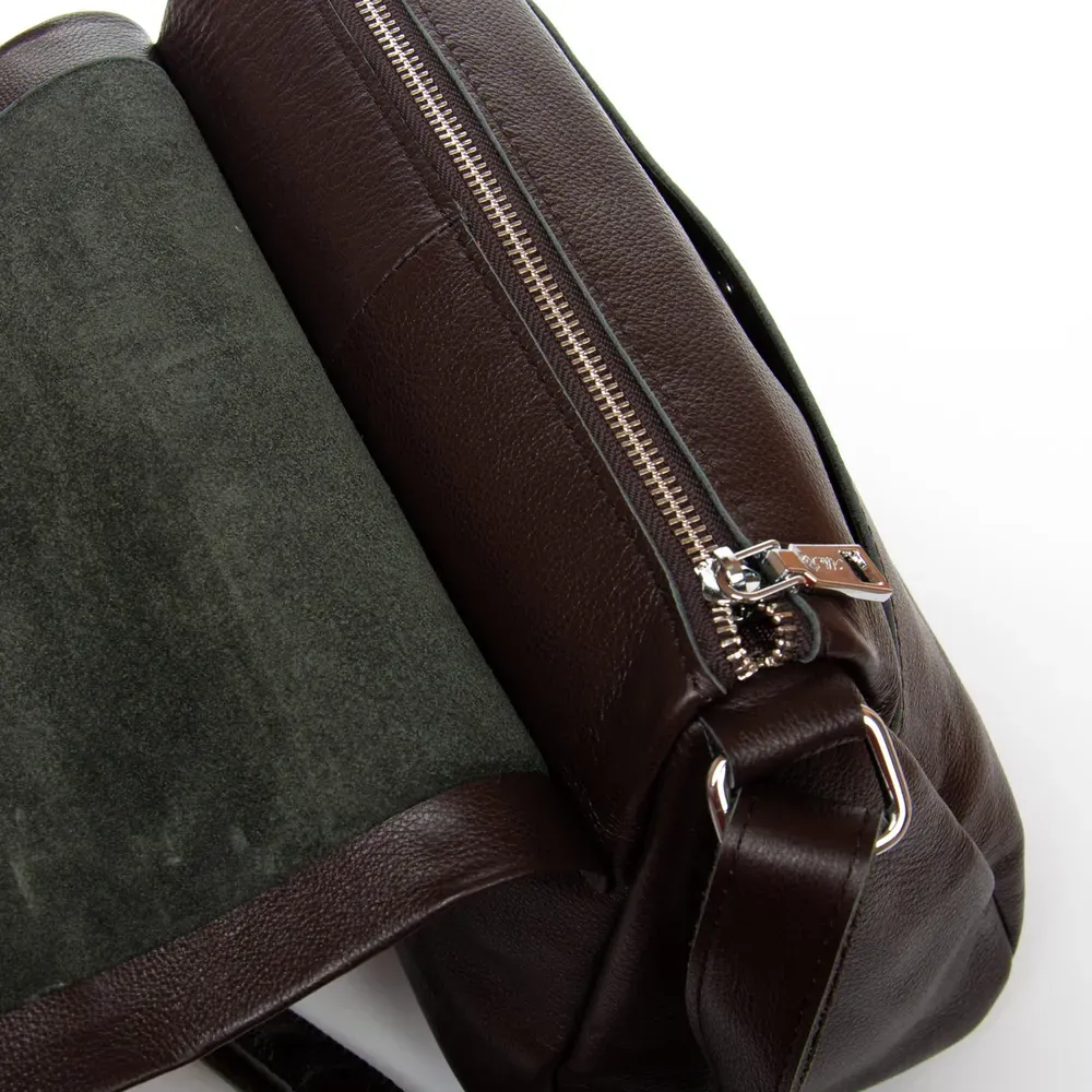 Изготовлена из натуральной мягкой кожи. Под клапаном дополнительно закрывается на молнию. Внутри отделения находится открытый двойной карман и боковой карман на молнии. На фасаде расположен большой карман на магнитной кнопке.