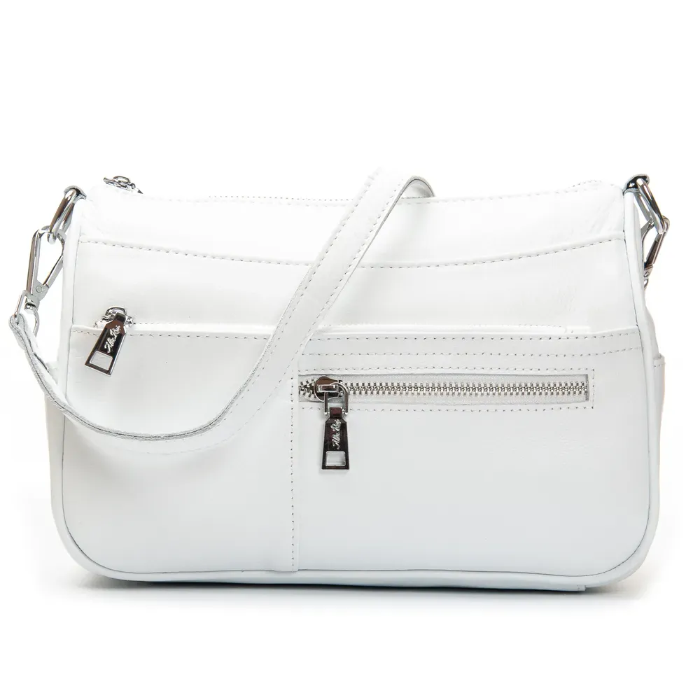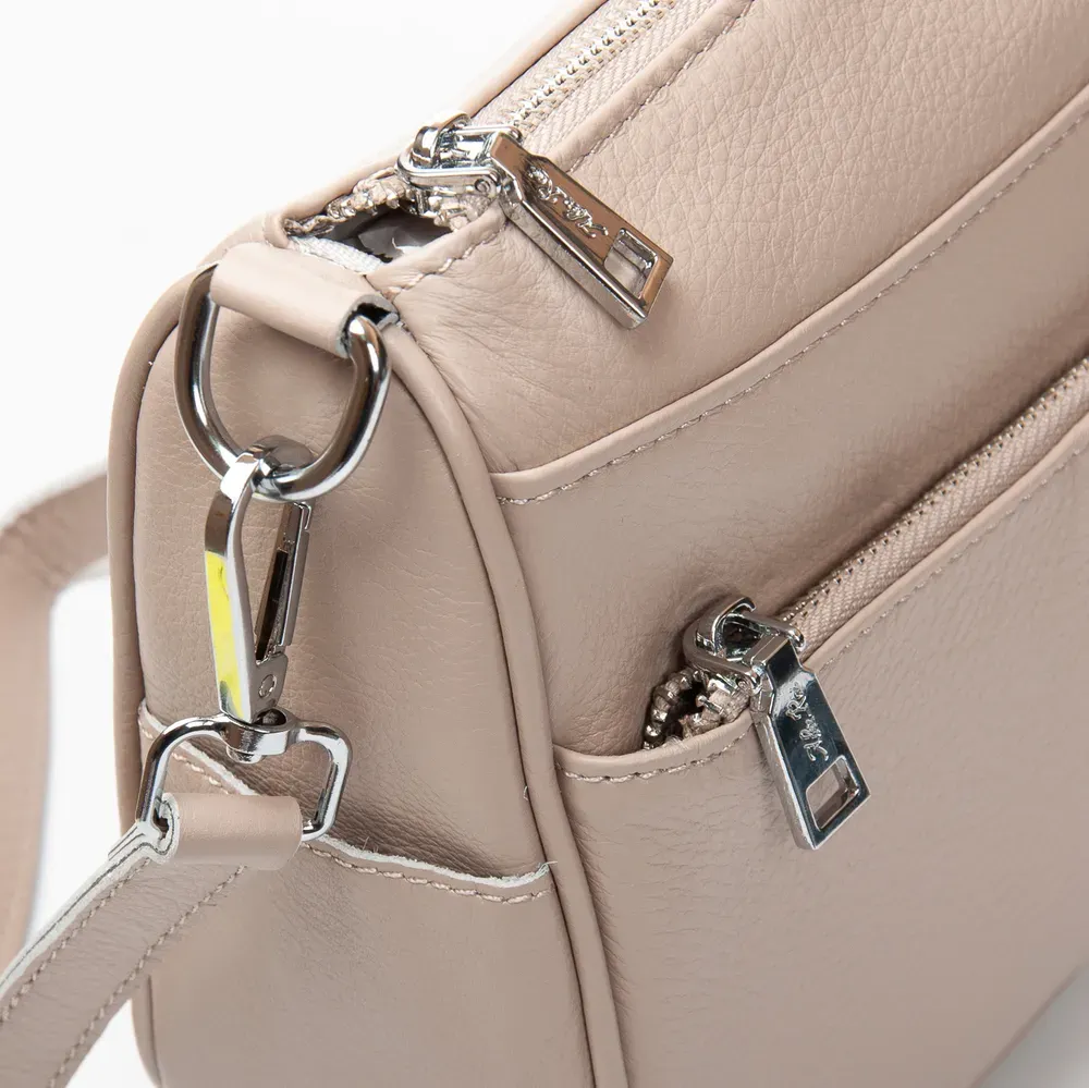 Жіноча шкіряна сумка Alex Rai. Виготовлена із натуральної щільної шкіри. Три відділення: центральне закривається на блискавку, а бічні магнітні кнопки. Всередині центрального відділення є відкрита кишеня і бічна кишеня на блискавці. Жорстке дно з металевими ніжками. У комплекті регульований плечовий ремінь. Розмір (см) 31*23*14, висота ручок 11 см.