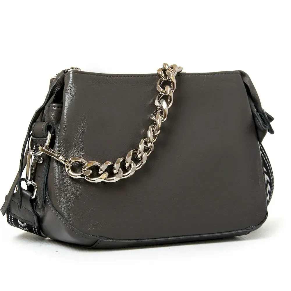 Жіноча сумочка Alex Rai. Виготовлена із натуральної м'якої шкіри. Три відділення, що закриваються на блискавку. Усередині центрального знаходиться відкрита кишеня і бічна кишеня на блискавці. На звороті розташована кишеня на блискавці. У комплекті регульований плечовий ремінь та ручка-ланцюжок.