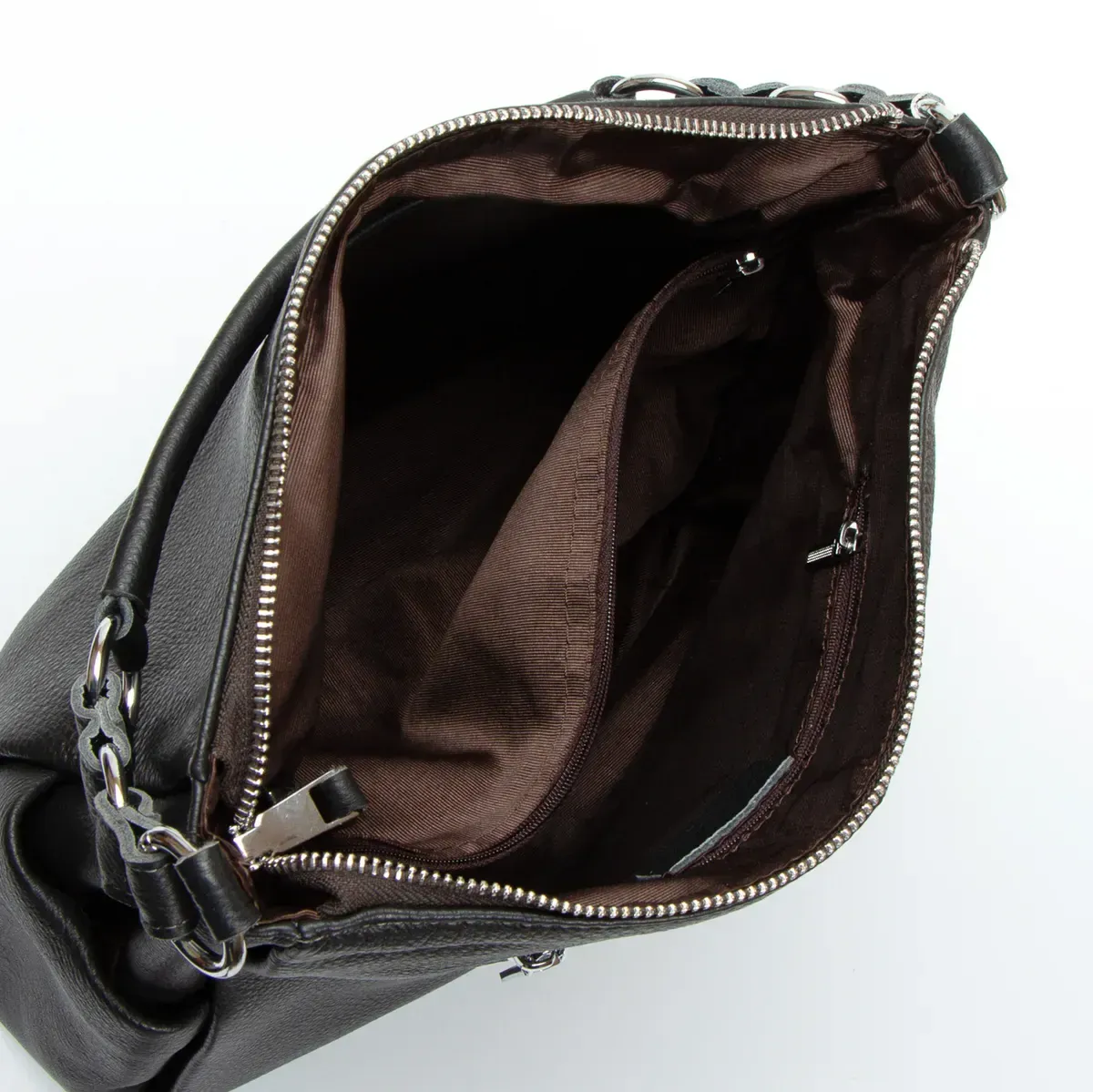 Жіноча шкіряна сумка Alex Rai. Виготовлена із натуральної м'якої шкіри. Закривається на блискавку. Усередині знаходиться подвійне відділення, розділене кишенею-перегородкою на блискавці, відкрита бічна кишеня та кишеня на блискавці. Зовні сумки на звороті знаходяться кишеню на блискавці, а на торцях невеликі відкриті кишені. Ущільнене дно.