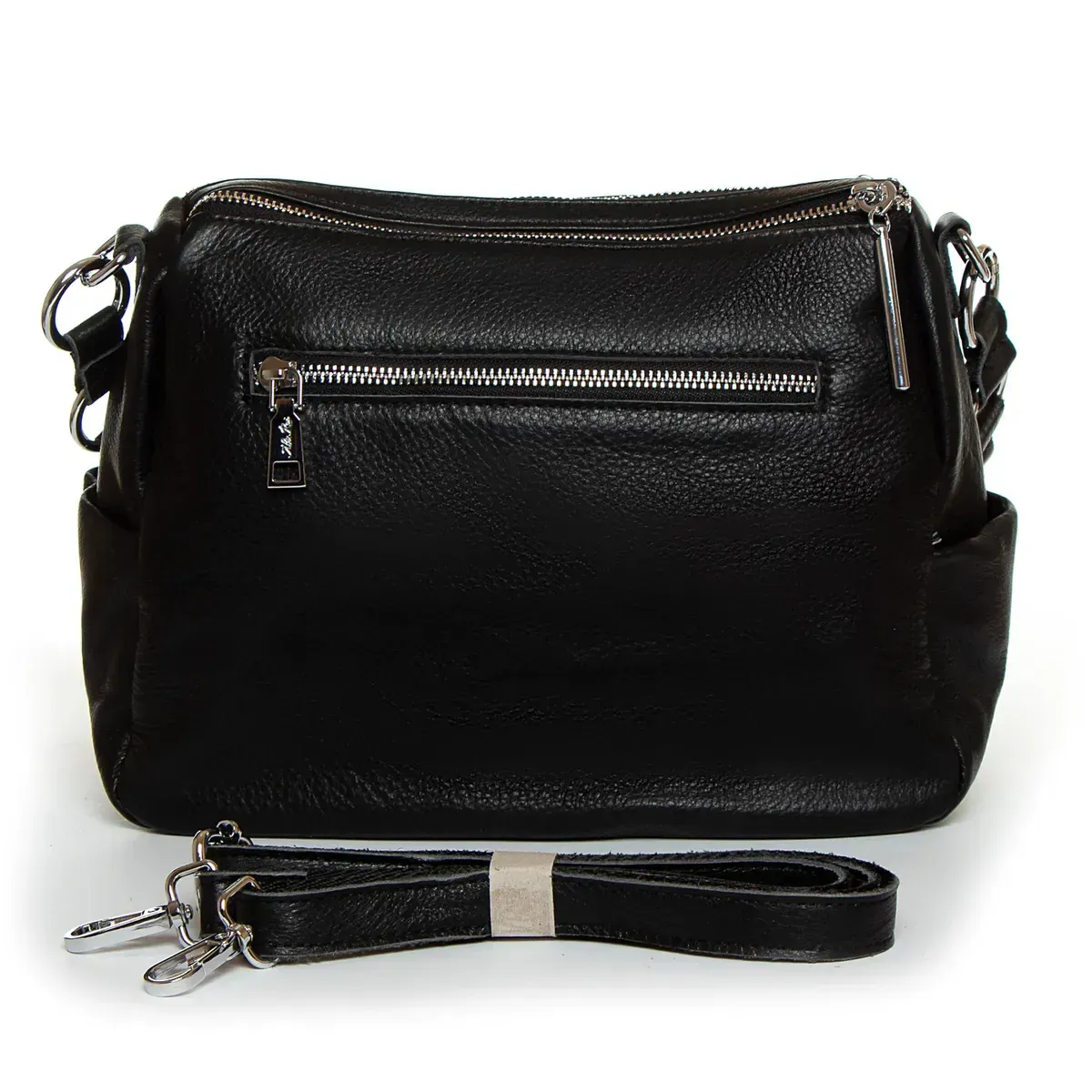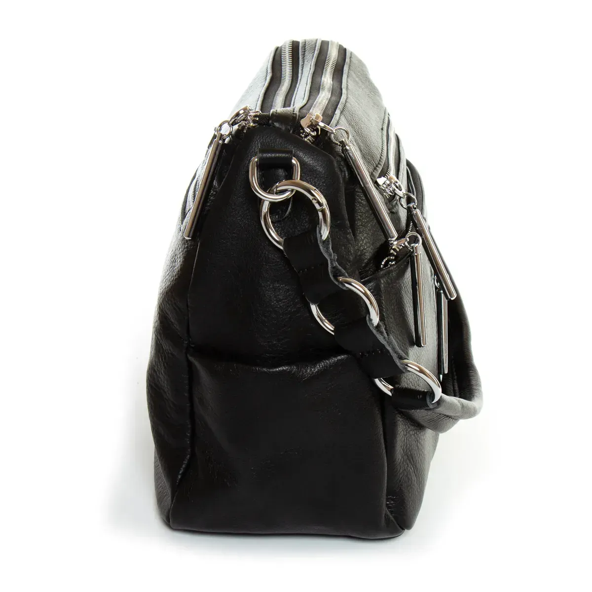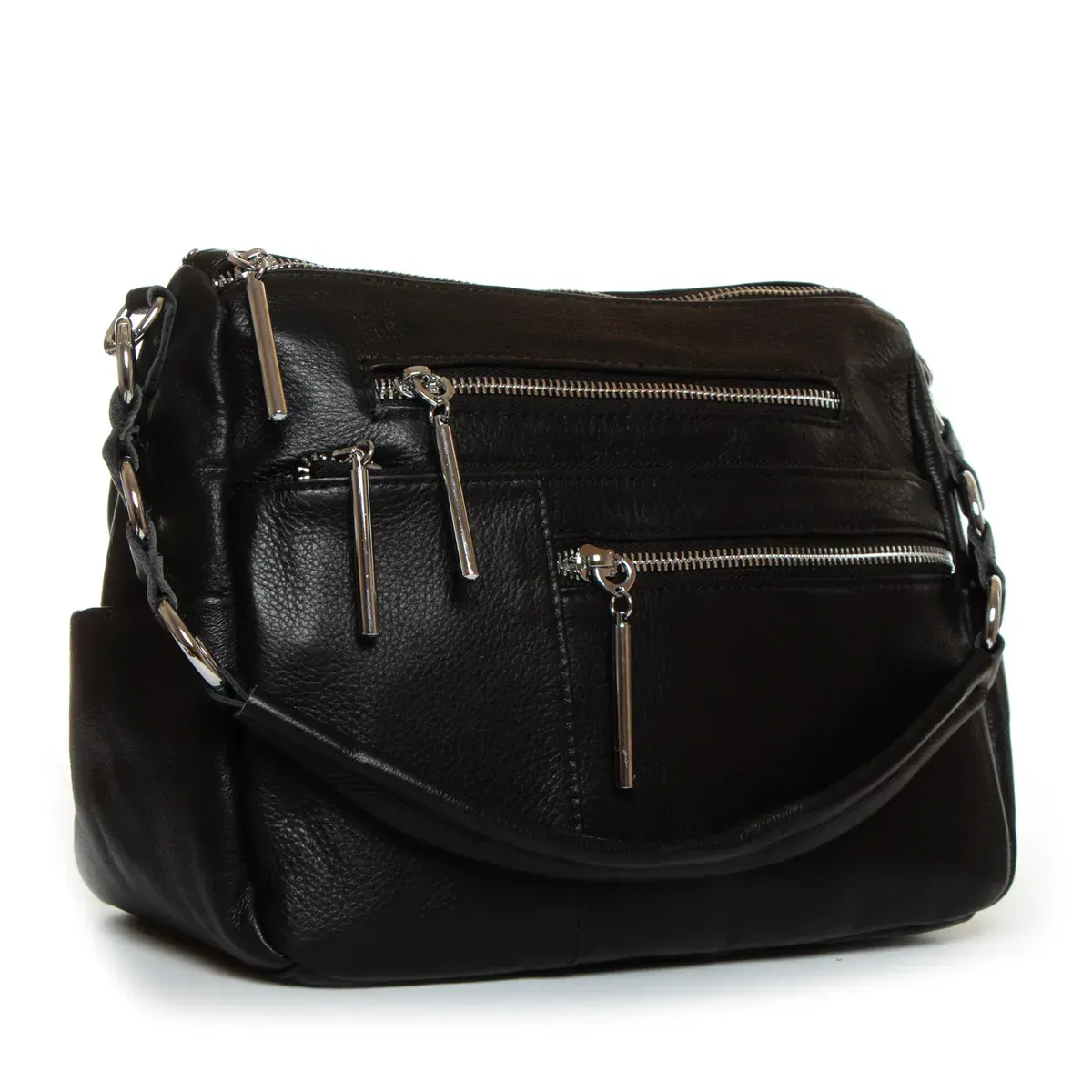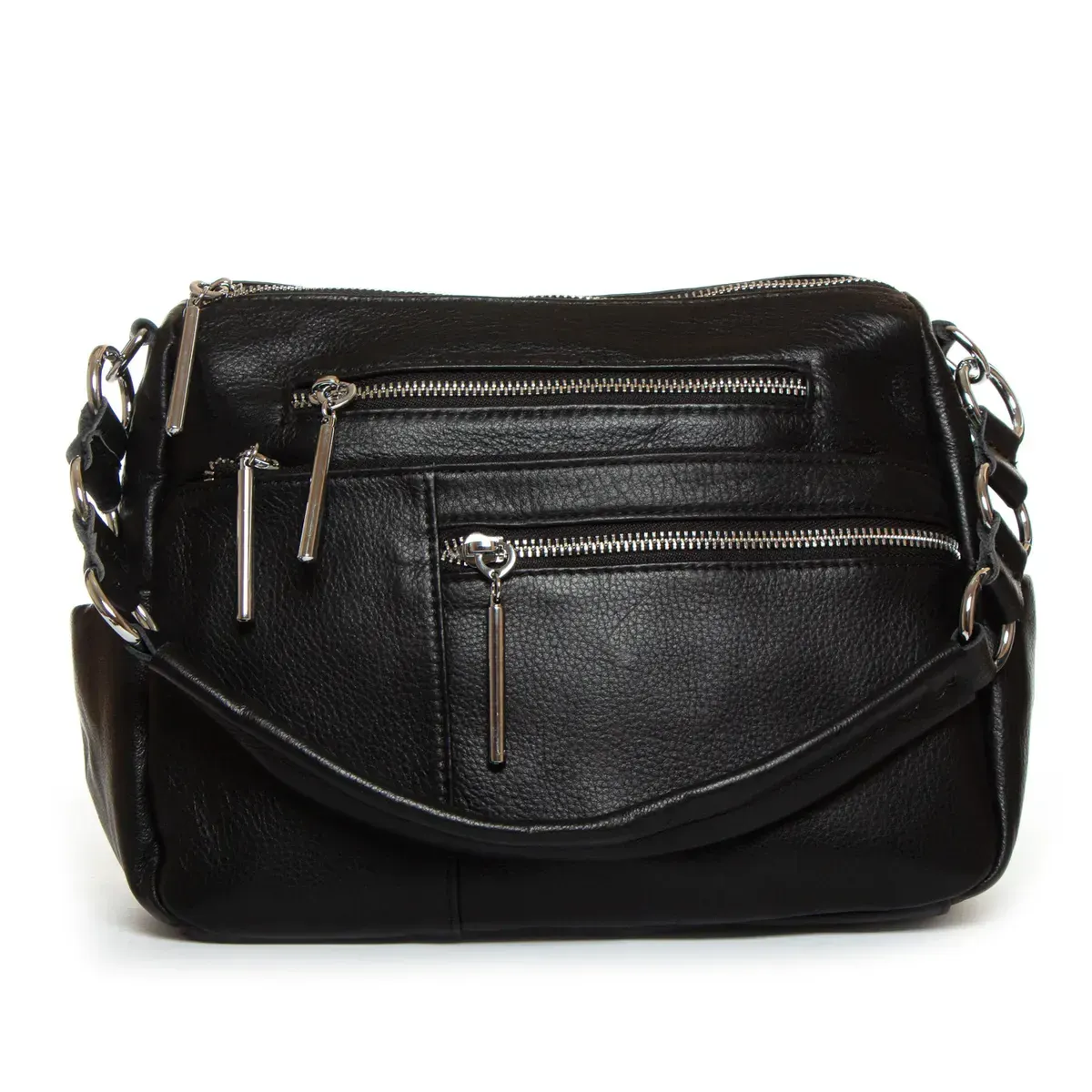 Жіноча шкіряна сумка Alex Rai. Виготовлена із натуральної м'якої шкіри. Два відділення, що закриваються на блискавці. Усередині відділень знаходяться бічна відкрита кишеня та кишеня на блискавці. Зовні сумки, на фасаді розташовані чотири кишені на блискавці та на фасаді одна кишеня. На торцях сумки є невеликі відкриті кишені. Ущільнене дно.