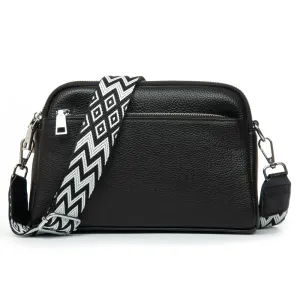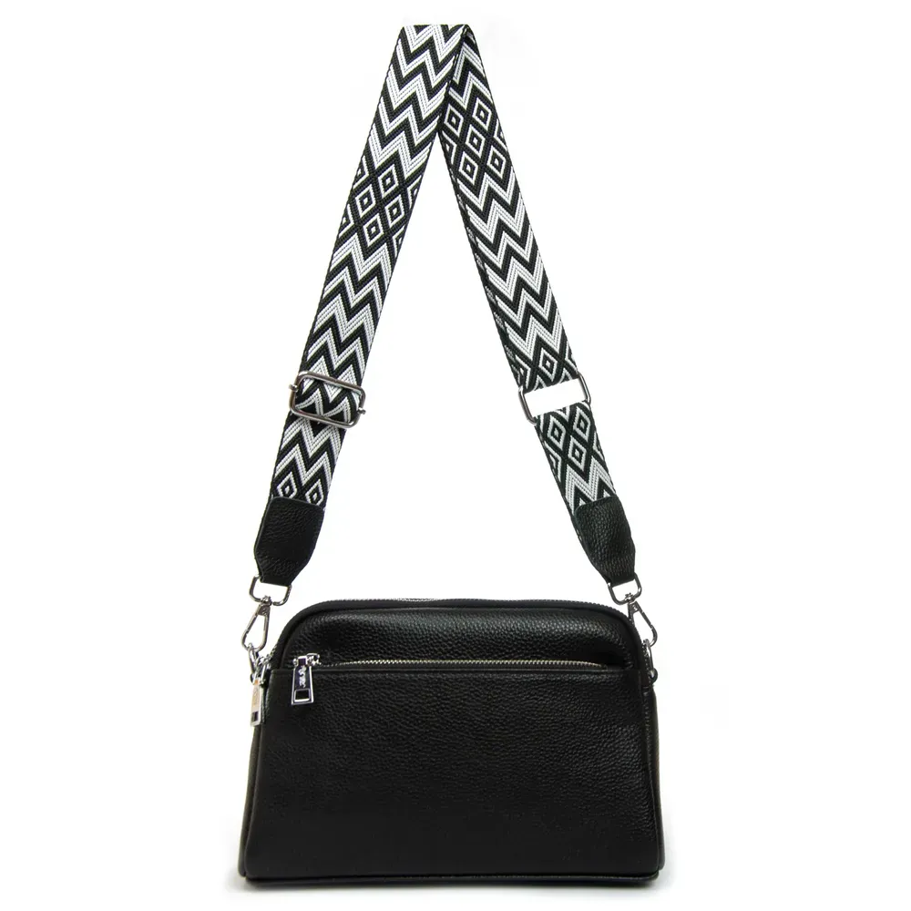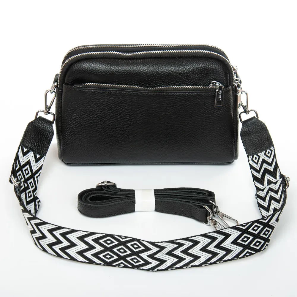 В комплекте регулируемый кожаный плечевой ремень и текстильный ремень.
