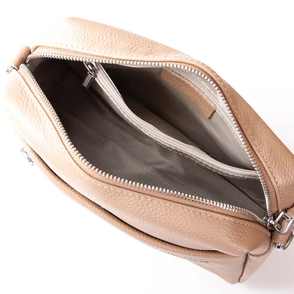 Закрывается на молнию. Внутри находится двойное отделение, разделенное карманом-перегородкой на молнии, открытый карман и боковой карман на молнии. Снаружи сумки на фасаде и обратной стороне есть открытые плоские карманы.