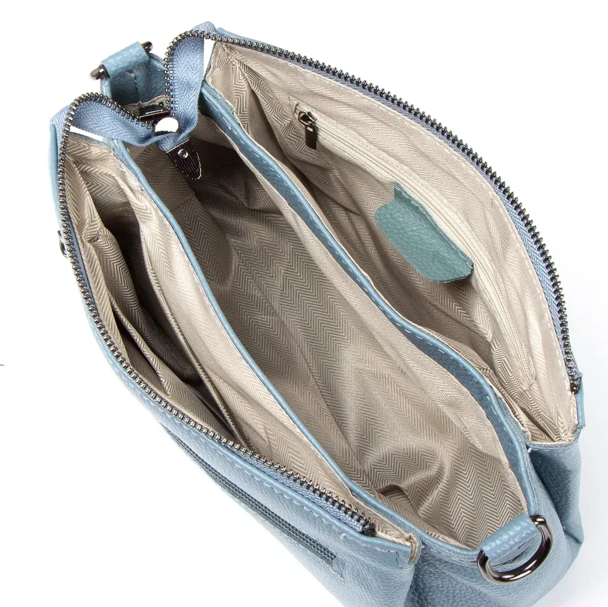 Жіноча шкіряна сумка Alex Rai. Виготовлена із натуральної м'якої шкіри. Закривається на блискавку. Усередині знаходяться три відділення. Усередині відділень є бічна кишеня на блискавці та відкрита кишеня. Зовні сумки на звороті знаходиться кишеня на блискавці. Ущільнене дно.