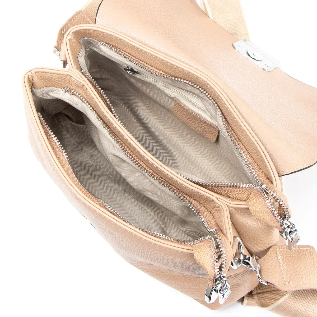 Жіноча шкіряна сумка Alex Rai. Виготовлена із натуральної м'якої шкіри. Під клапаном знаходяться два відділення, які додатково закриваються на блискавці. Усередині відділень є бічна кишеня на блискавці та відкрита кишеня. Зовні сумки на звороті знаходиться кишеня на блискавці. Клапан закривається на магніт. Ущільнене на металевих ніжках.