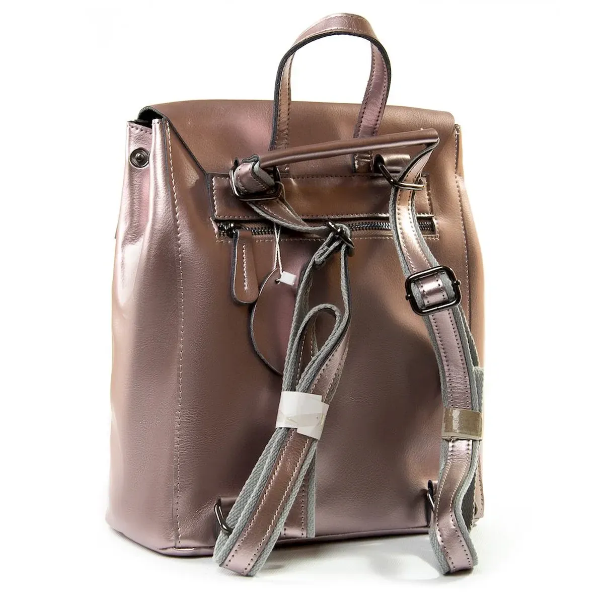 Жіночий шкіряний рюкзак. Виготовлений з натуральної щільної шкіри. Можна носити на плечі на ремені, що регулюється. Під клапаном додатково закривається на блискавку. Усередині знаходиться основне та додаткове відділення, розділене кишенею-перегородкою на блискавці, подвійна відкрита кишеня та кишеня на блискавці. Зовні на звороті розташована кишеня на блискавці. Плечові лямки регулюються за довжиною.
