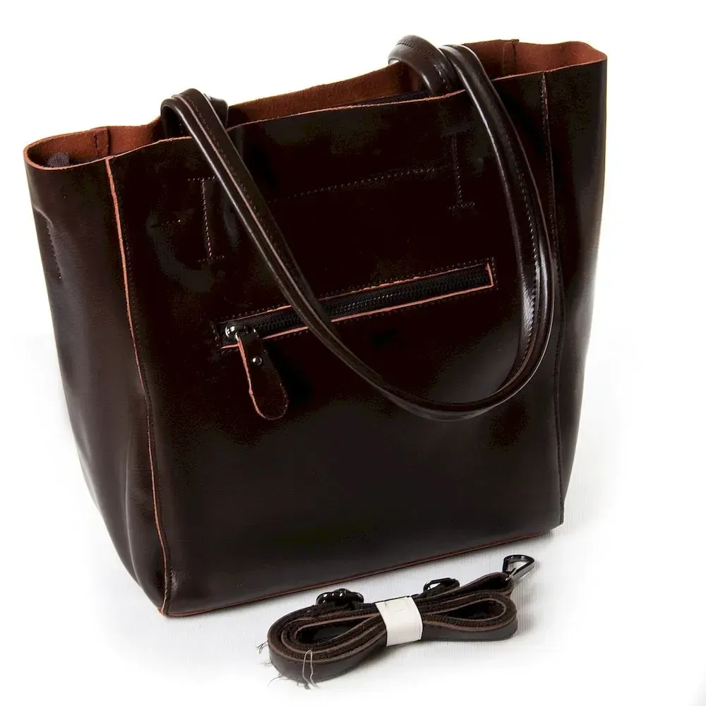 Жіноча сумка. Виготовлена із натуральної шкіри. Закривається на блискавку. Усередині знаходиться подвійне відділення, розділене кишенею-перегородкою на блискавці, подвійна відкрита кишеня та кишеня на блискавці на внутрішніх стінках сумки. На звороті є кишеня на блискавці. Сумка має жорстке дно. У комплекті регульований плечовий ремінь. Розмір (см) 33*30*13, висота ручок 22 см.
