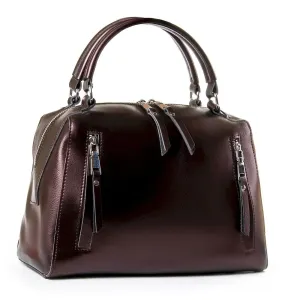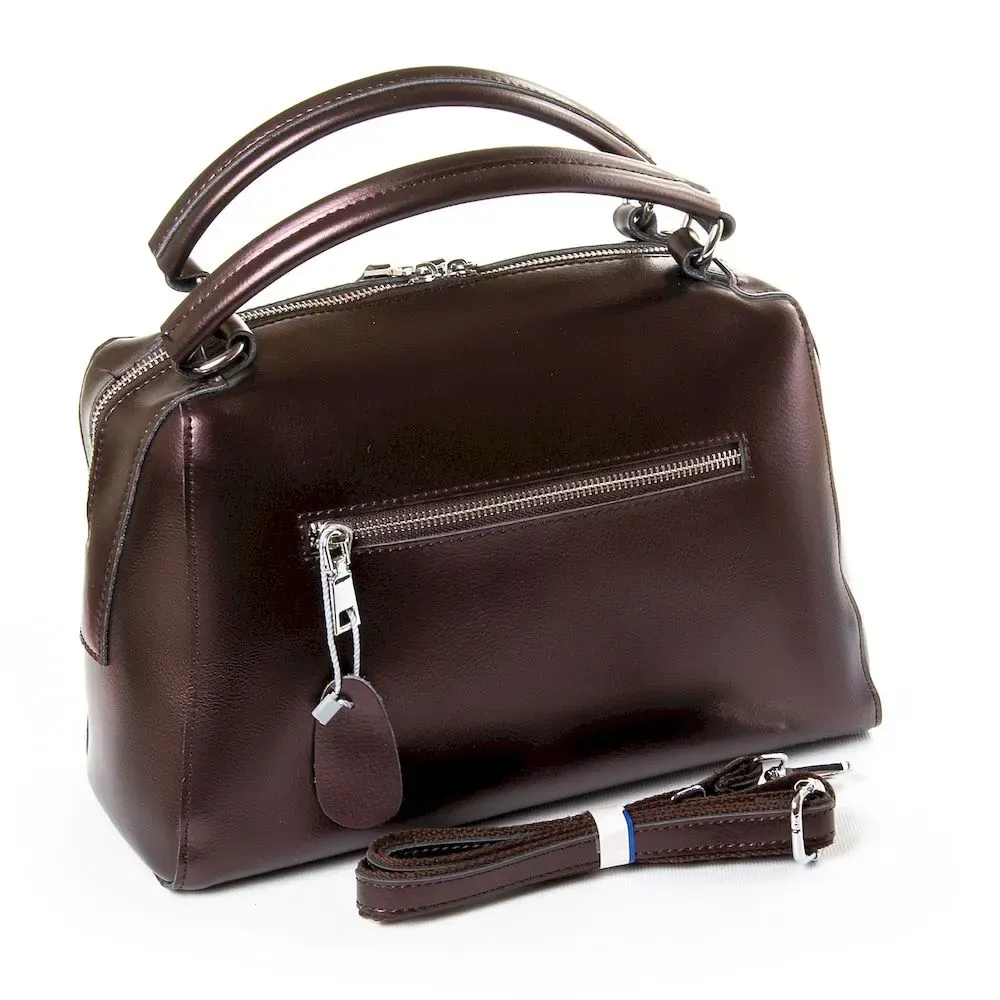 Жіноча сумка. Виготовлена із натуральної щільної шкіри. Закривається на блискавку. Усередині знаходиться основне та додаткове відділення розділене кишенею-перегородкою на блискавці, відкрита кишеня та бічна кишеня на блискавці. На фасаді та на звороті є кишені на блискавці. У комплекті регульований плечовий ремінь.